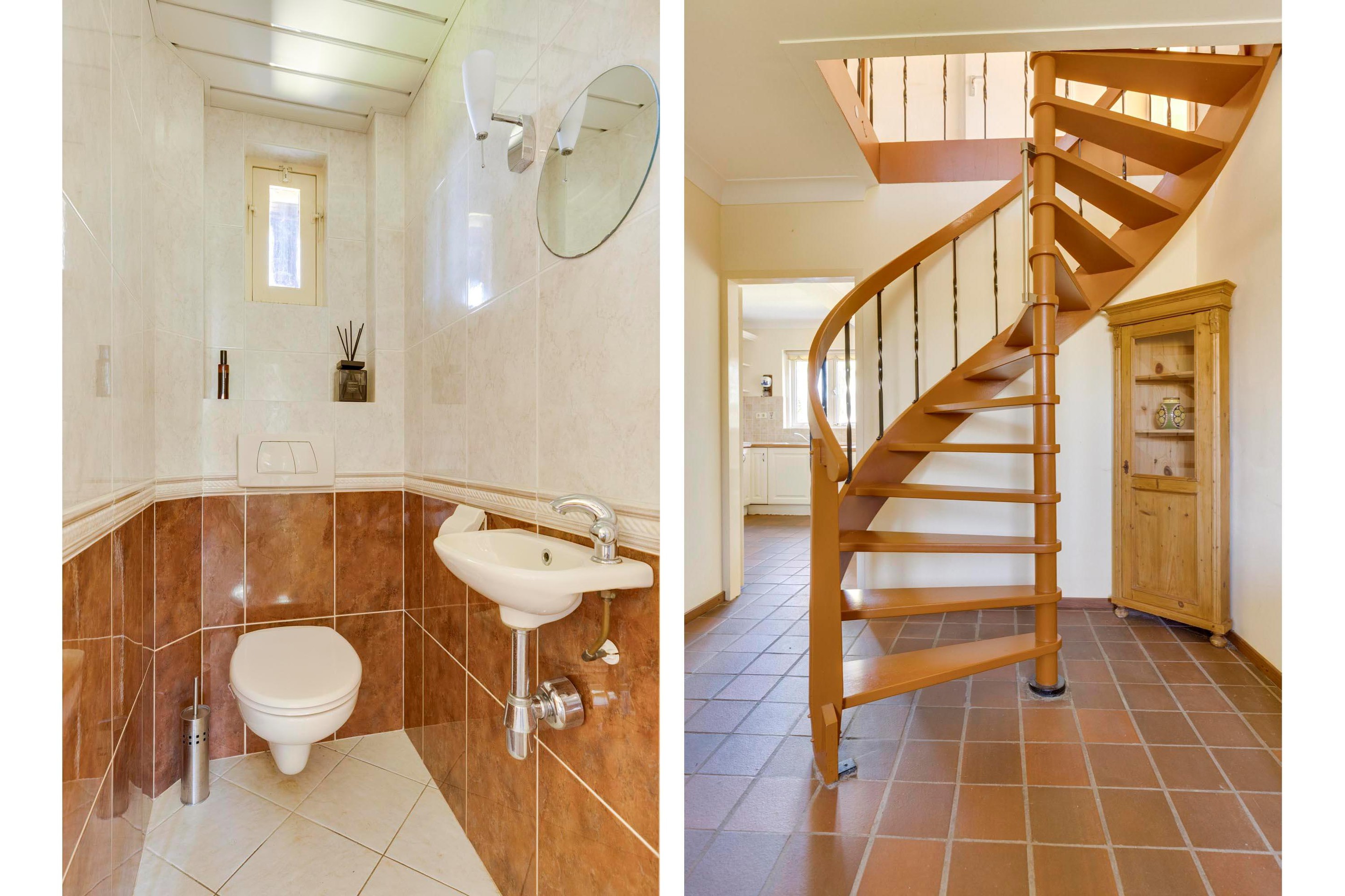 naar de verdieping en de toiletruimte. Het toilet is volledig betegeld en voorzien van een