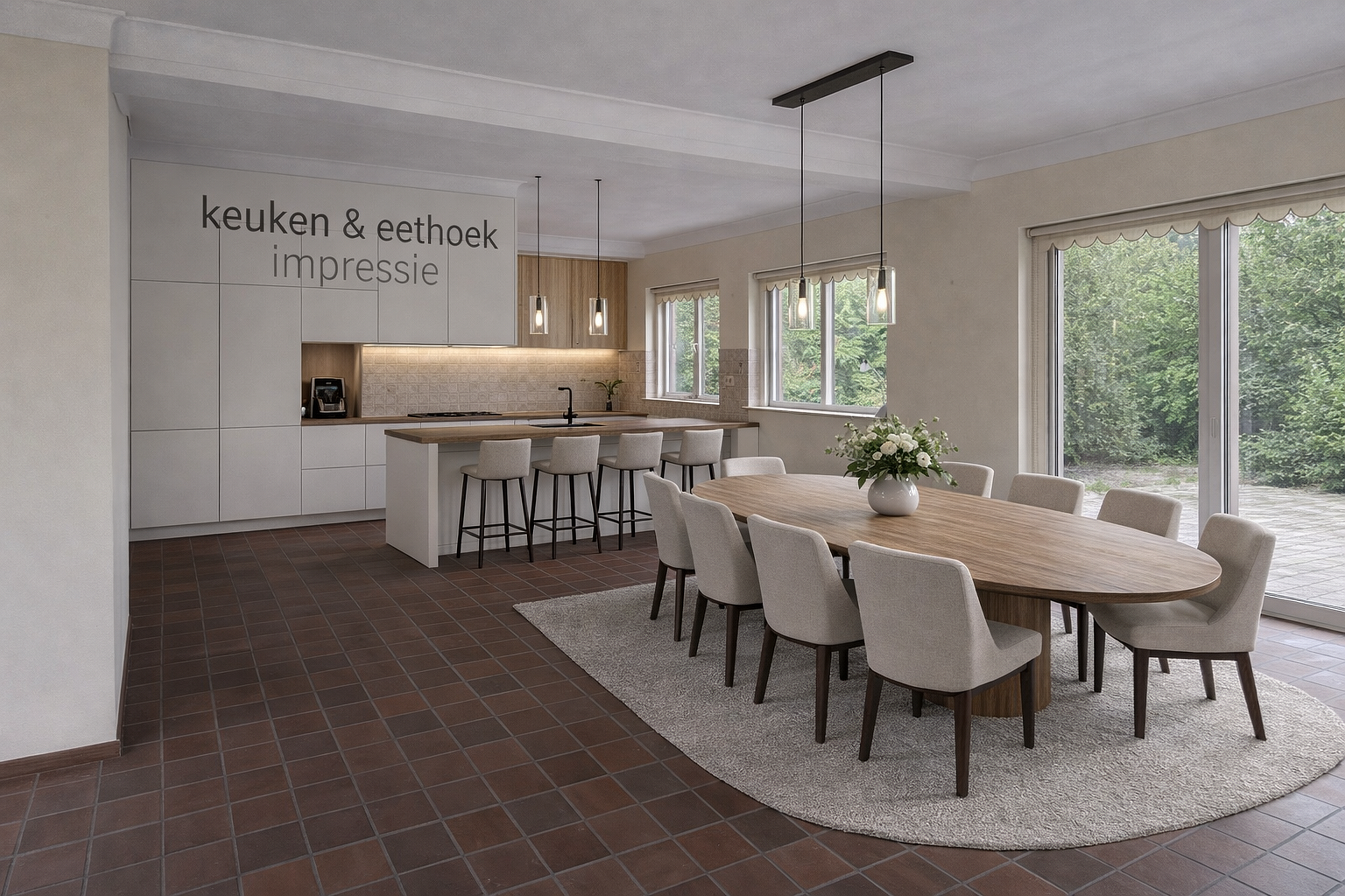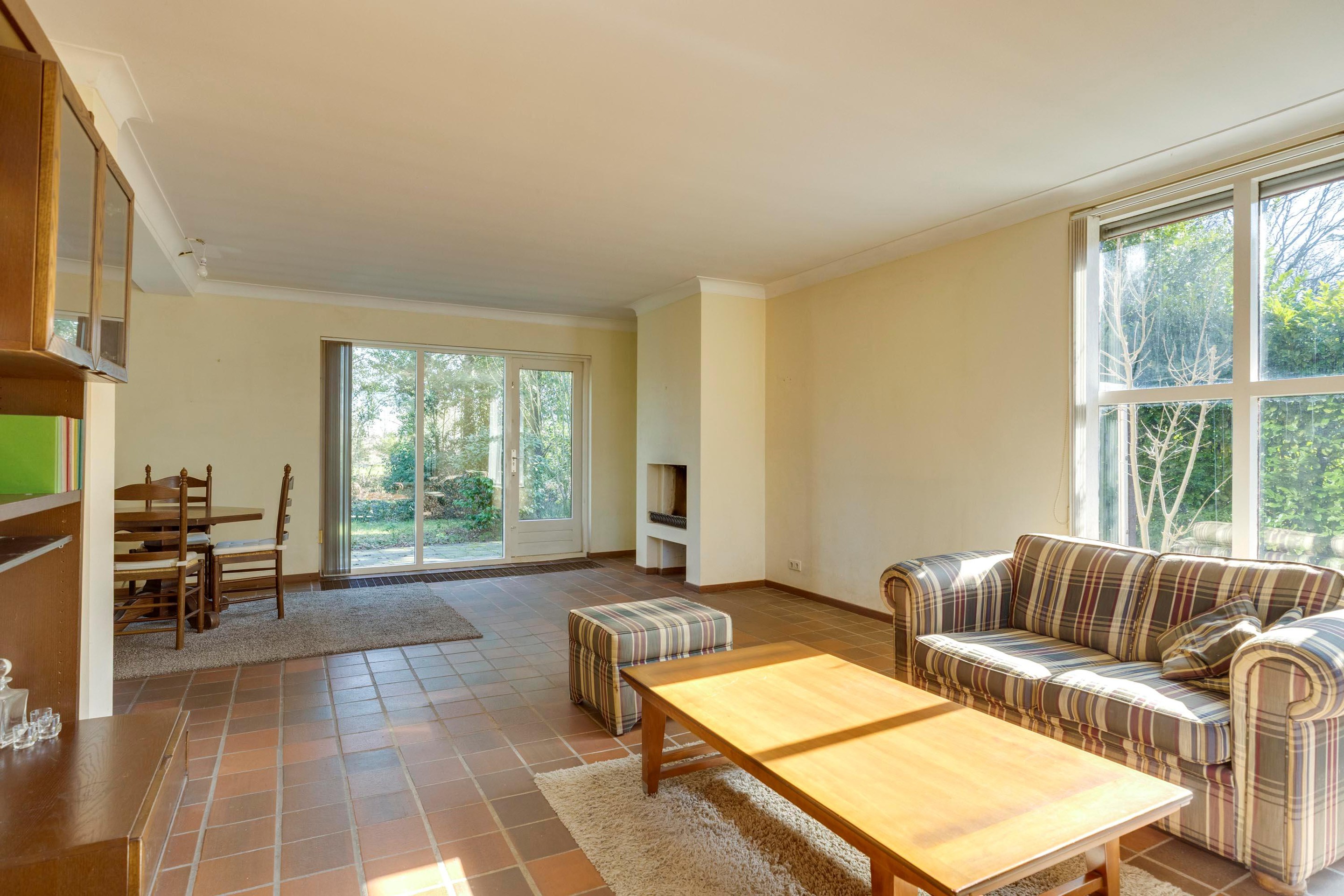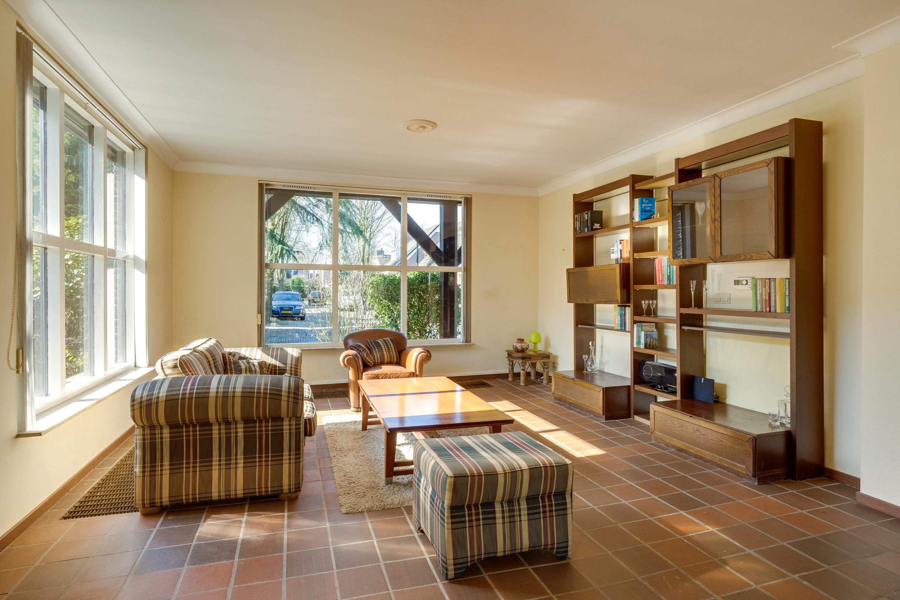 De ruime woonkamer wordt gekenmerkt door grote raampartijen die zorgen voor veel daglicht.