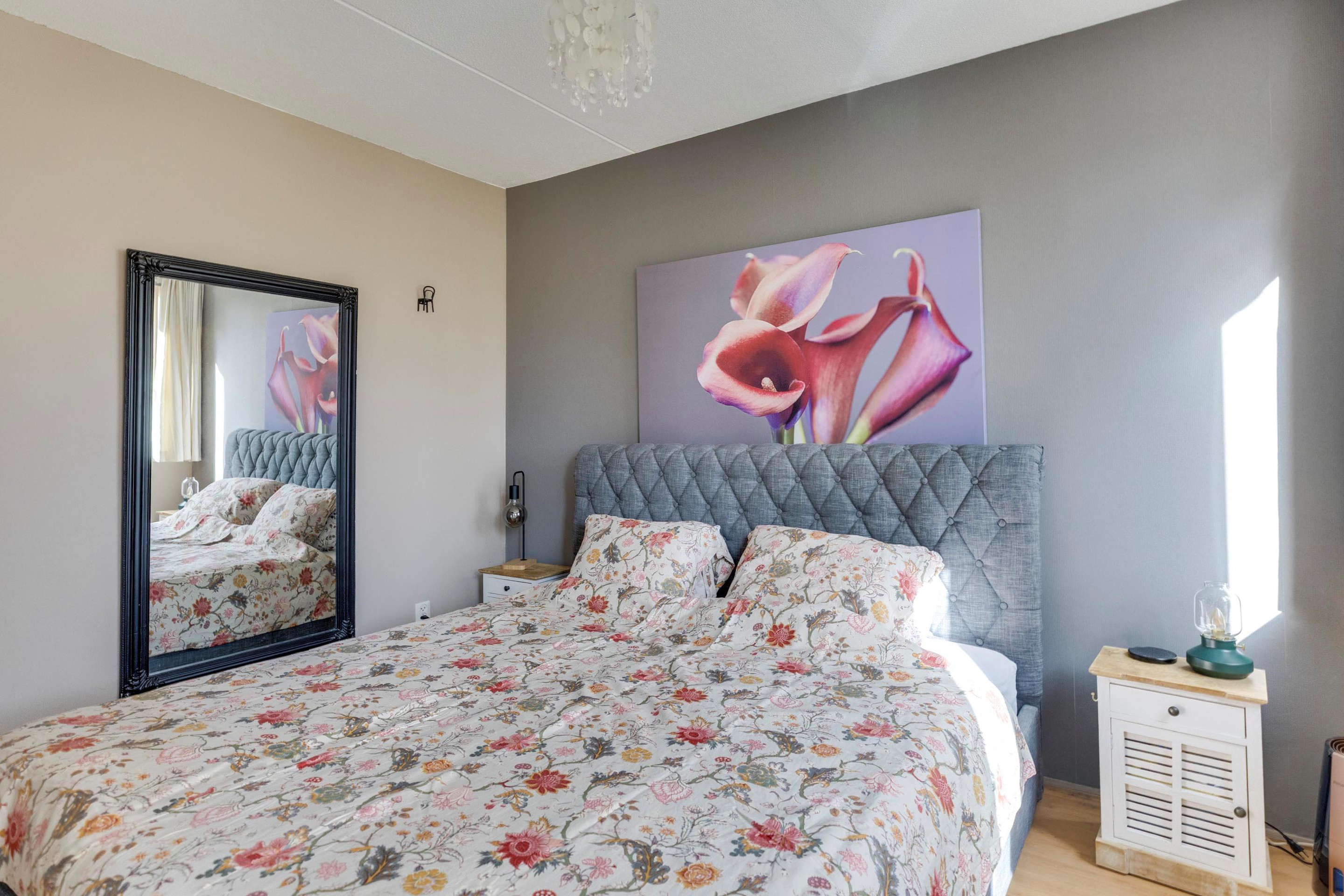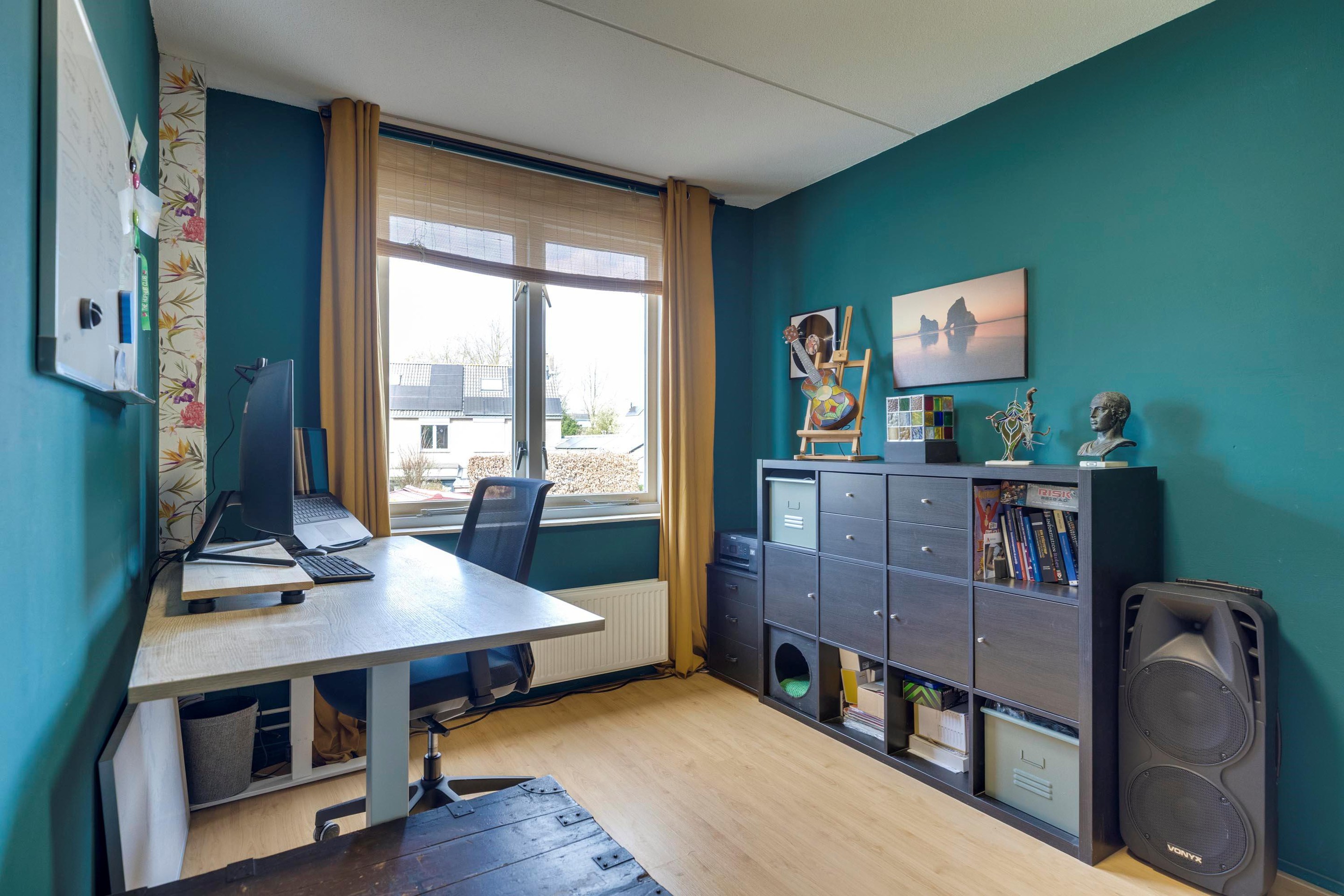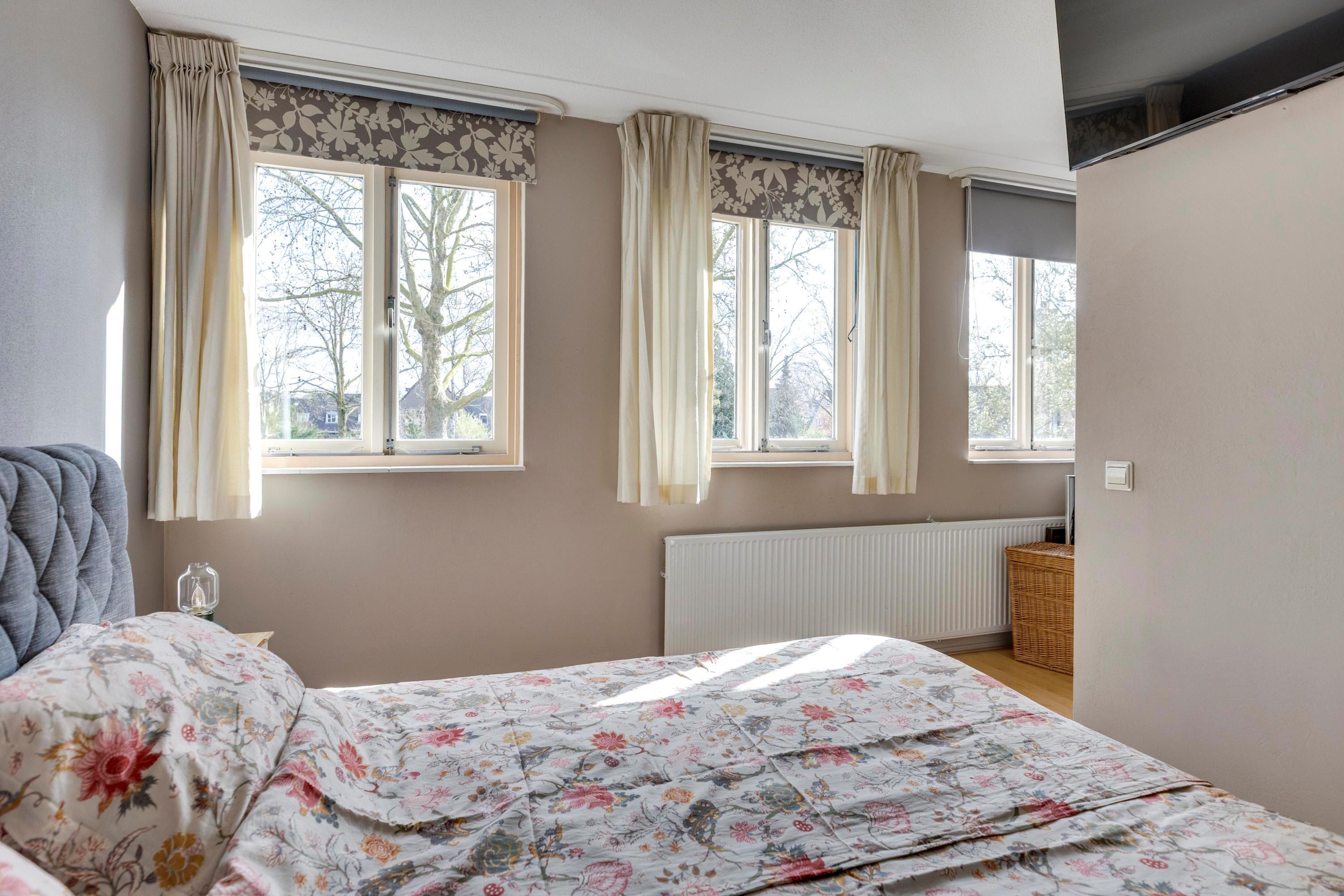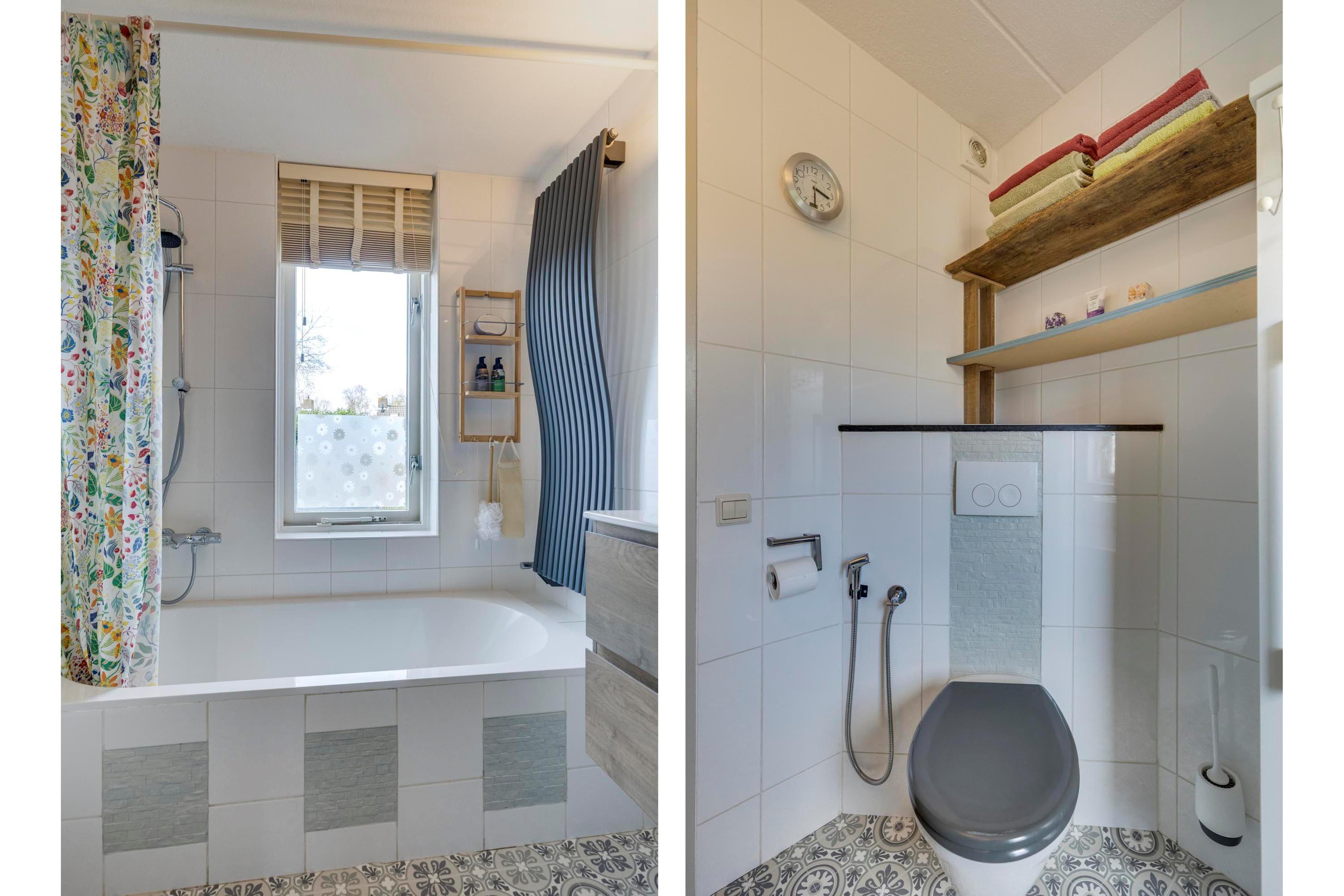 De tweede, eveneens royale slaapkamer is gelegen aan de achterzijde en beschikt ook over een laminaatvloer. De wanden zijn hier deels afgewerkt met behang en deels gestuct. De grote kunststof dakkapel zorgt voor extra ruimte en een mooi uitzicht op de tuin. Daarnaast zijn er praktische bergkasten gecreëerd, wat zorgt voor extra opberggemak. De derde slaapkamer is eveneens keurig afgewerkt met een laminaatvloer en gestucte wanden. De badkamer is volledig betegeld en uitgevoerd met een ligbad met regendouche met thermostatische kraan (Grohe 2025), een vrijdragend toilet en een badmeubel met vaste wastafel. Tevens is de badkamer voorzien van een designradiator, mechanische ventilatie en een extra opbergmeubel.