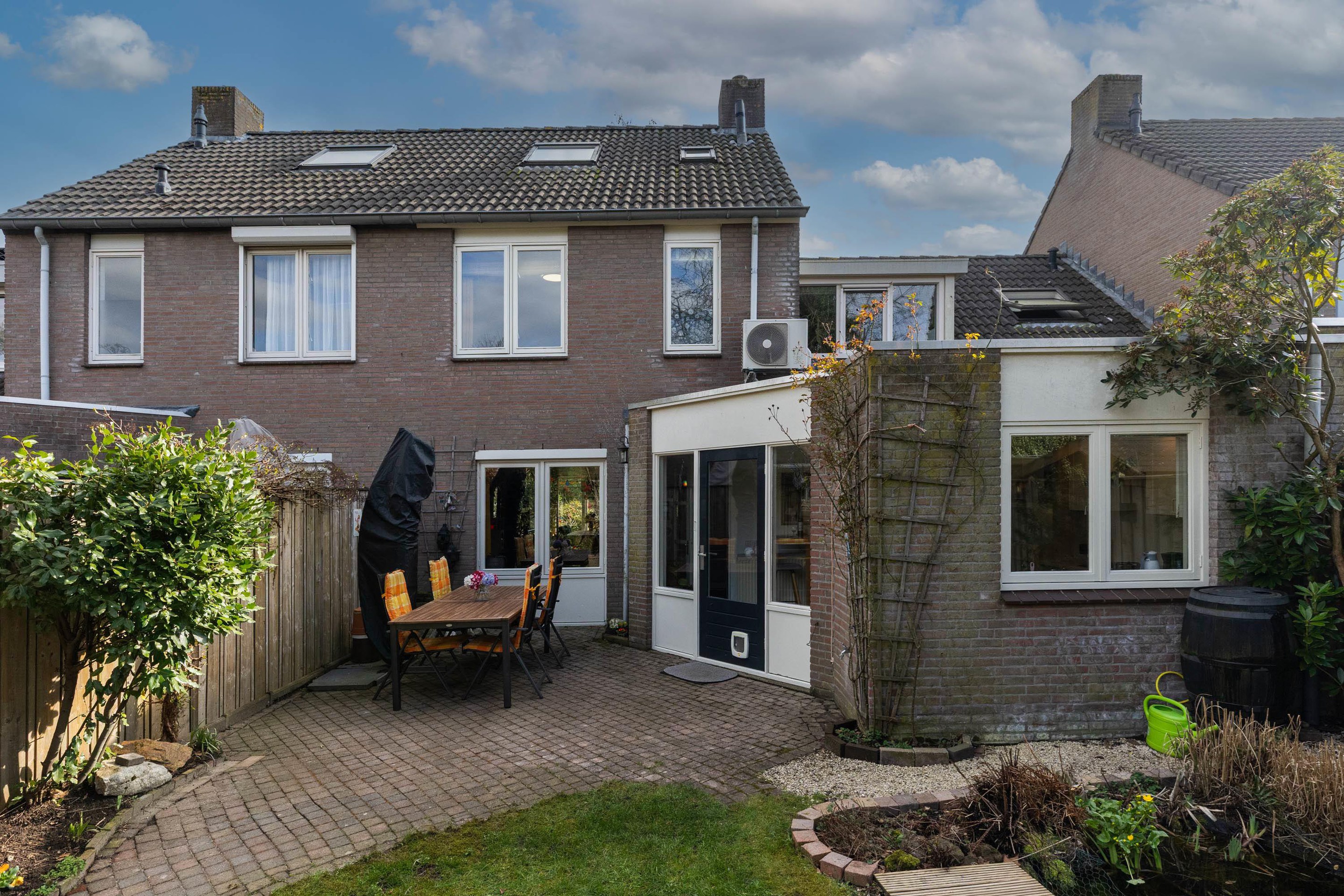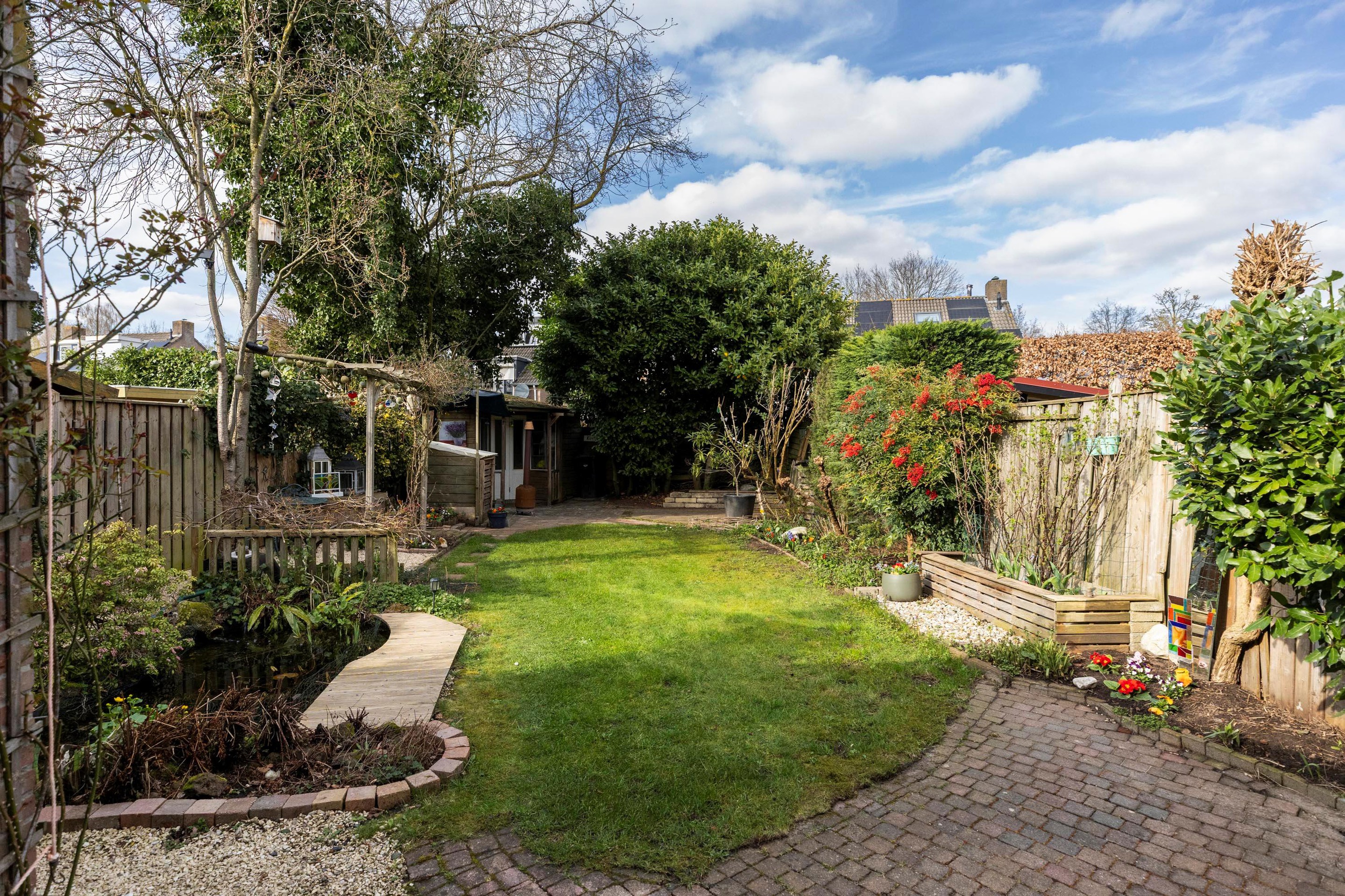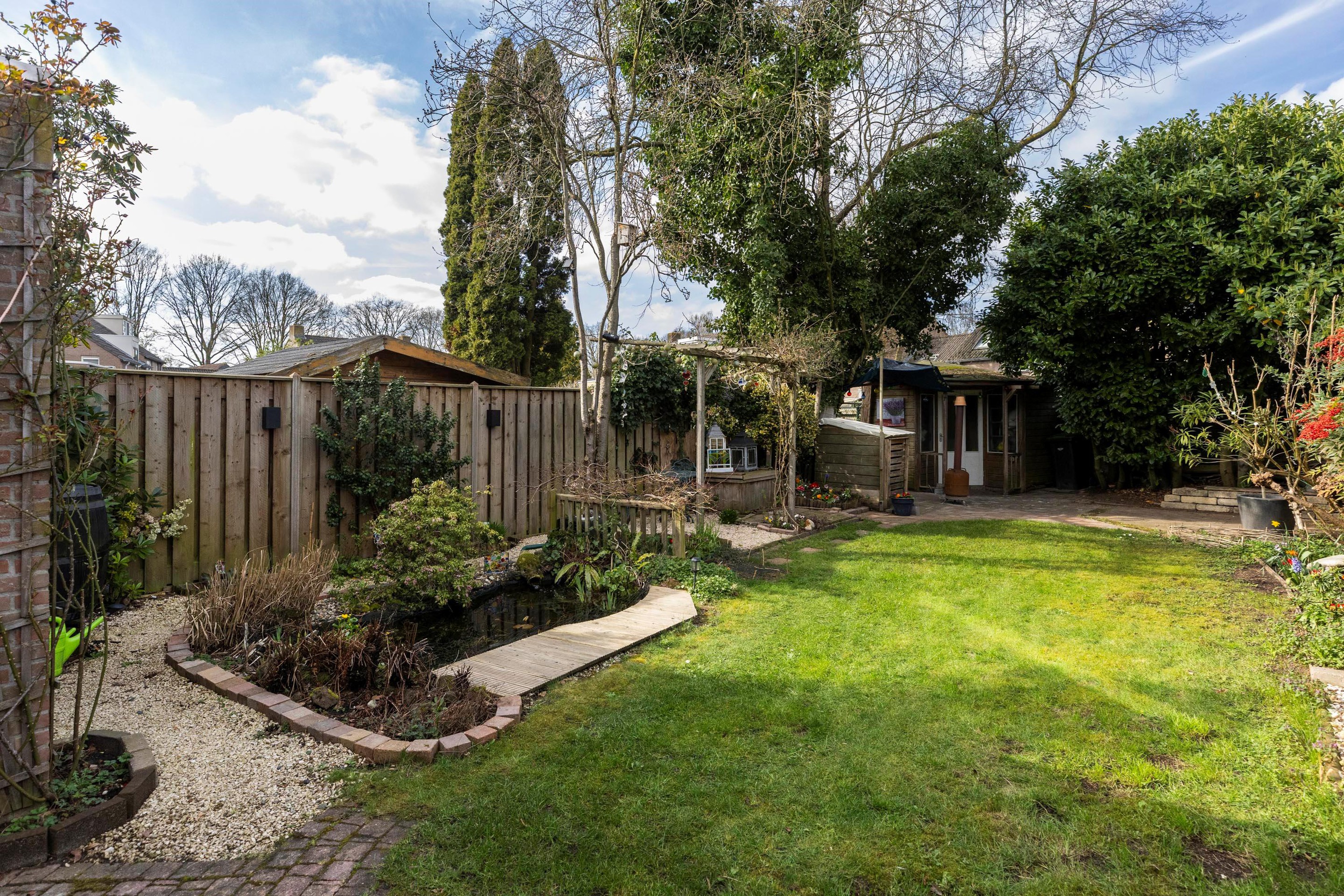 Tuin De royale privacy biedende achtertuin is verzorgd aangelegd. Direct aan de woning bevindt zich een groot terras, verder is de tuin ingericht met een speelgazon, borders met vaste beplanting, vijverpartij, pergola en achter in de tuin bevind zich een tweede terras en houten tuinhuis voor extra opbergmogelijkheden, tevens zijn er in de tuin op verschillende plekken stroomvoorzieningen.