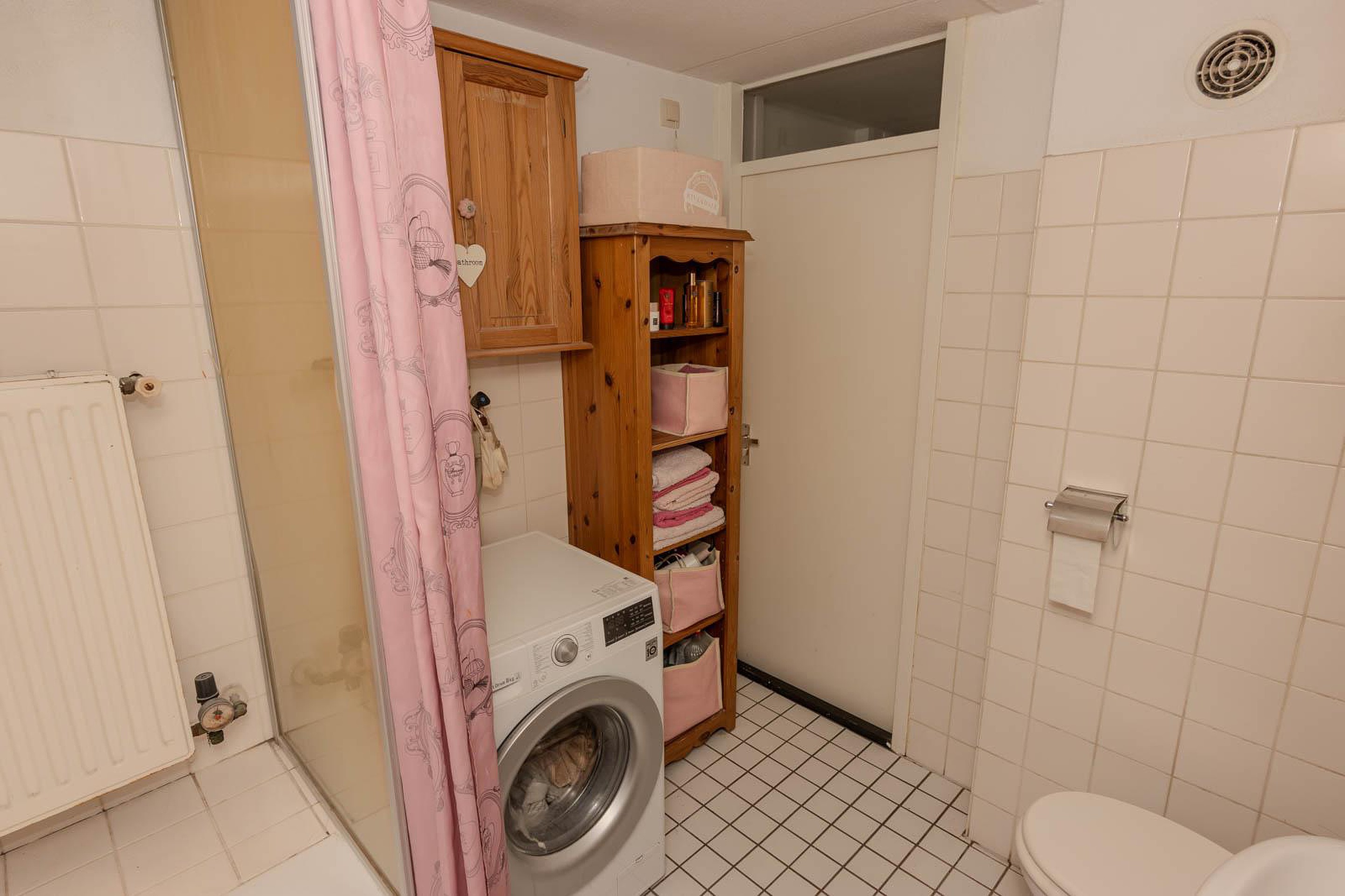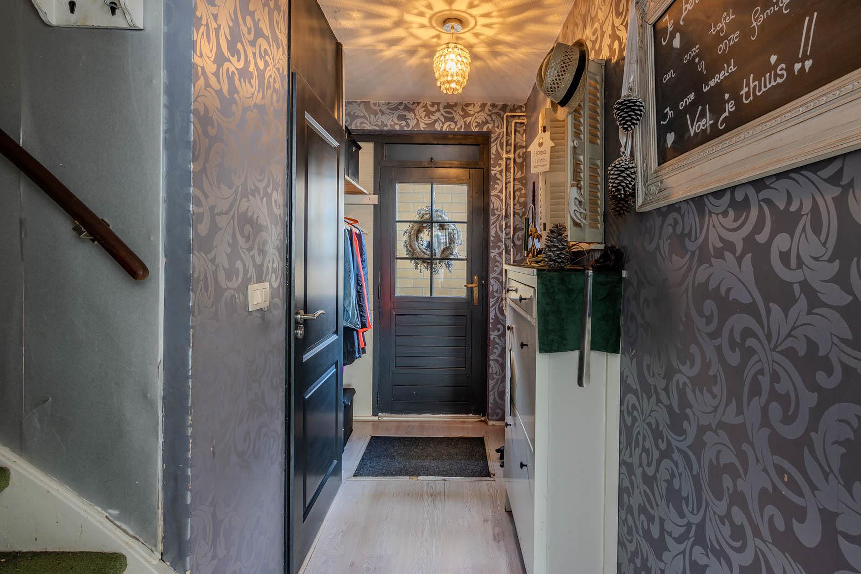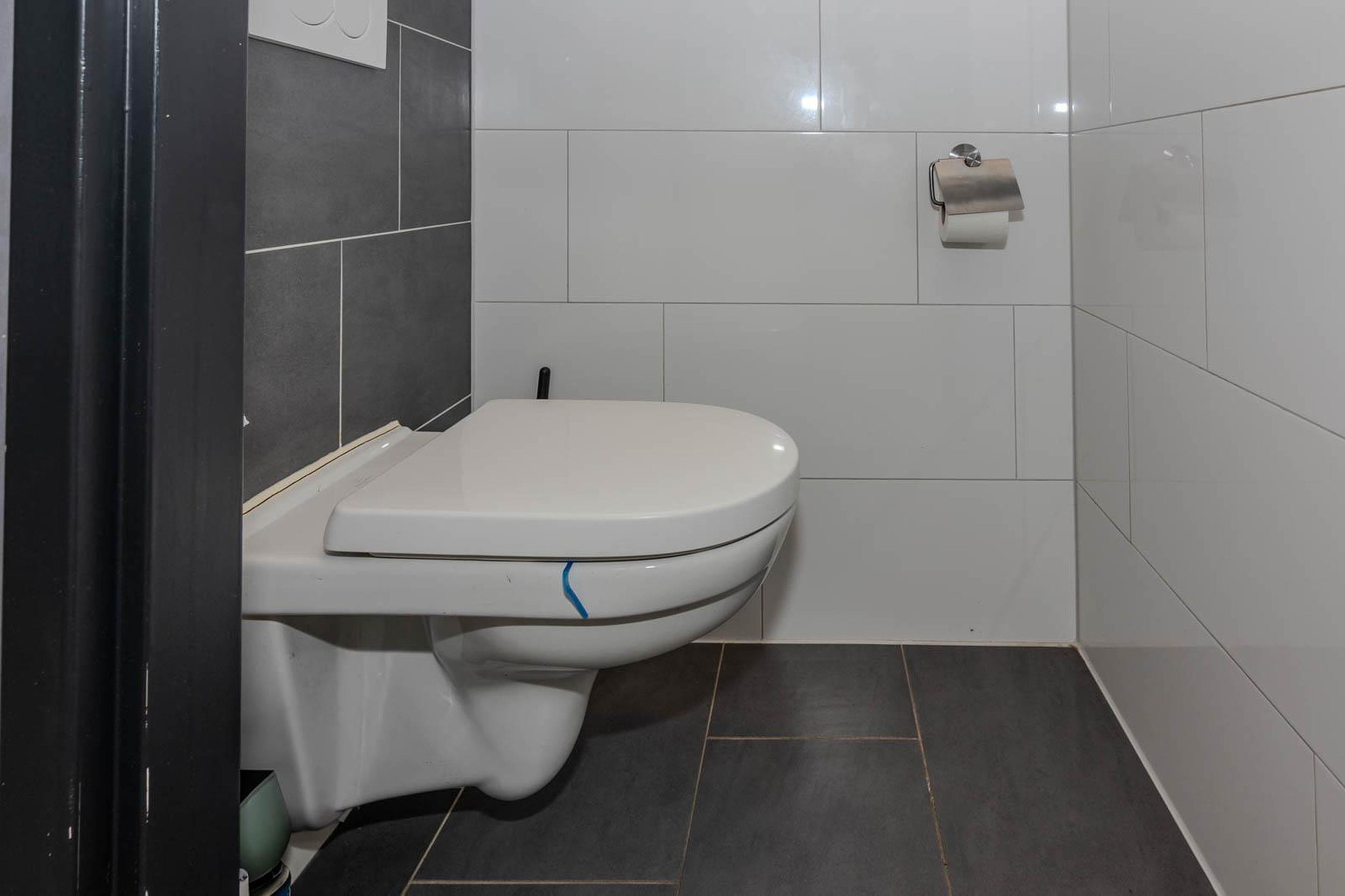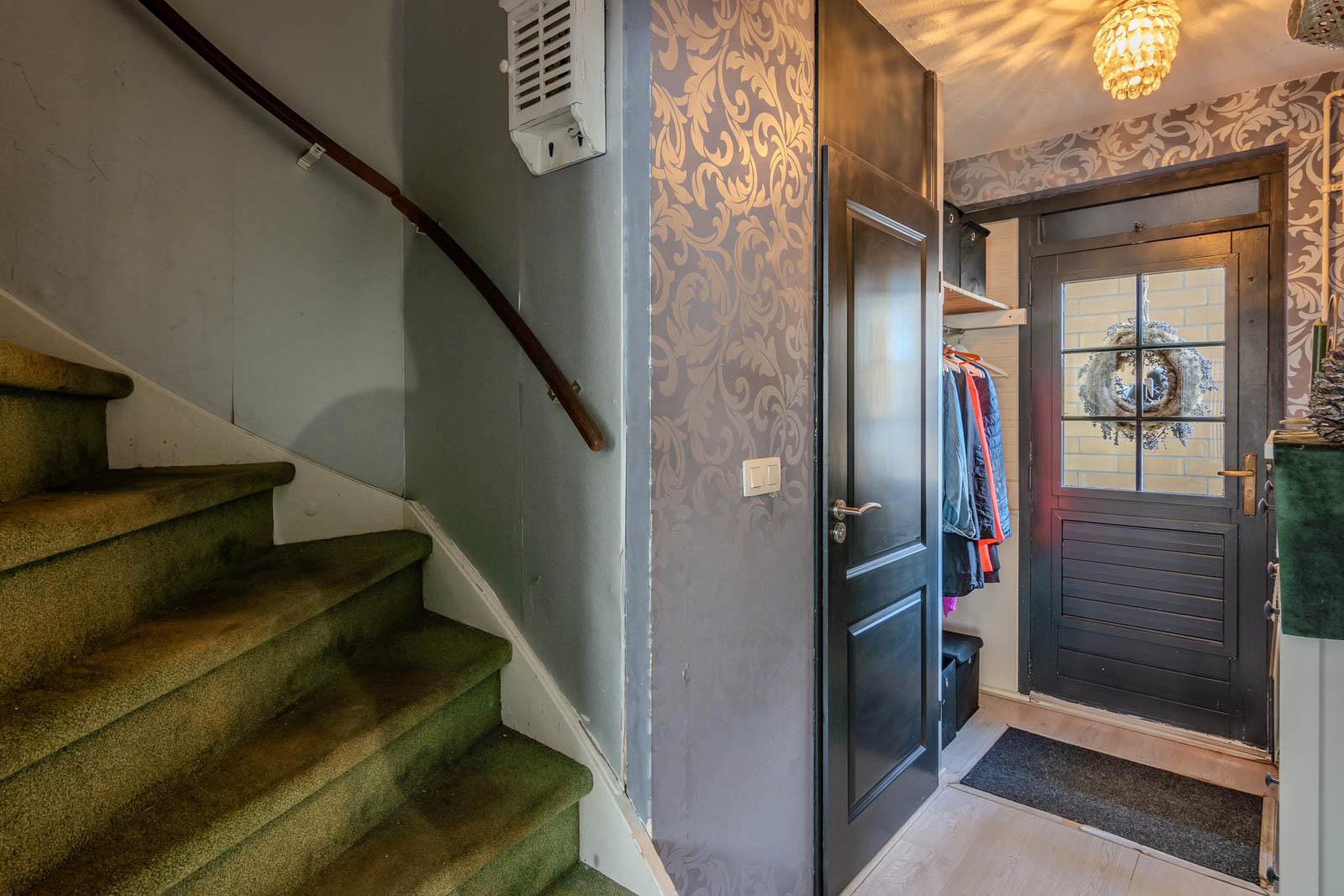 Na de voortuin met stenen berging kom je binnen in de entree, waar plaats is voor een garderobe en de meterkast zich bevindt. Hier vind je ook het moderne toilet (2019), volledig betegeld, met zwevend closet, verlaagd plafond en inbouwspotjes. Via de hal bereik je de trapopgang en de woonkamer.