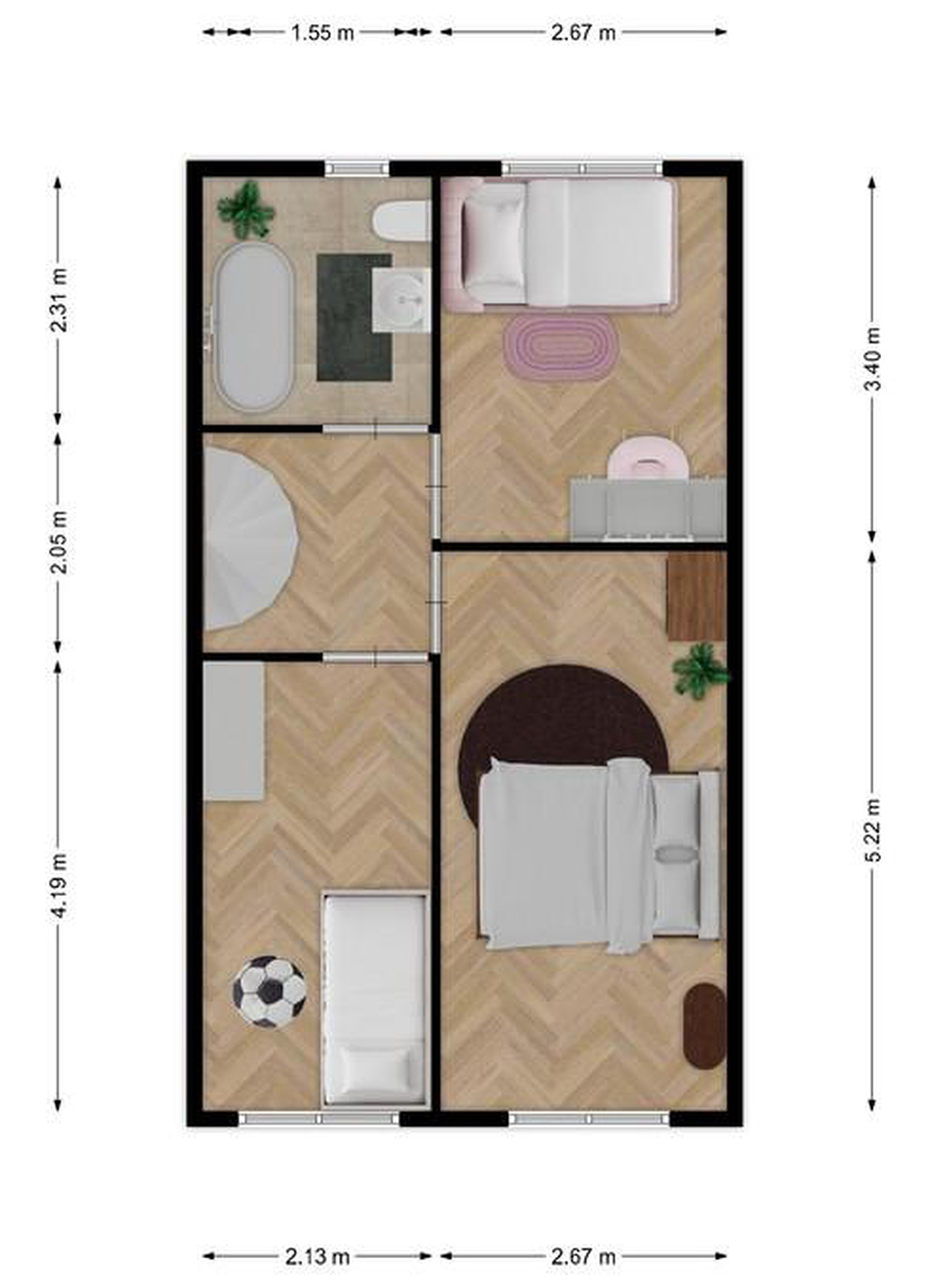 Op de eerste verdieping zijn drie slaapkamers te vinden, allen voorzien van rolluiken. De badkamer is praktisch ingedeeld en beschikt over een ligbad, wastafel met meubel, toilet en wasmachine aansluiting.