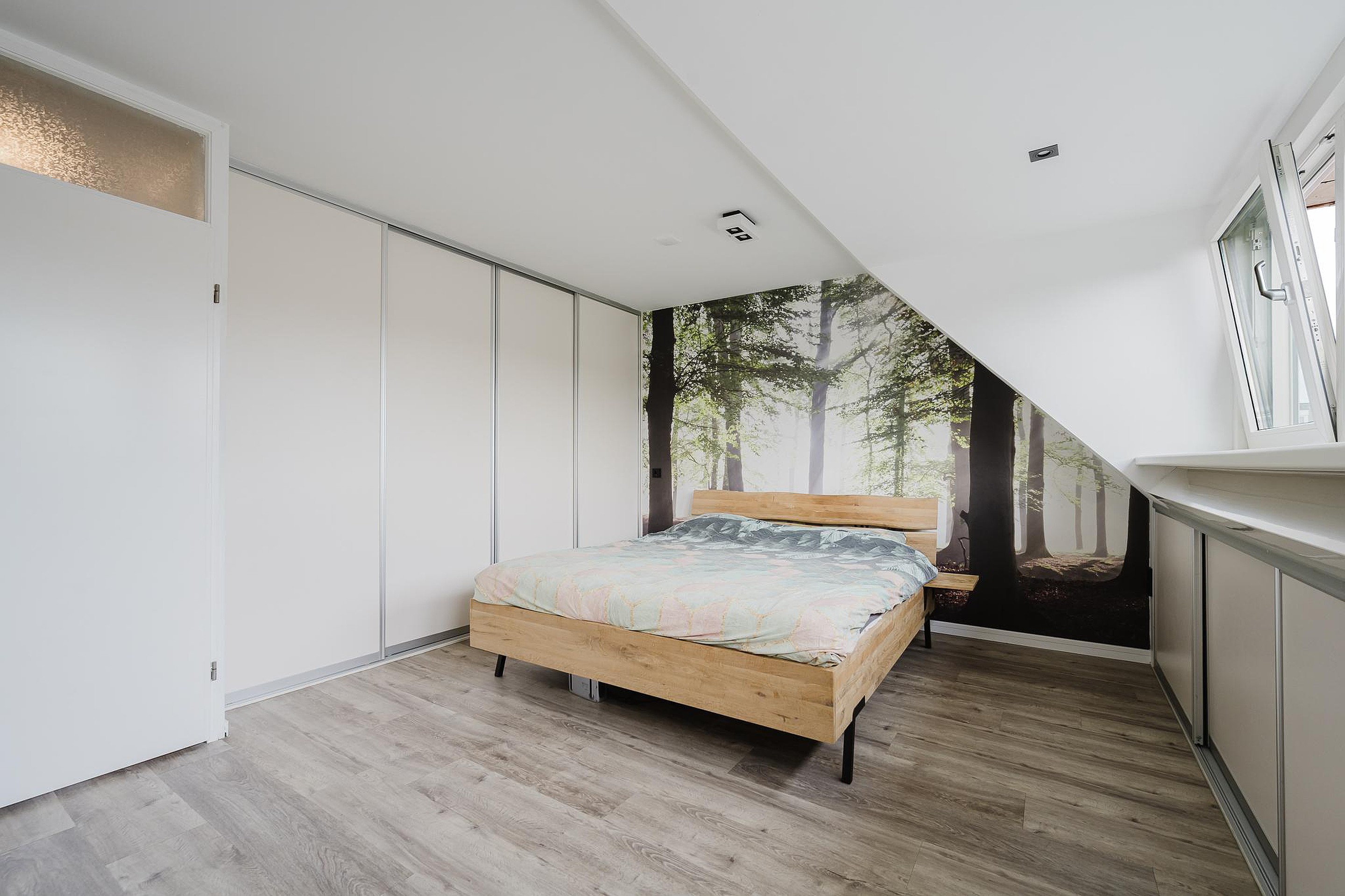 De overloop en slaapkamers zijn voorzien van een mooie houtlook pvc-vloer en de slaapkamer aan de achterzijde is voorzien van een dakkapel over de gehele breedte voor extra ruimte en lichtinval. De bergschotten in deze kamer zorgen voor extra opbergruimte.