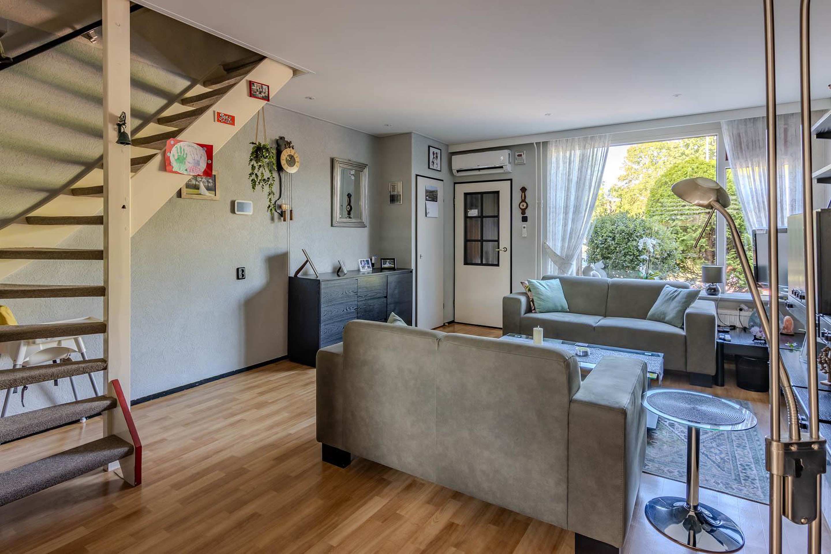 De netjes onderhouden voortuin biedt toegang tot de woning en de meterkast. Via de hal bereik je het toilet en de ruime, sfeervolle woonkamer.