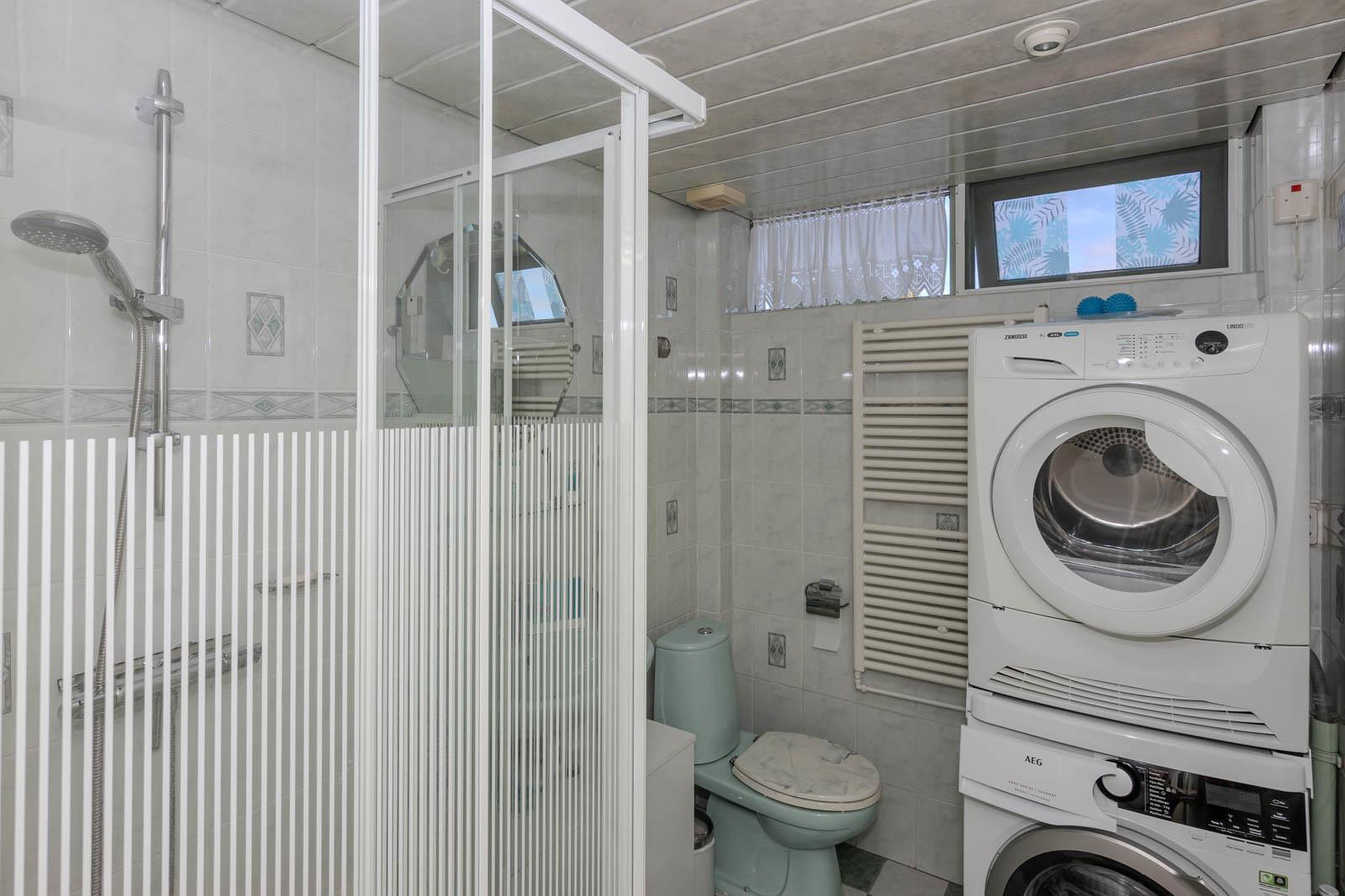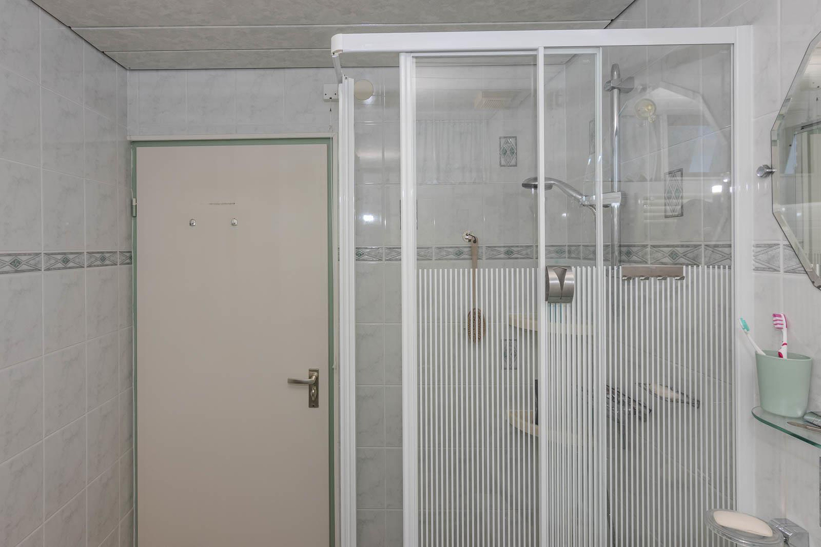 De badkamer is praktisch ingedeeld en voorzien van een douchecabine, tweede toilet, wastafel en de aansluitingen voor de wasmachine en droger.