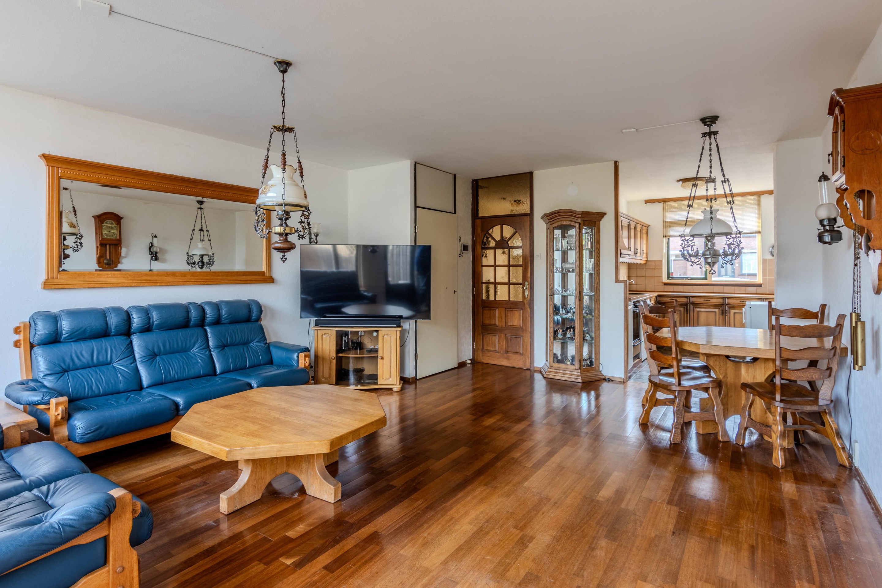 De doorzonwoonkamer met open keuken is heerlijk licht dankzij de grote raampartijen. In de woonkamer is een airco aanwezig, wat zorgt voor extra comfort in zowel zomer als winter. De open keuken bevindt zich aan de voorzijde van de woning.