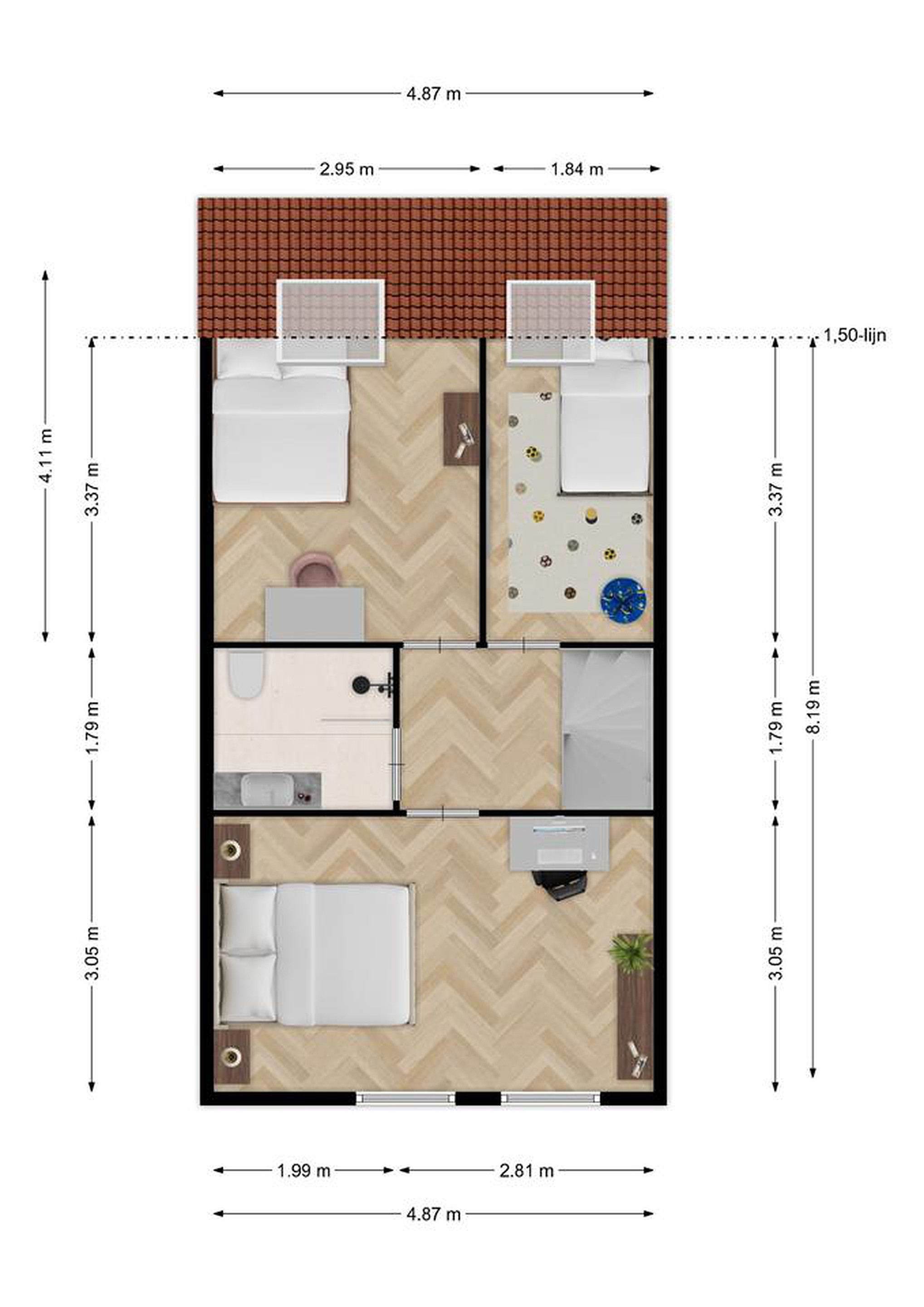 Op de eerste verdieping vind je drie slaapkamers. Eén slaapkamer aan de voorzijde en twee slaapkamers aan de achterzijde, beide voorzien van dakramen en bergschotten voor extra opbergruimte