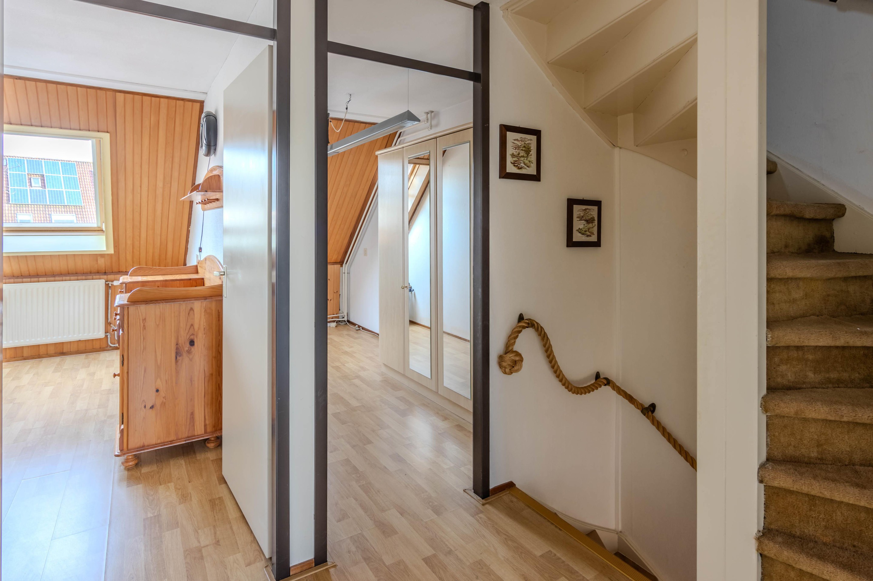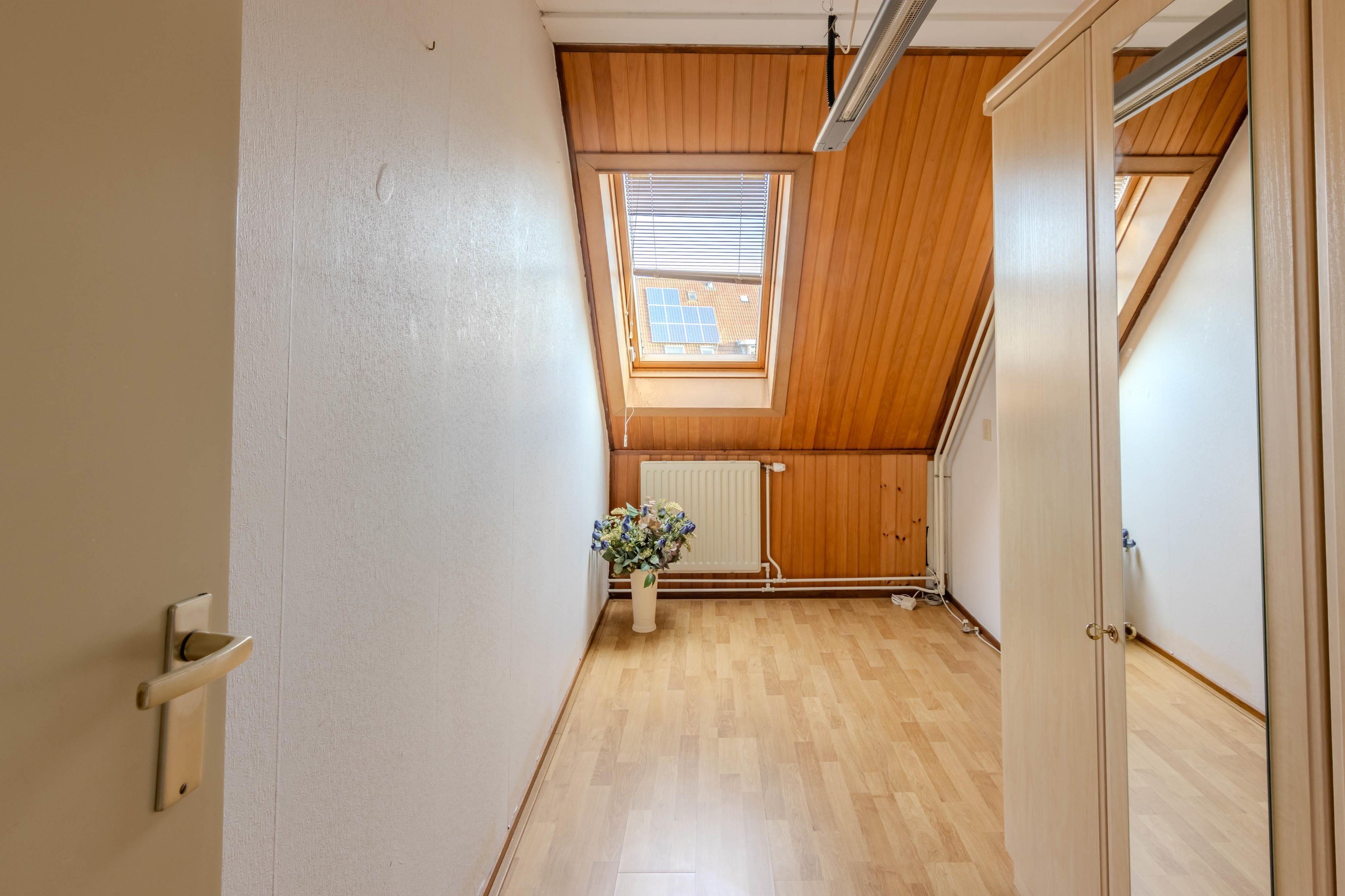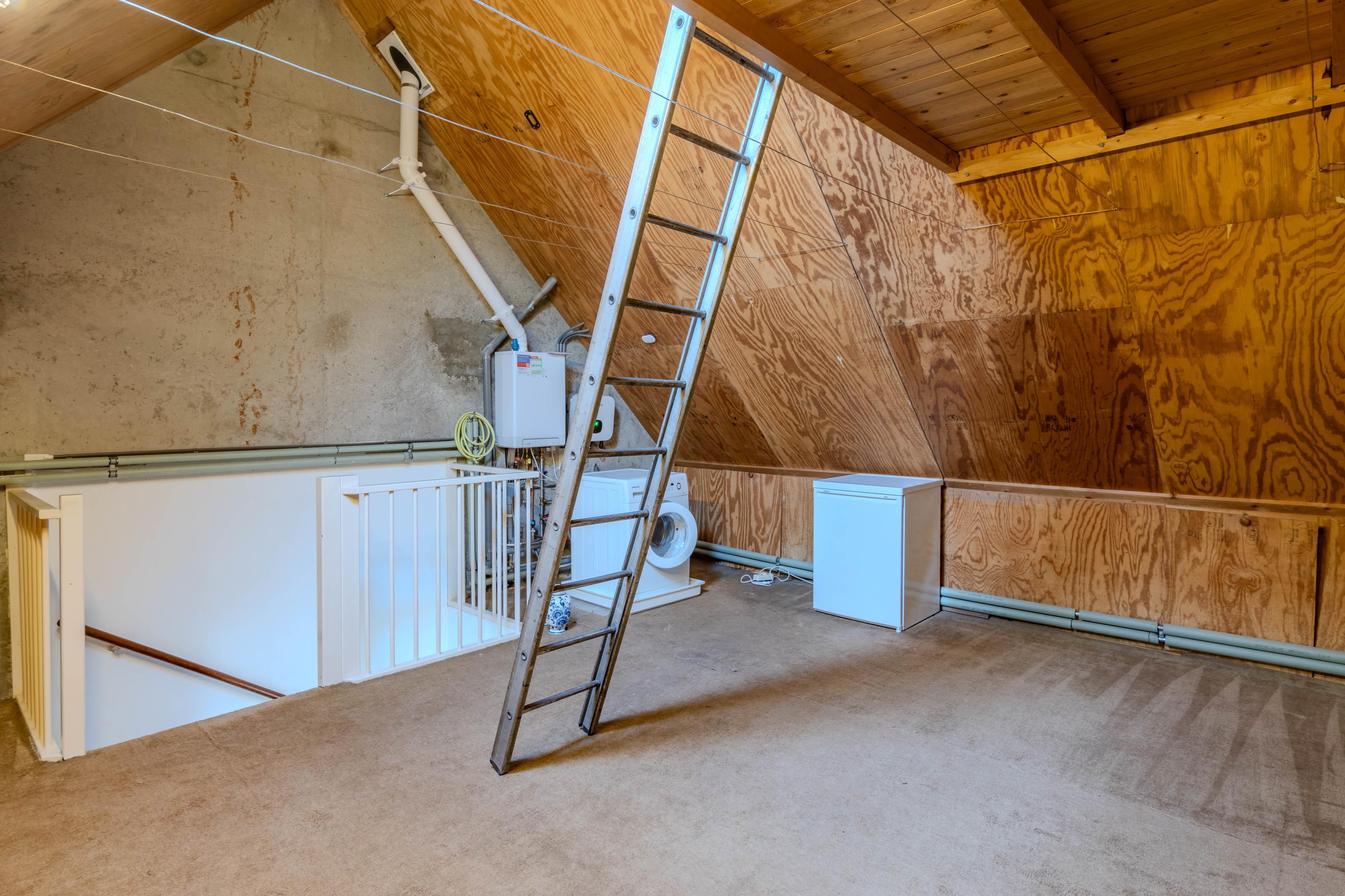 De tweede verdieping is een ruime, hoge zolderkamer met een dakraam. Hier bevinden zich tevens de aansluiting voor de wasmachine, ruimte voor de droger, de cv-installatie (2024) én de omvormer van de zonnepanelen. Deze verdieping is veelzijdig te gebruiken als extra slaapkamer, werkruimte of hobbyruimte.