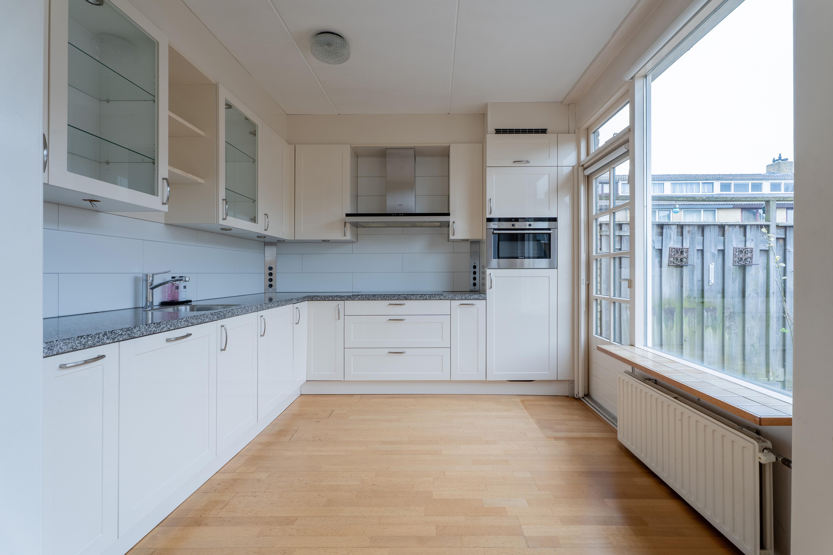 Via de woonkamer bereik je aan de achterzijde van de woning de ruime keuken in L-opstelling. De keuken is uitgerust met twee apothekerskasten, een vaatwasser, een 4-pits inductiekookplaat, een koelkast en een combimagnetron.