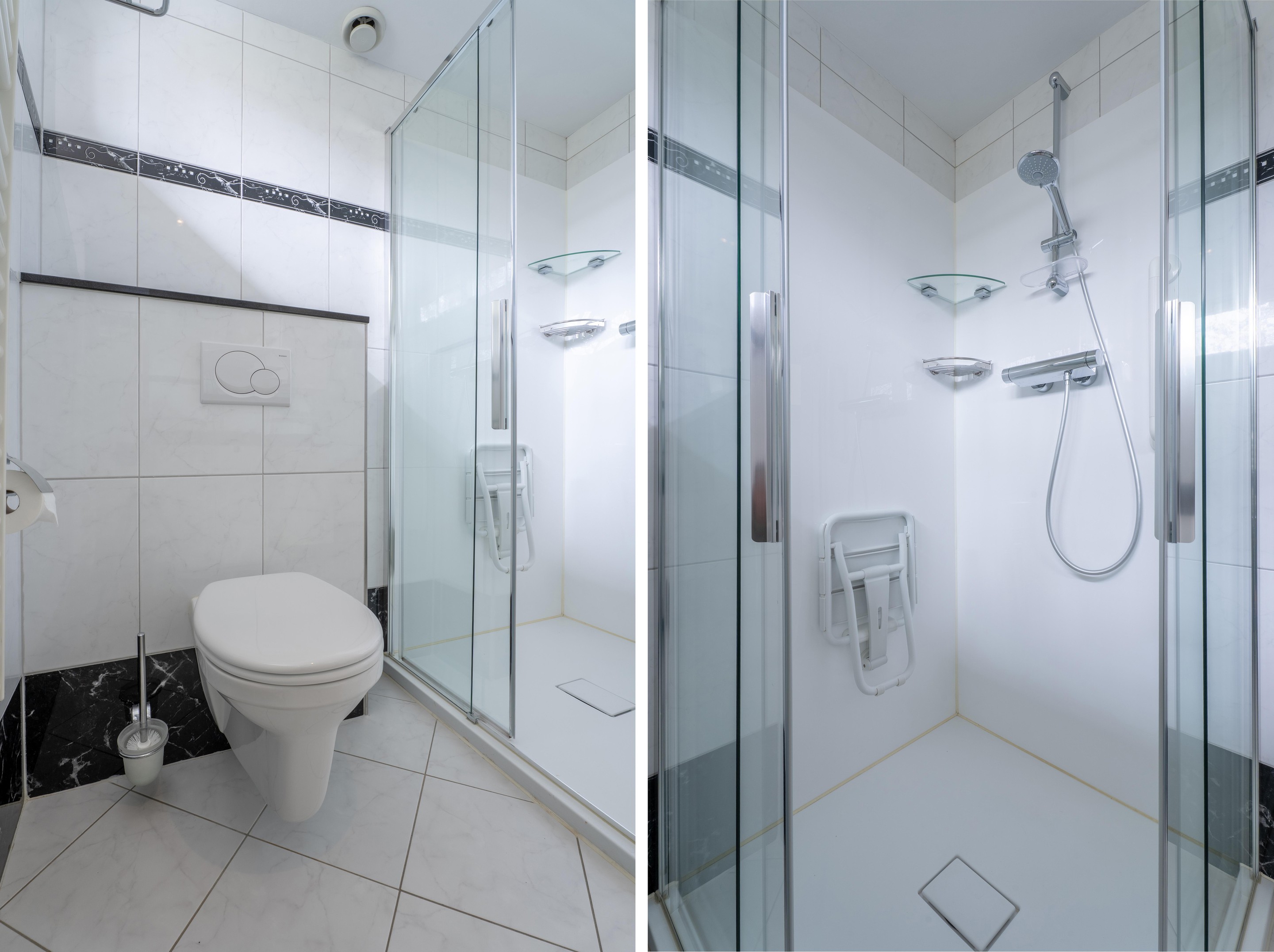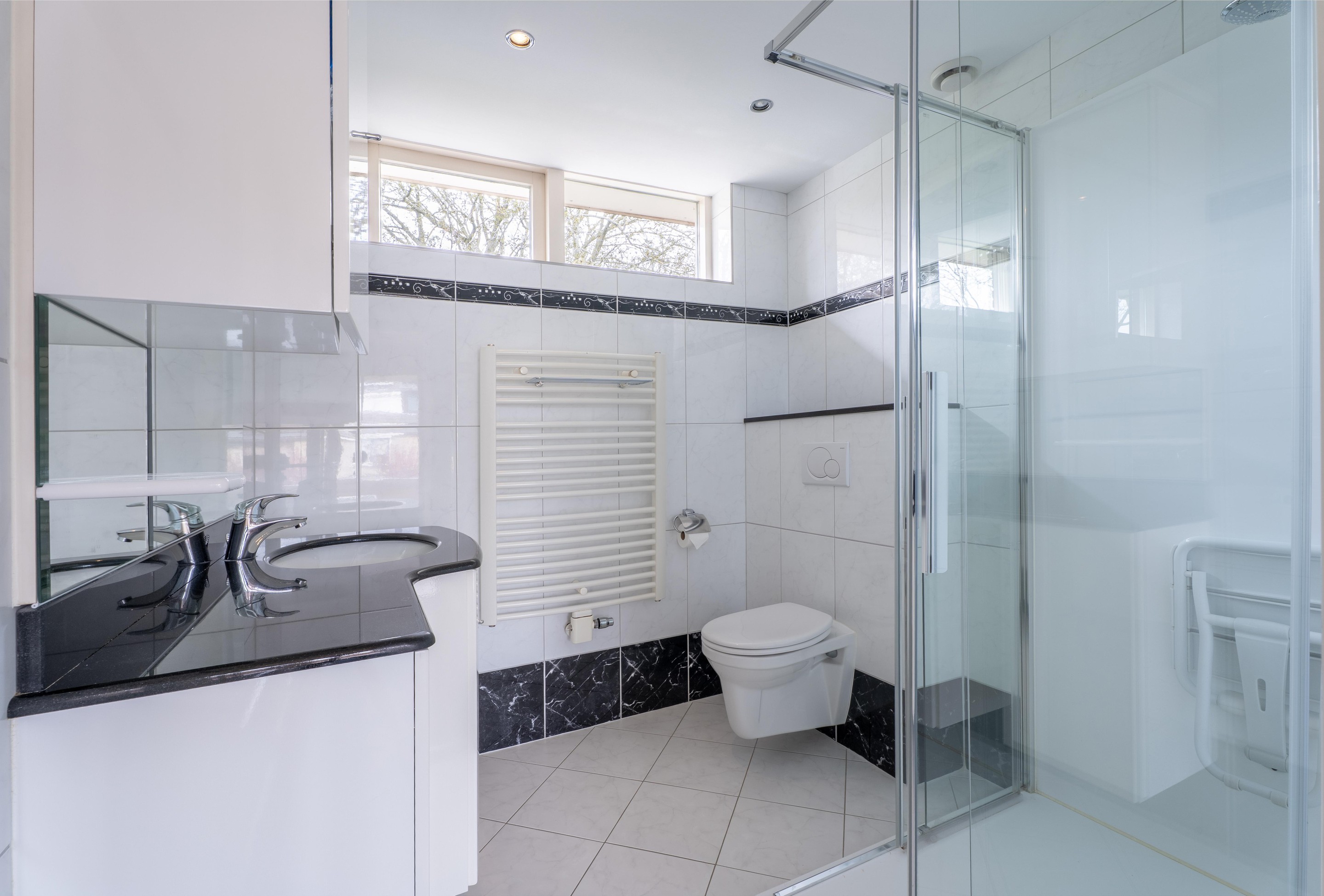 De volledig betegelde badkamer is uitgevoerd met een ruime douche, een hangend toilet en een wastafel met meubel.