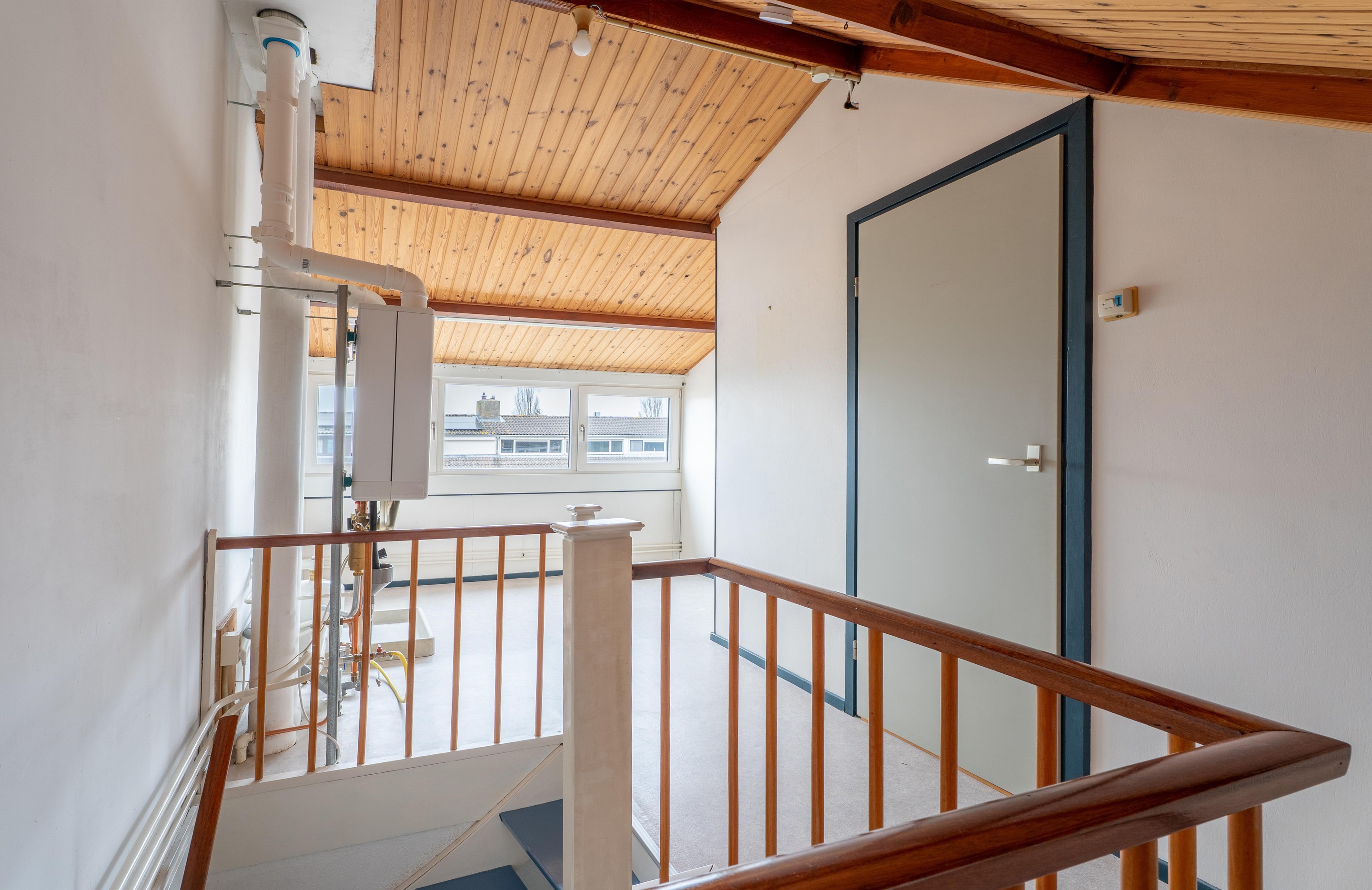 Via de trapopgang bereik je de tweede verdieping welke is ingedeeld in een ruime voorzolder en een zolderkamer.