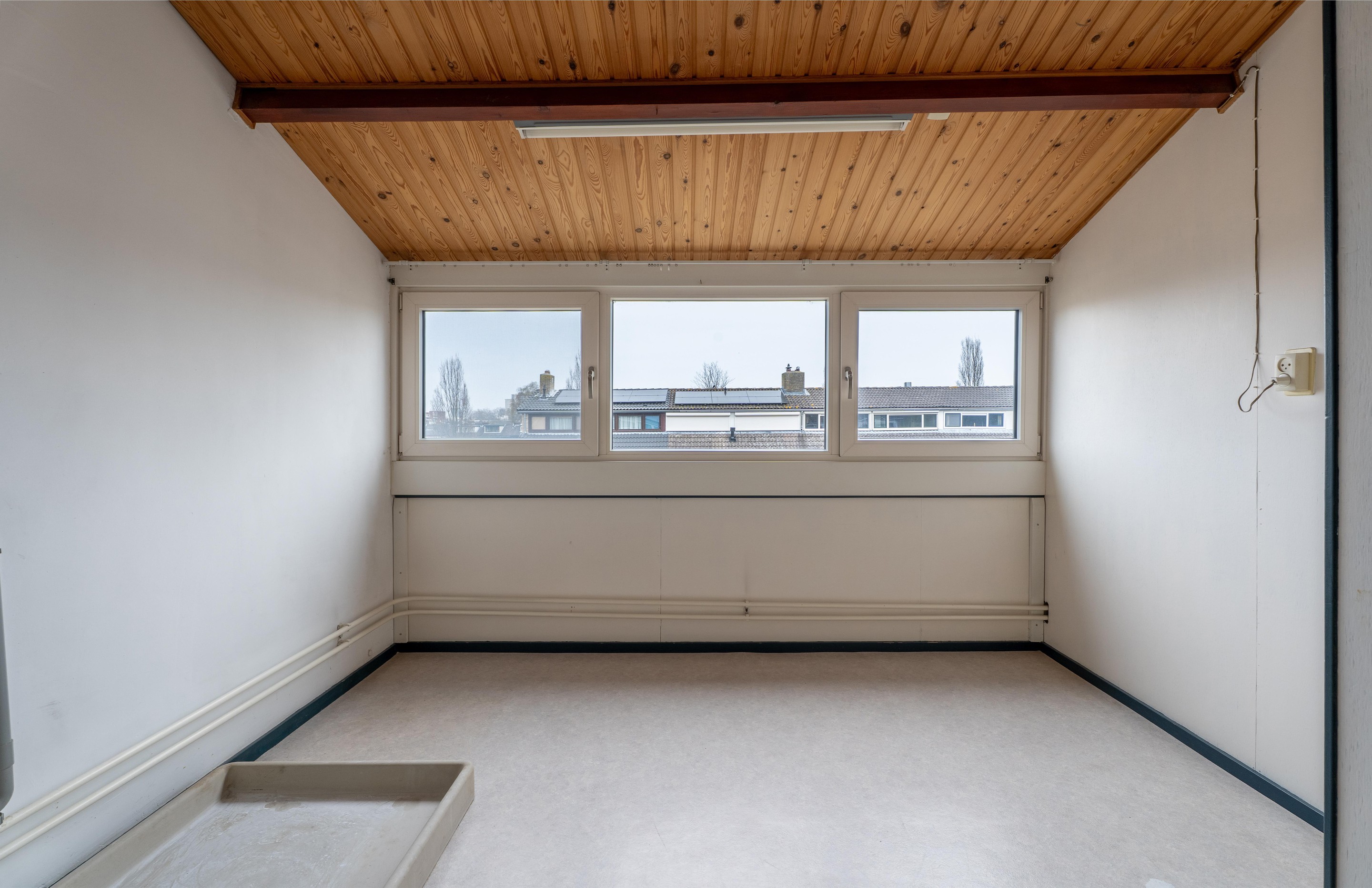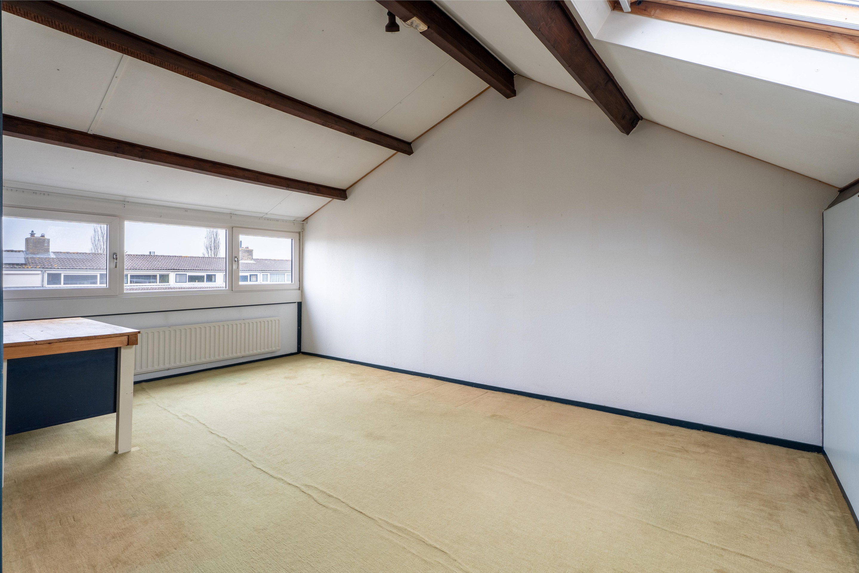 De zolderkamer is voorzien van een praktische vaste kast en bergschotten voor extra bergruimte. Dankzij de grote raampartijen en het dakraam is er sprake van een prettige lichtinval.