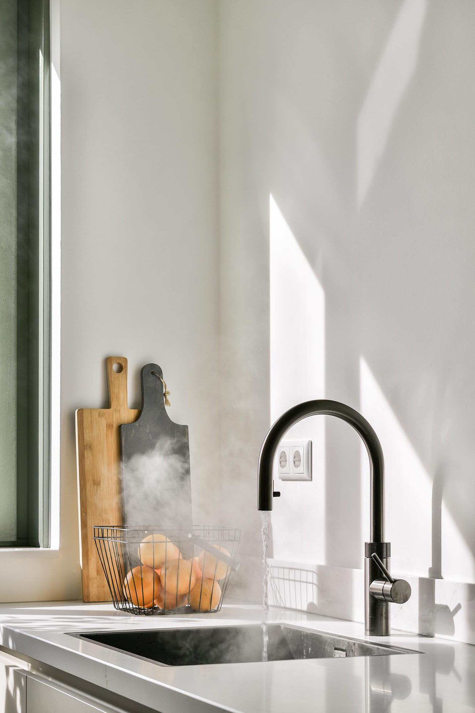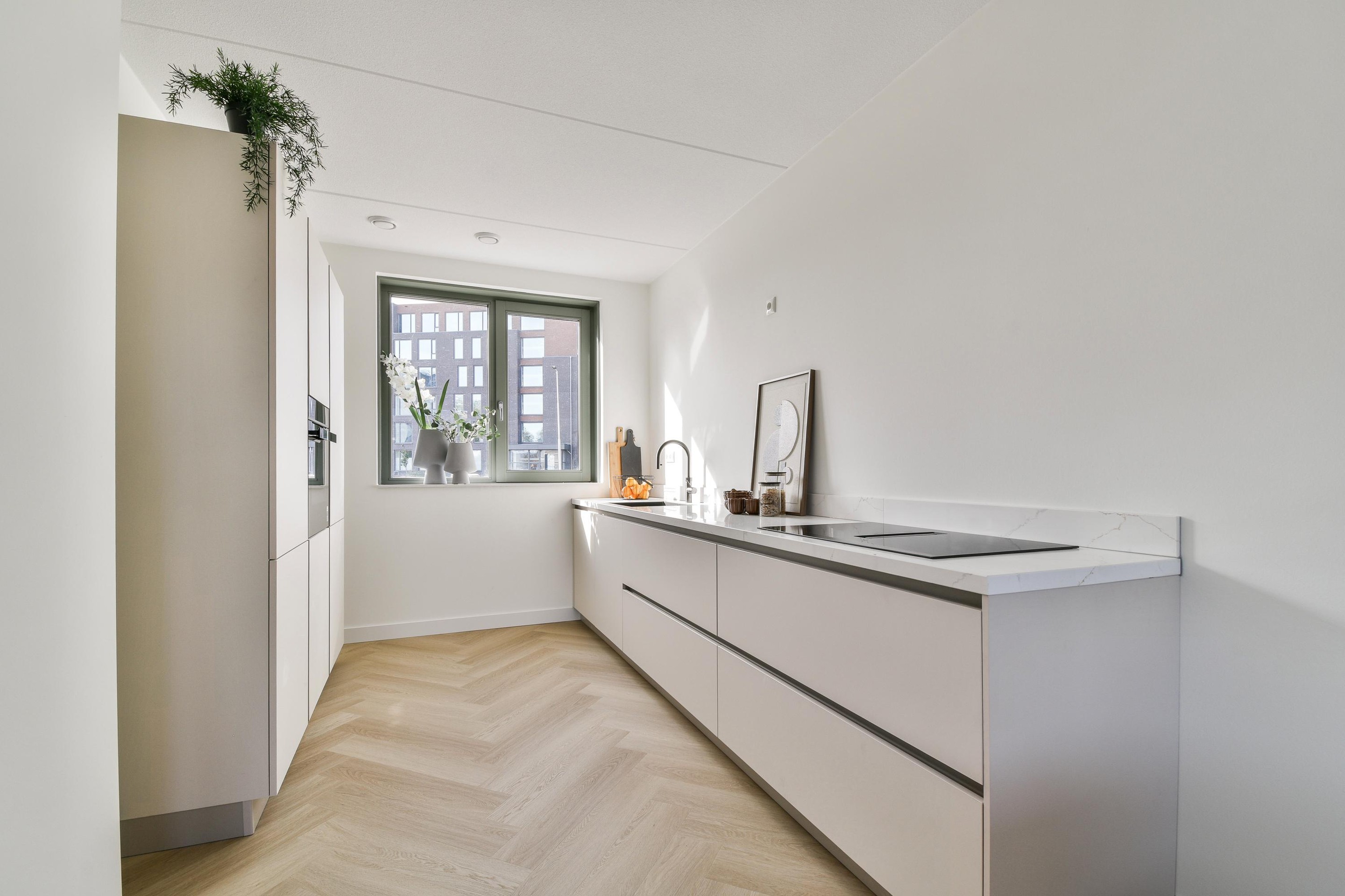 Aan de voorzijde van de woning bevindt zich de nieuwe open keuken, uitgevoerd in moderne stijl en voorzien van een complete set ongebruikte Siemens inbouwapparatuur: een inductiekookplaat met ingebouwde afzuiginstallatie, een vaatwasser, een koelkast, een combi-magnetron, én een Quooker voor direct kokend water.