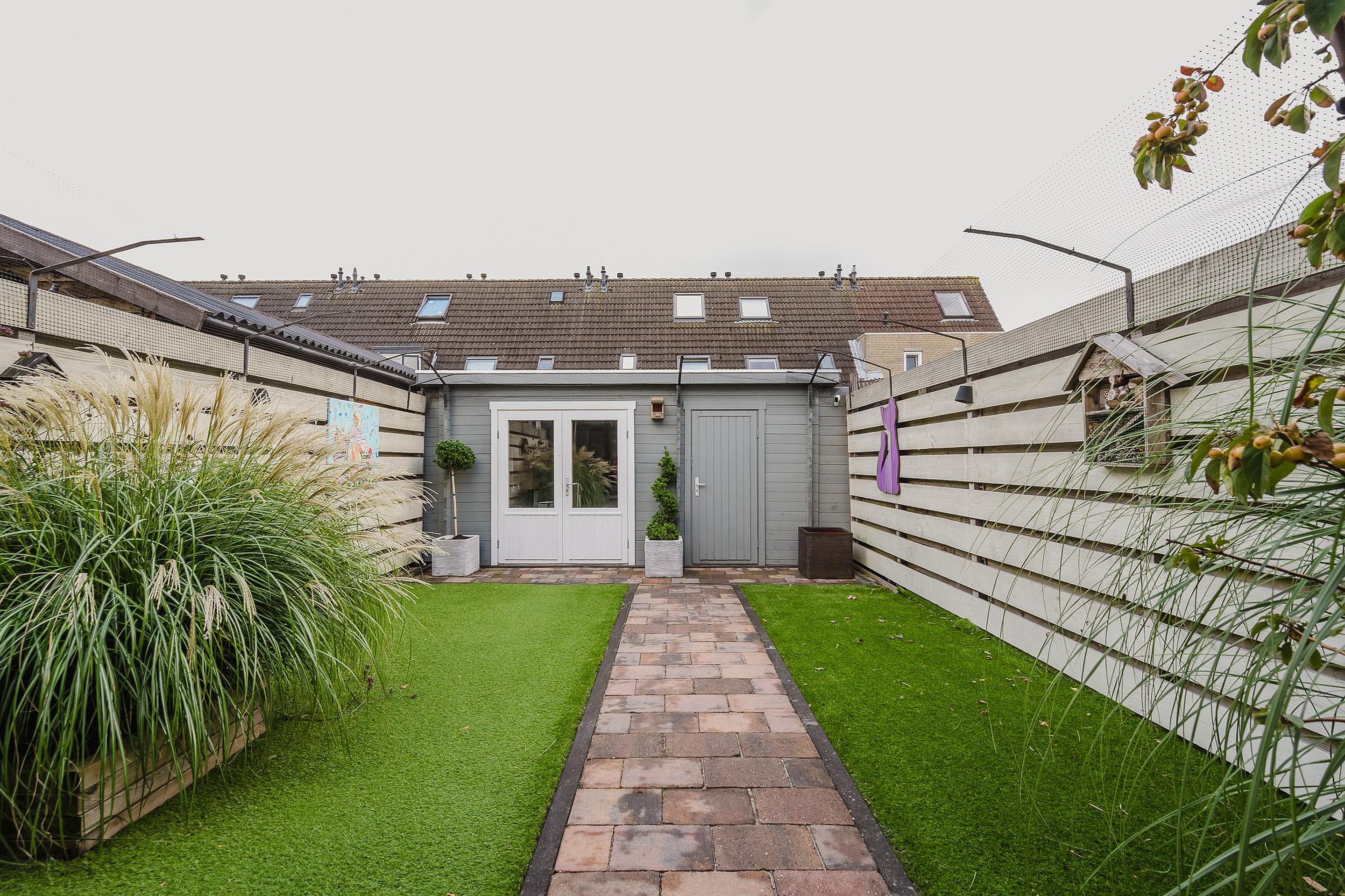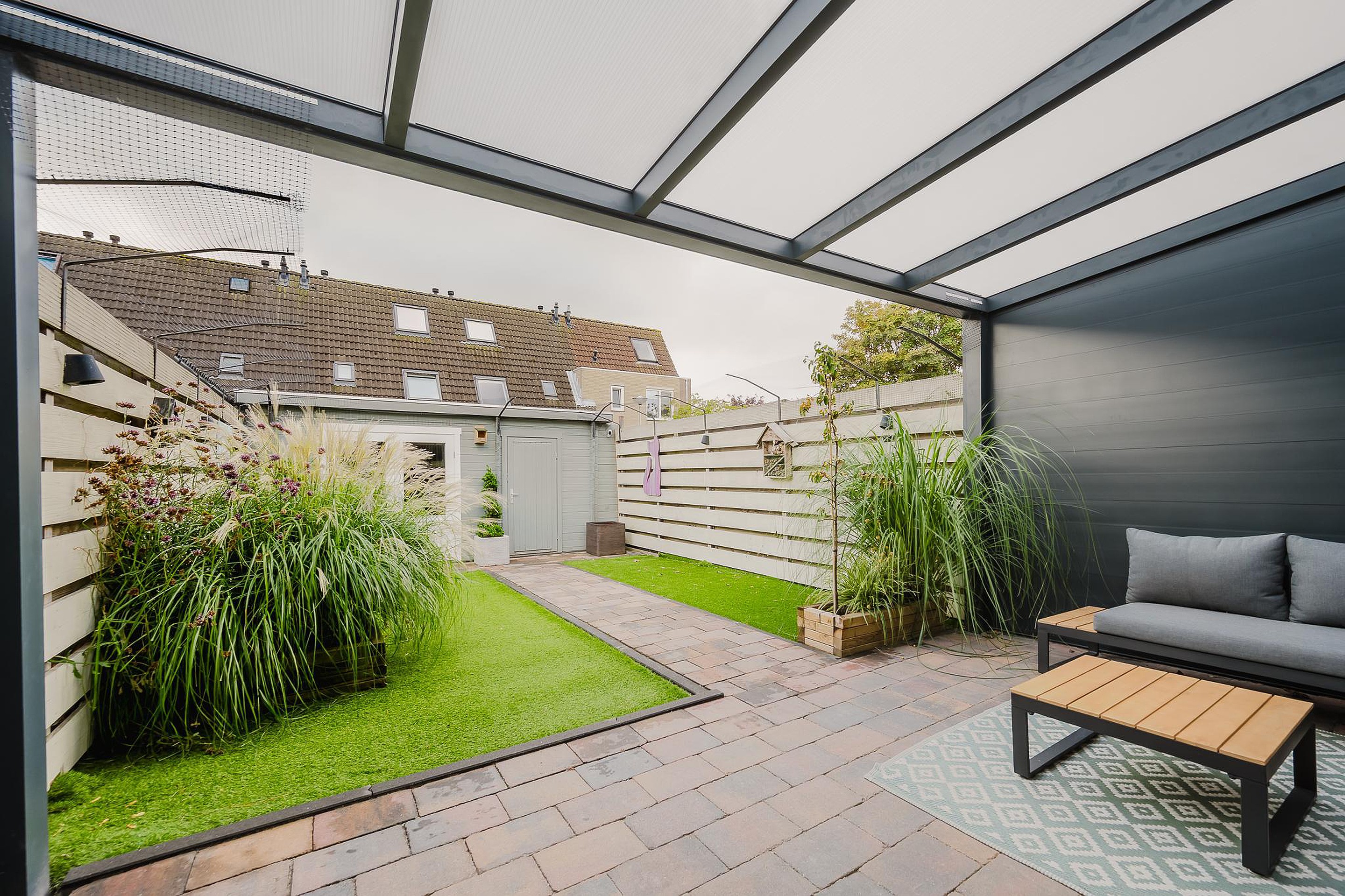 De schuifpui in de woonkamer biedt toegang tot de uitnodigende achtertuin gelegen op het zuiden. De achtertuin is voorzien van een gezellige aluminium overkapping, heeft twee houten bergingen en een achterom.