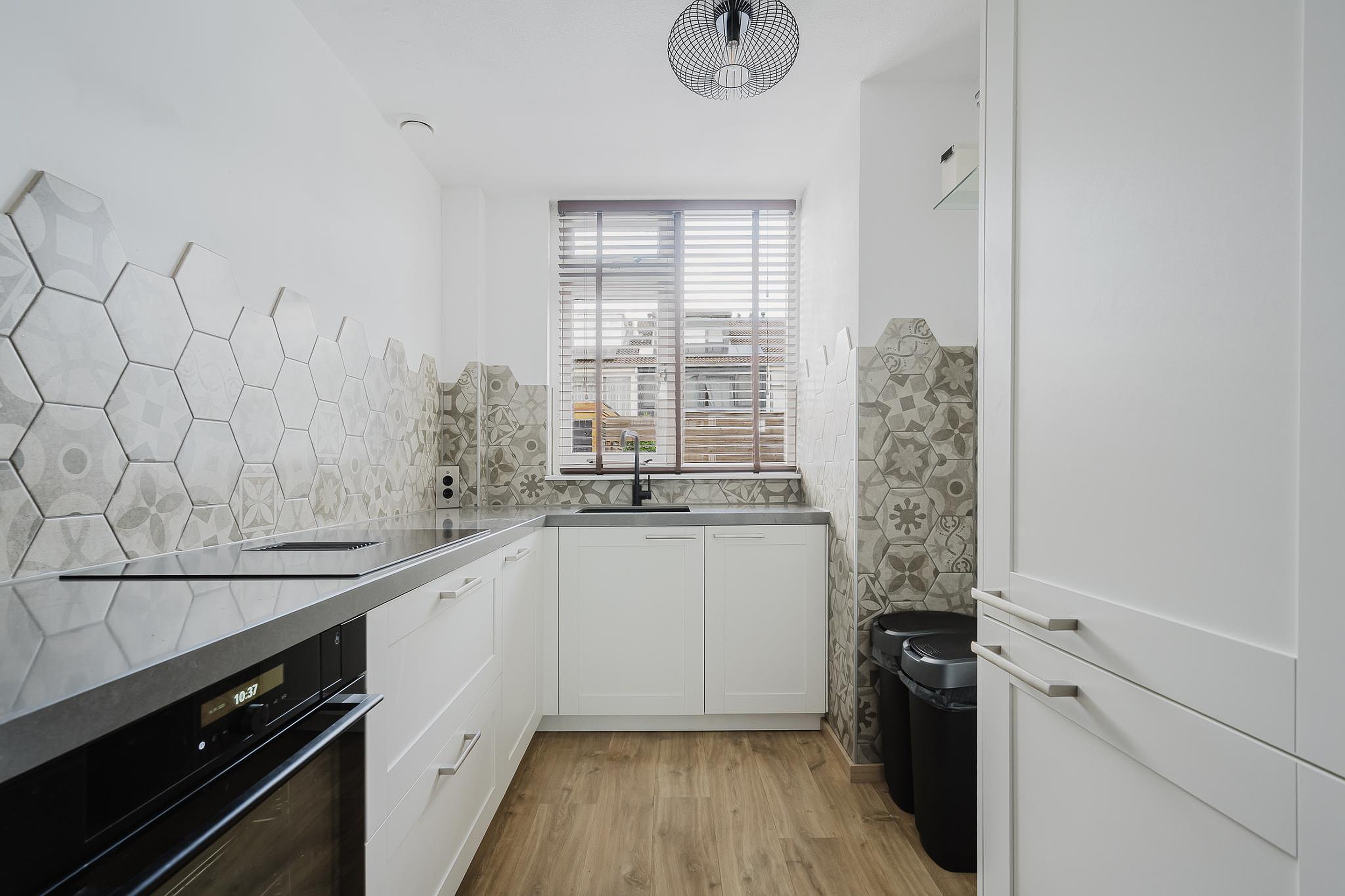 De zeer ruime, licht woonkamer biedt toegang tot de half open keuken welke in 2022 volledig is gerenoveerd. De keuken is voorzien van een composiet keukenblad en heeft een stoomoven, een 4-pits inductiekookplaat met afzuigsysteem en een koel-vriescombi.