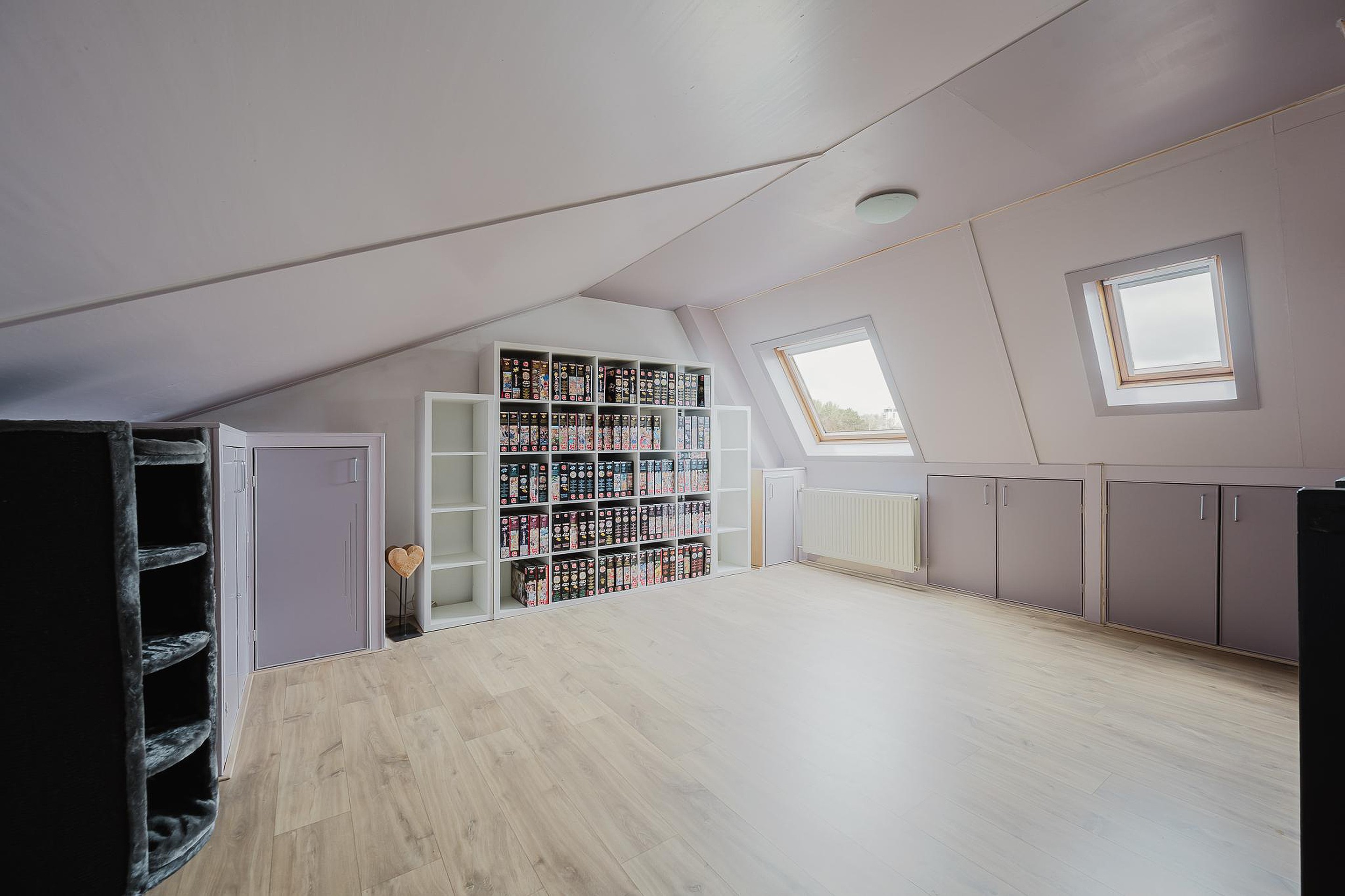 De volledige verdieping is voorzien van een laminaatvloer en bergschotten voor voldoende opbergruimte.