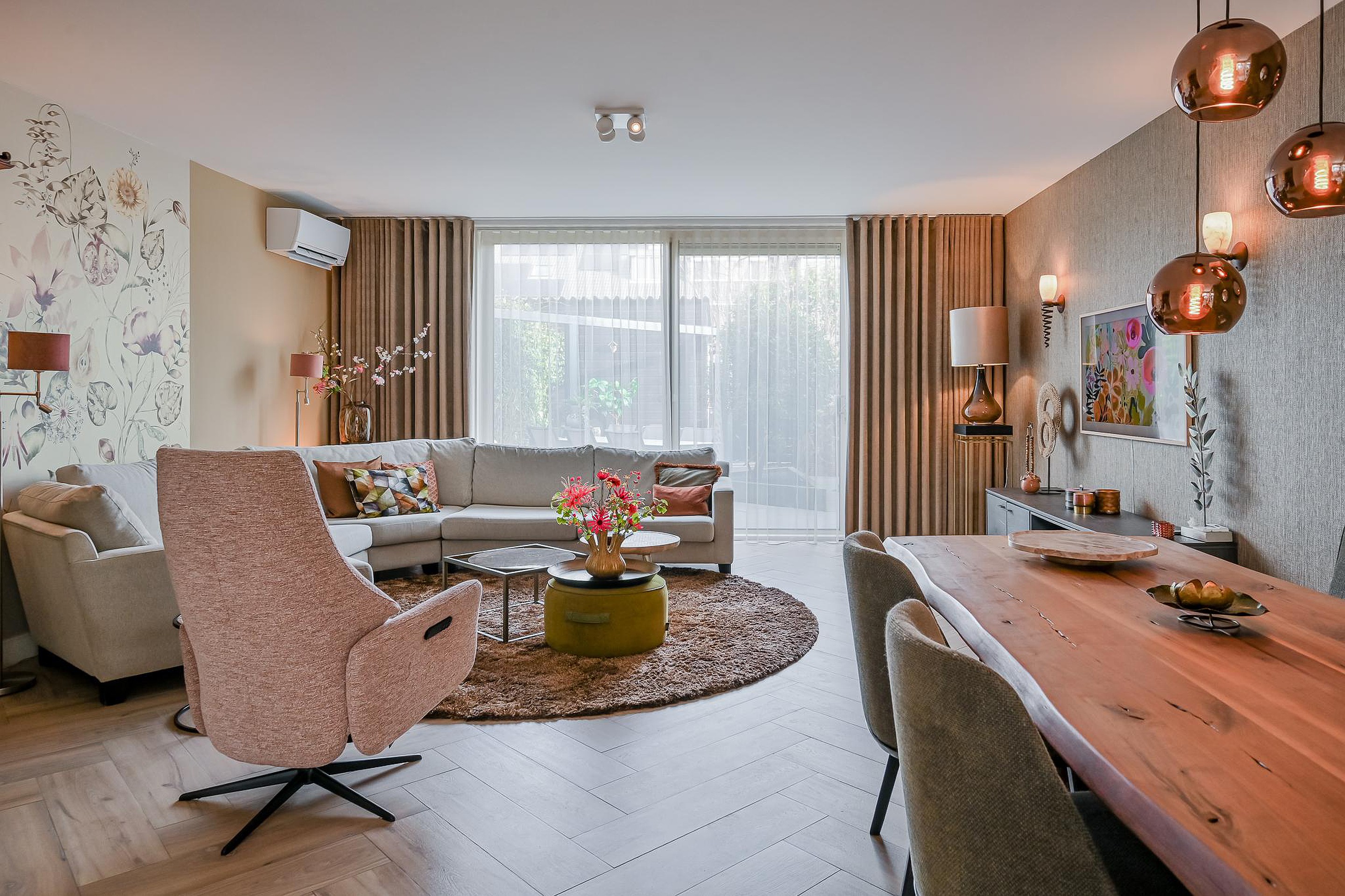Via de hal kom je in de ruime, uitgebouwde woonkamer. Dankzij de brede kunststof schuifpui is er veel natuurlijke lichtinval en een prettige verbinding met de tuin. De woonkamer is in 2025 voorzien van airconditioning, geschikt voor zowel koelen als verwarmen.