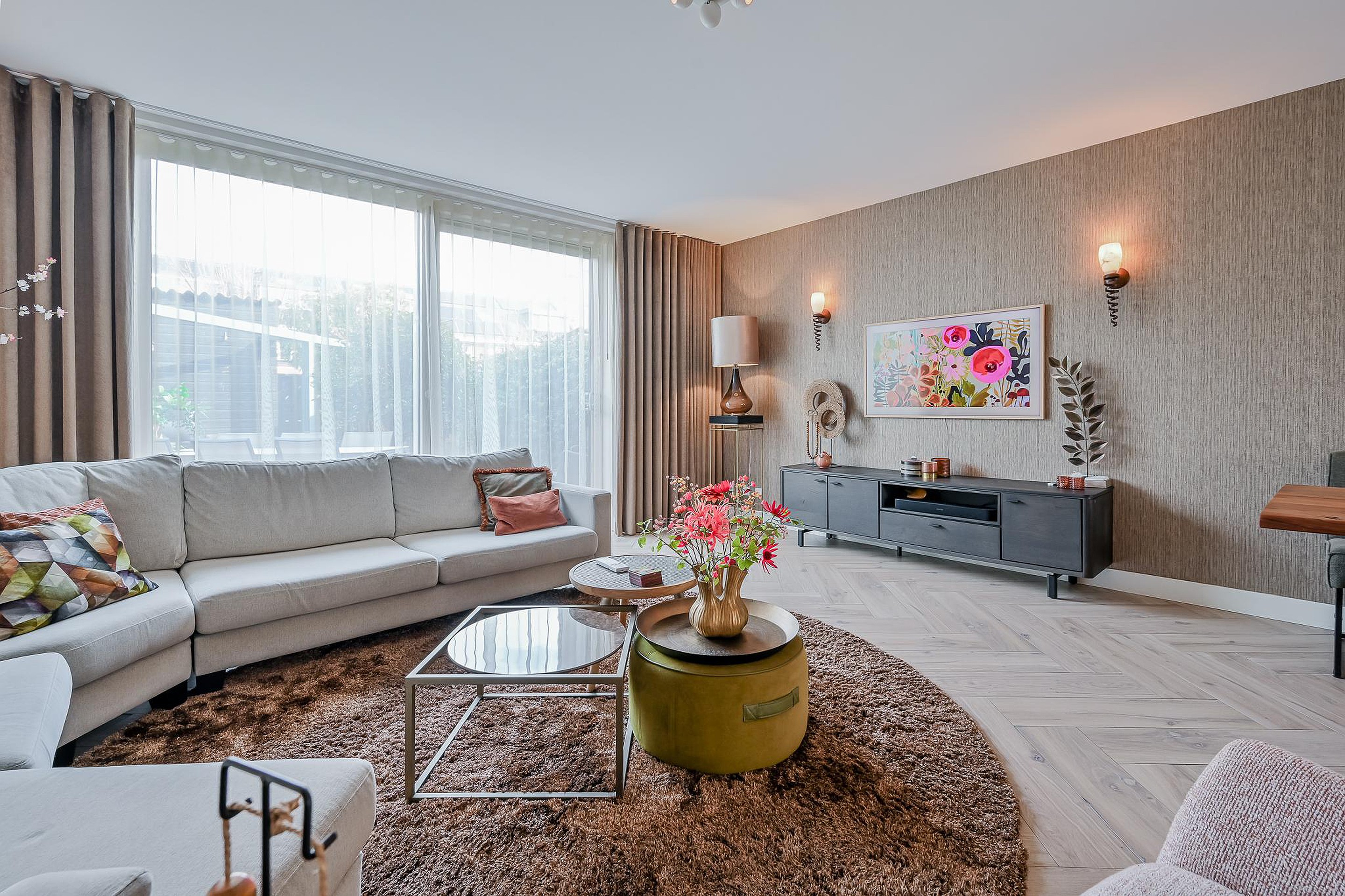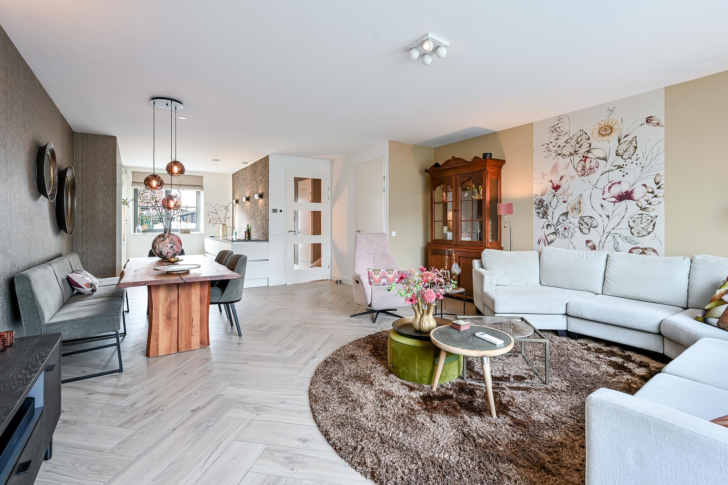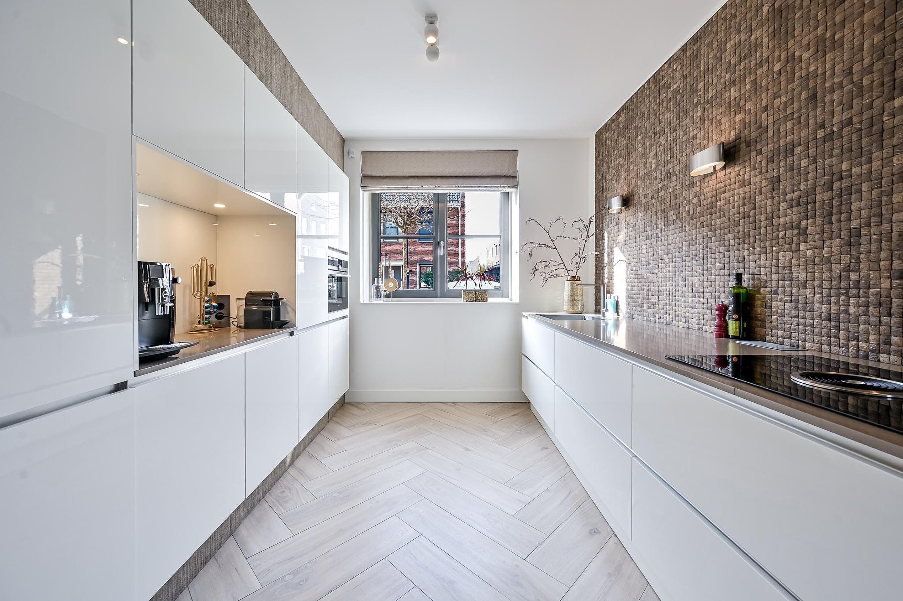 De volledige begane grond is afgewerkt met een luxe keramische tegelvloer in visgraatmotief, voorzien van comfortabele vloerverwarming. Daarnaast zijn de wanden deels afgewerkt met behang en is het plafond strak gestuukt, wat zorgt voor een moderne en verzorgde uitstraling.