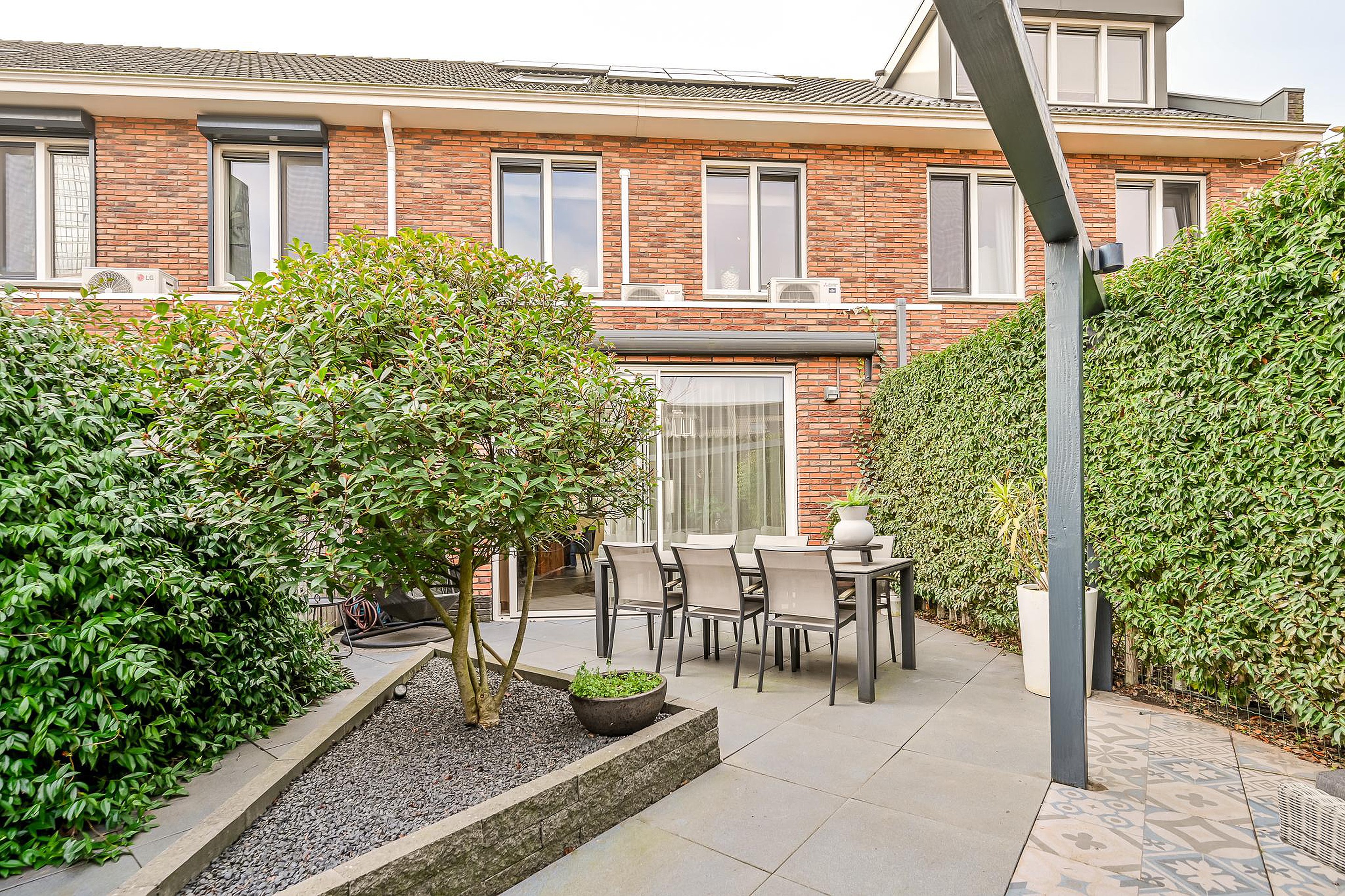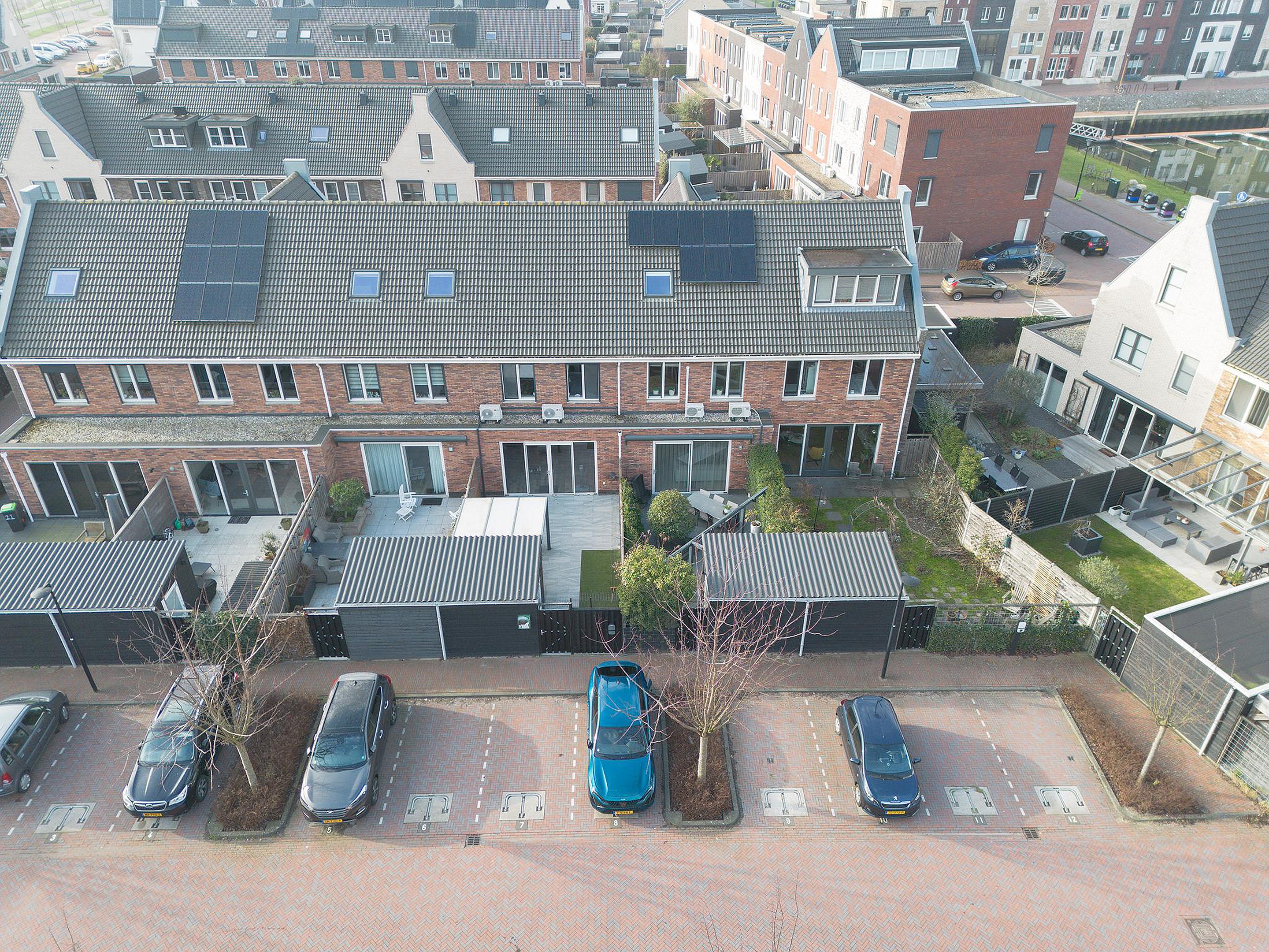 Via de schuifpui bereik je de fraai aangelegde achtertuin, die is voorzien van een vrijstaande houten berging, een elektrisch zonnescherm en een achterom met directe toegang tot de achtergelegen eigen parkeerplaats,