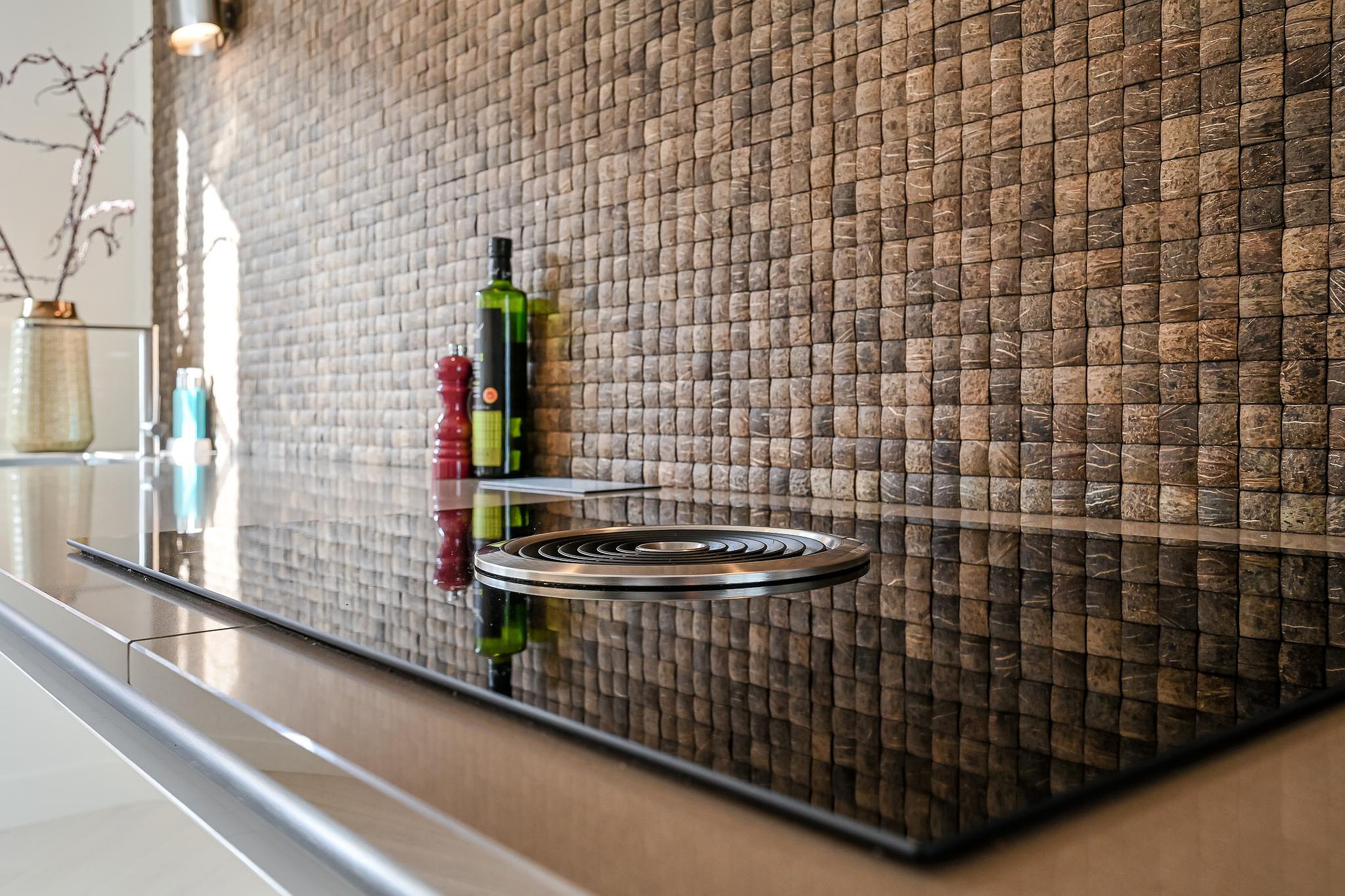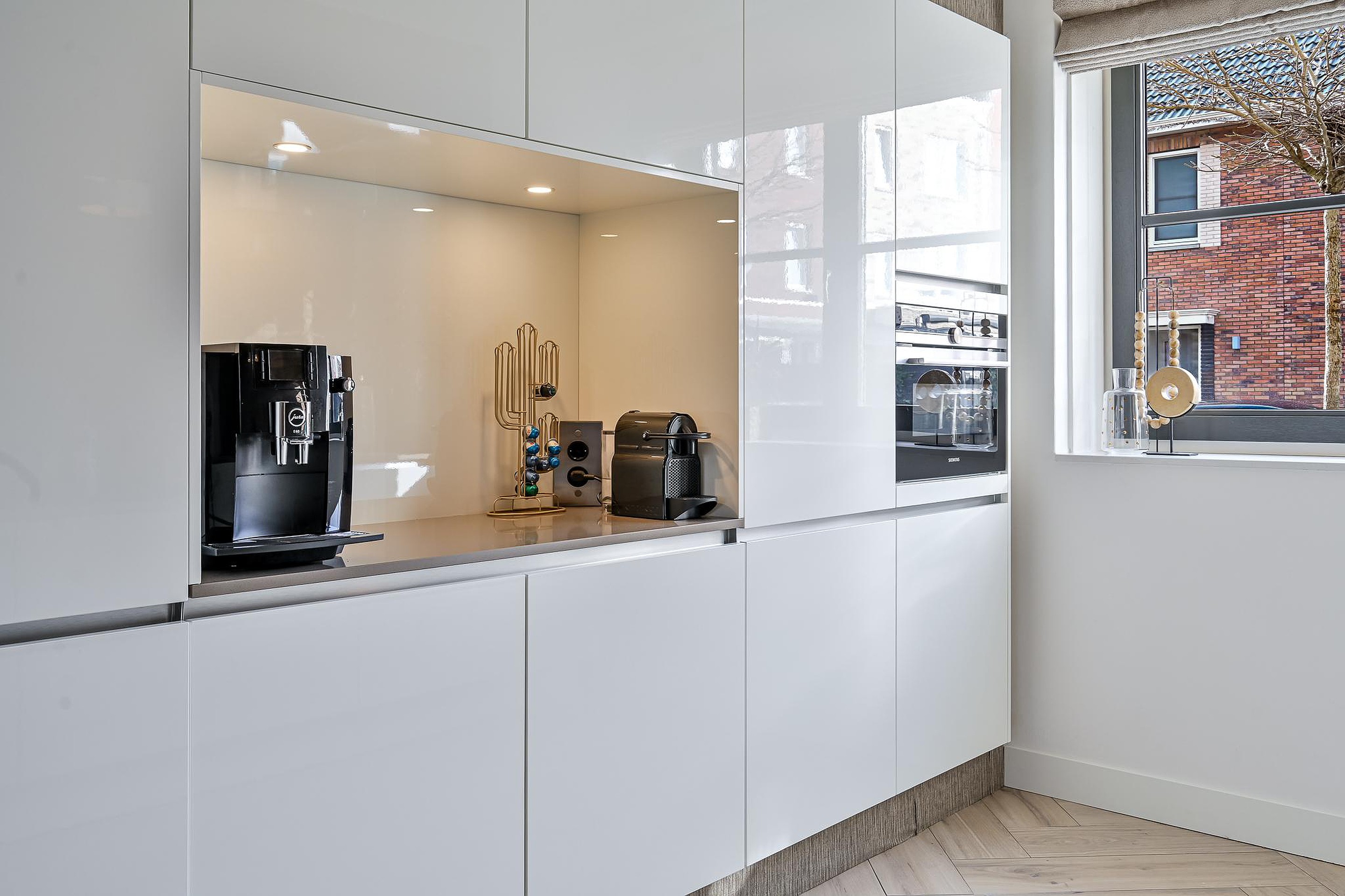 Terug in de woonkamer bevindt zich aan de voorzijde van de woning de luxe keuken (2018). Deze moderne keuken is uitgevoerd met een hoge kastenwand met koelkast en vriezer, een luxe koffienis, een vaatwasser, close-in boiler en een 4-pits inductiekookplaat met Bora-afzuigsysteem. Daarnaast beschikt de keuken over volop praktische bergruimte.
