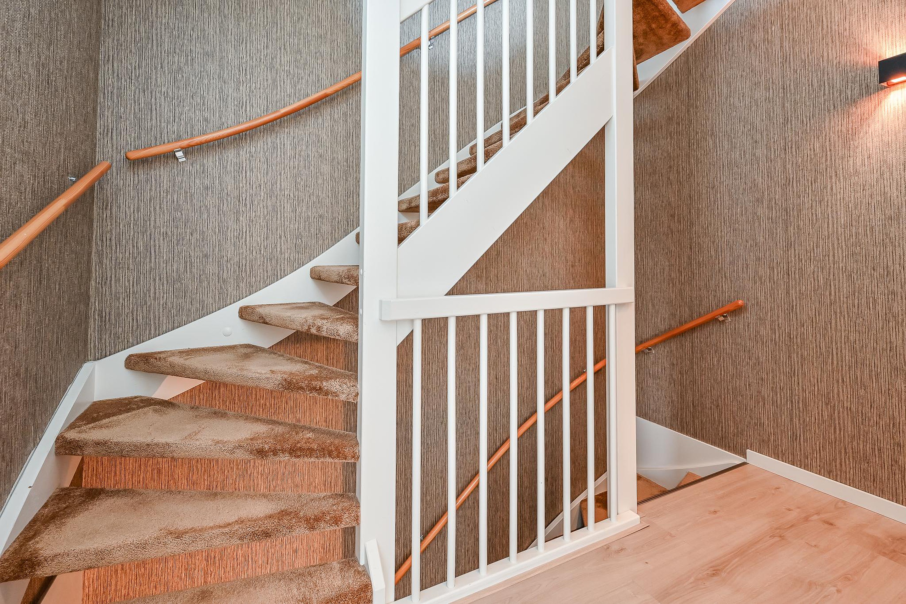 De gehele verdieping is afgewerkt met een nette laminaatvloer en een strakke renovlies wandafwerking.