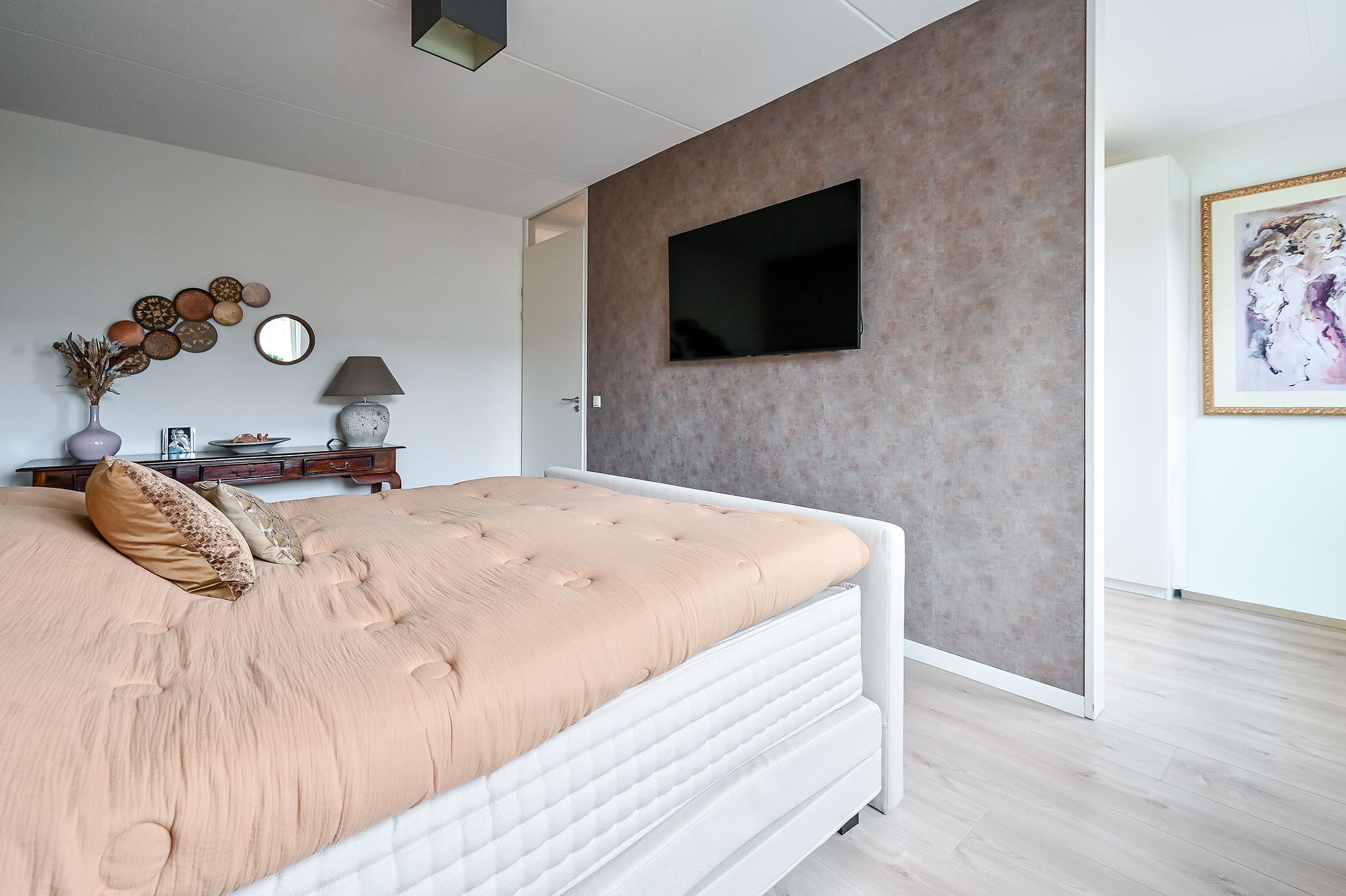Vanuit deze slaapkamer is er directe toegang tot de ruime walk-in-closet, wat bijdraagt aan het luxe en praktische karakter van de woning.