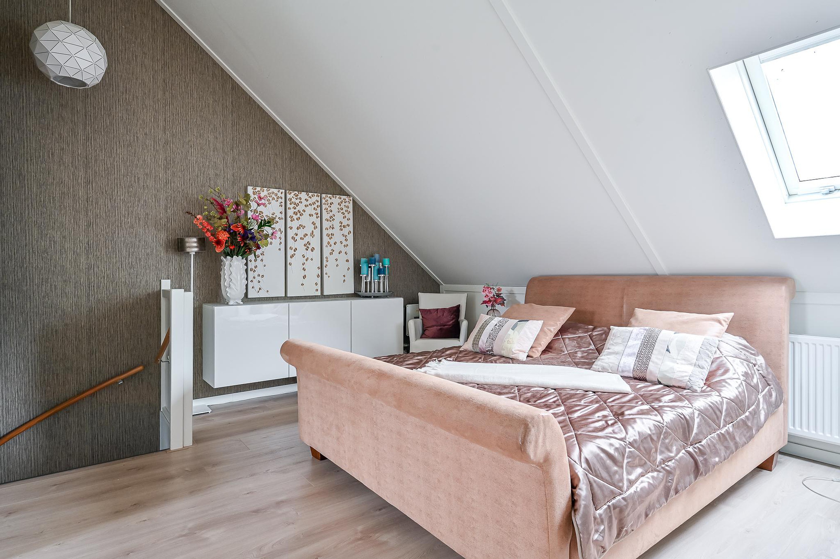 Via de trapopgang bereik je de zolderverdieping, die zich onderscheidt door de unieke indeling dankzij de extra zadelkap. Hierdoor is een opvallend ruime en prettig ingedeelde verdieping ontstaan met volop gebruiksmogelijkheden.