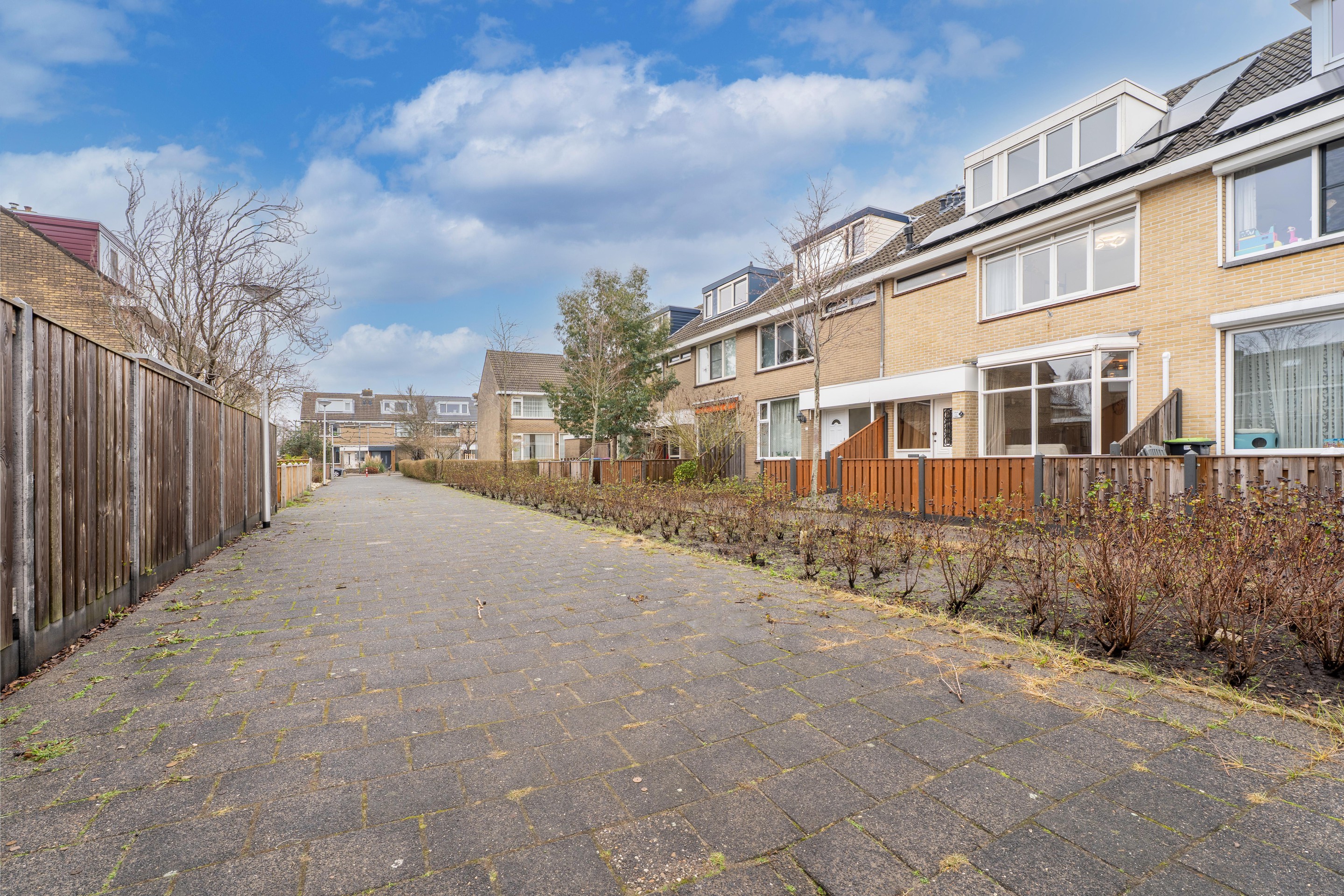 Via het autovrije pad gelegen aan de voorzijde van de woning bereik je de ruime voortuin gelegen op het westen.