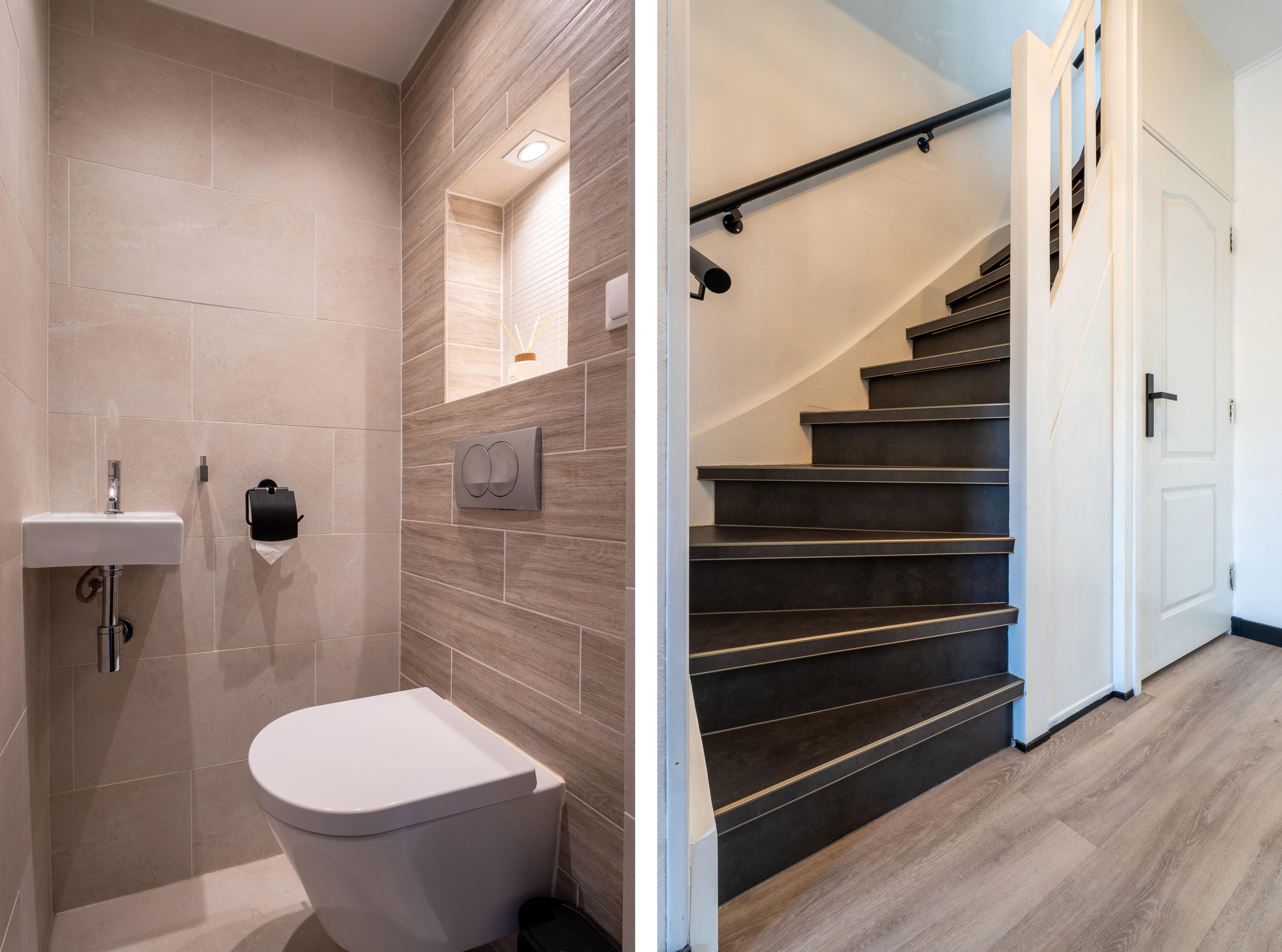De woningentree geeft toegang tot een ruime hal met meterkast, trapkast voor extra bergruimte en een volledig betegeld toilet, voorzien van een hangend closet en fonteintje.