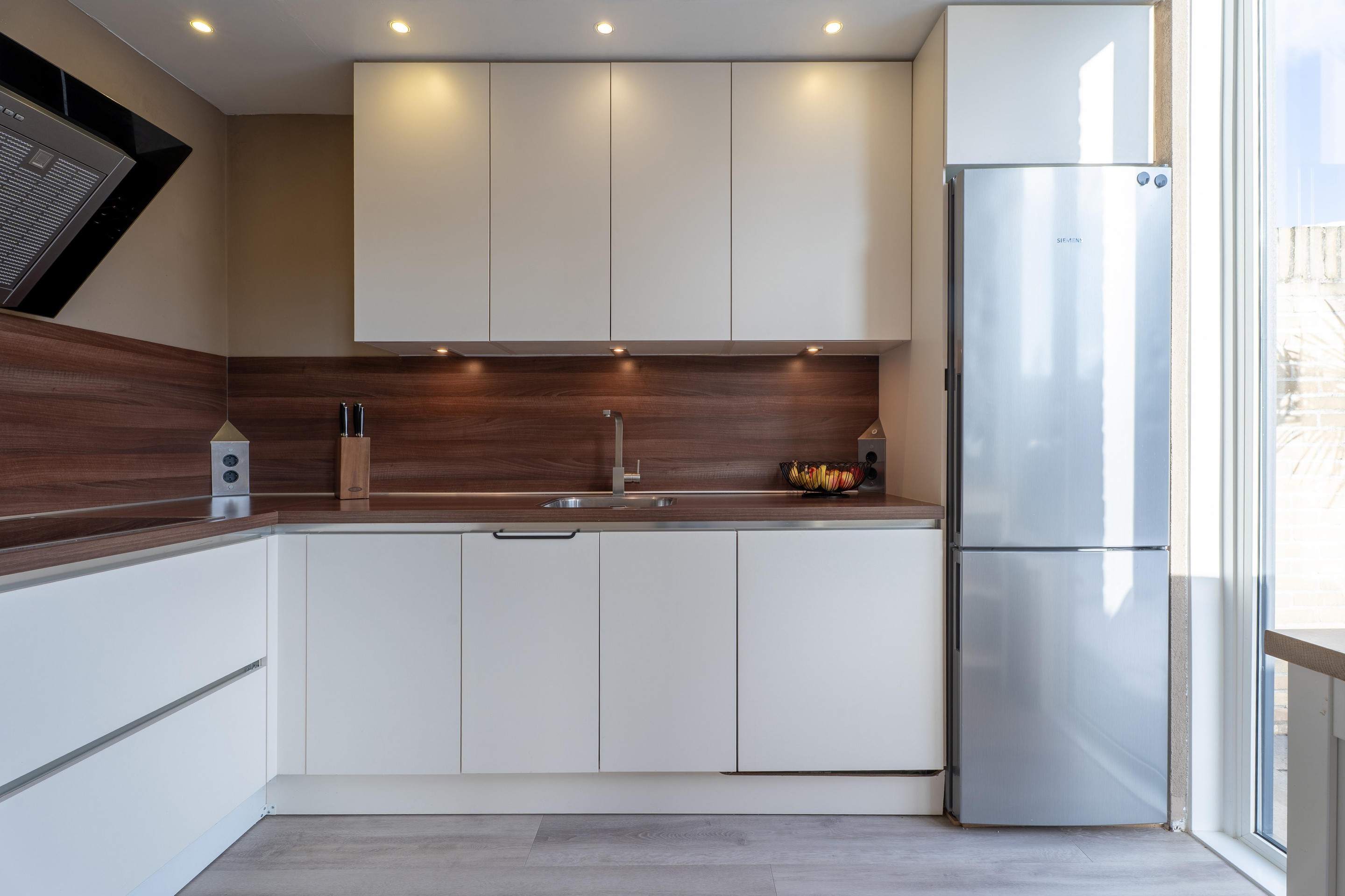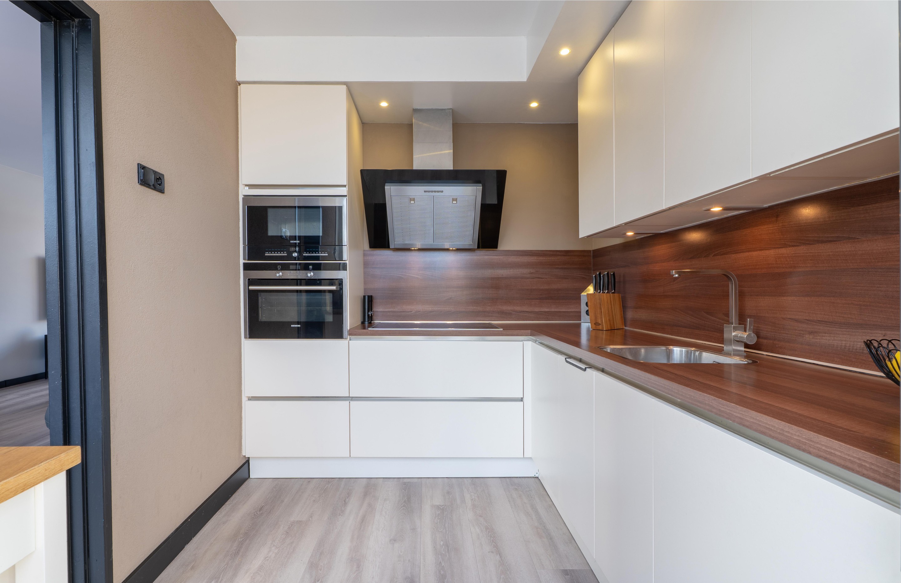Eenmaal terug in de woonkamer bereik je de gesloten moderne keuken.