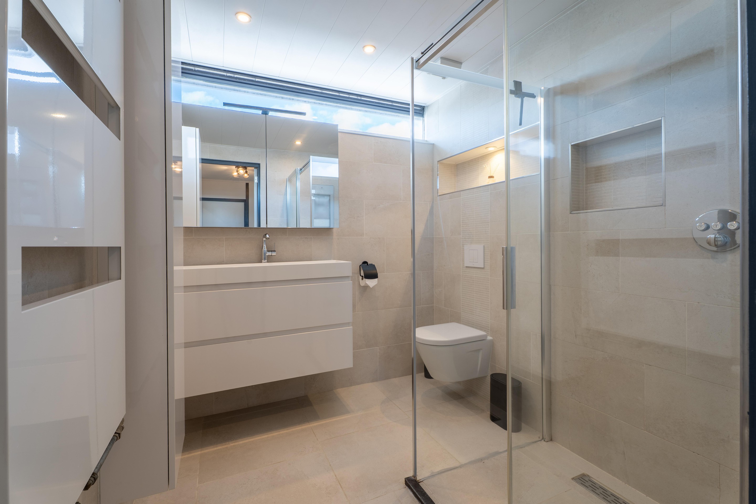 De volledig betegelde badkamer is luxe uitgevoerd met een ruime inloopdouche met sunshower, een ingebouwd radiosysteem, een hangend toilet, een wastafel met meubel en een designradiator.