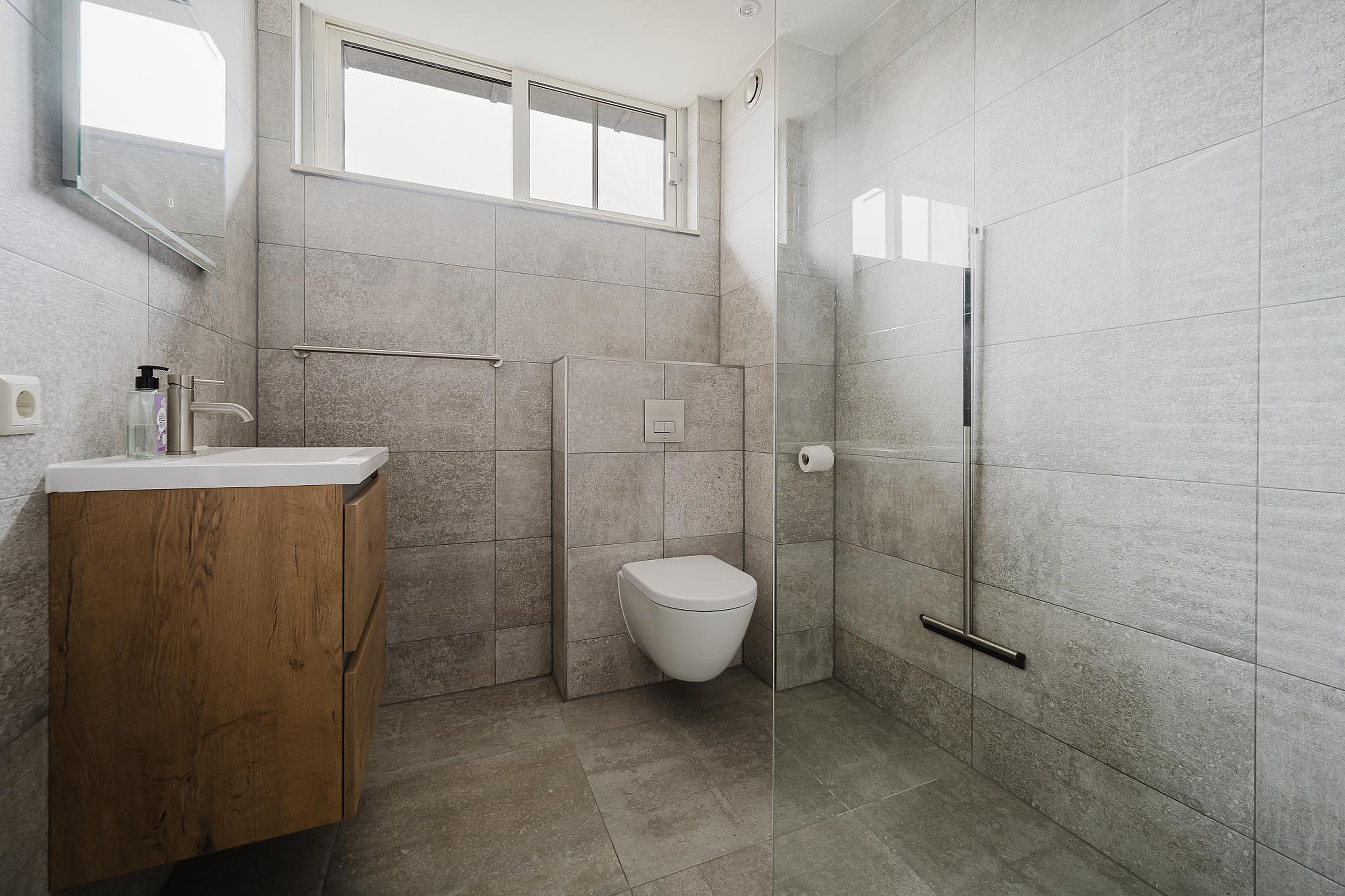 De luxe badkamer (2024) is modern afgewerkt en voorzien van een inloopdouche, toilet, wastafel met meubel, mechanische ventilatie en een raam.