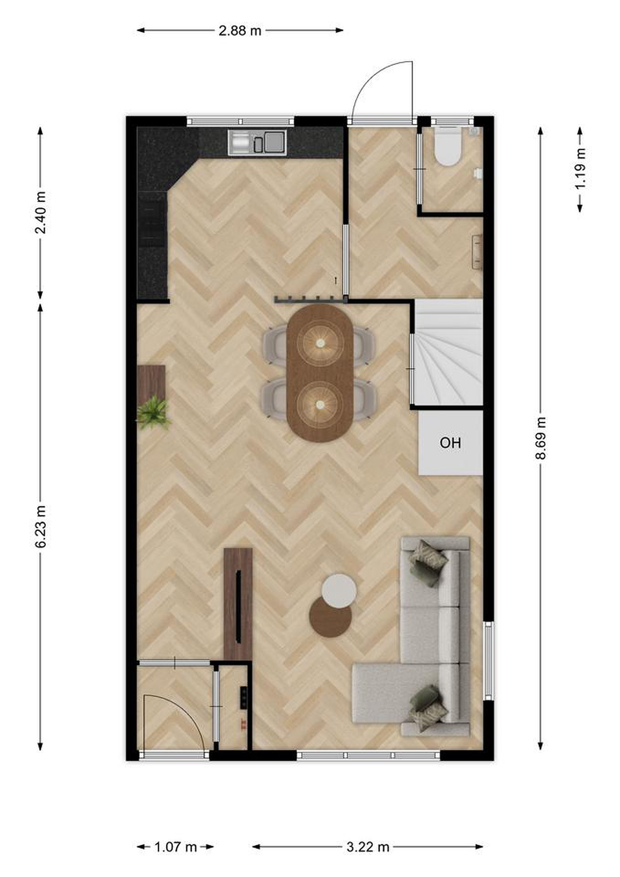 De woonkamer is ruim en licht dankzij de hoekligging en het extra zijraam. De ruimte is strak afgewerkt met een PVC vloer en voorzien van vloerverwarming.