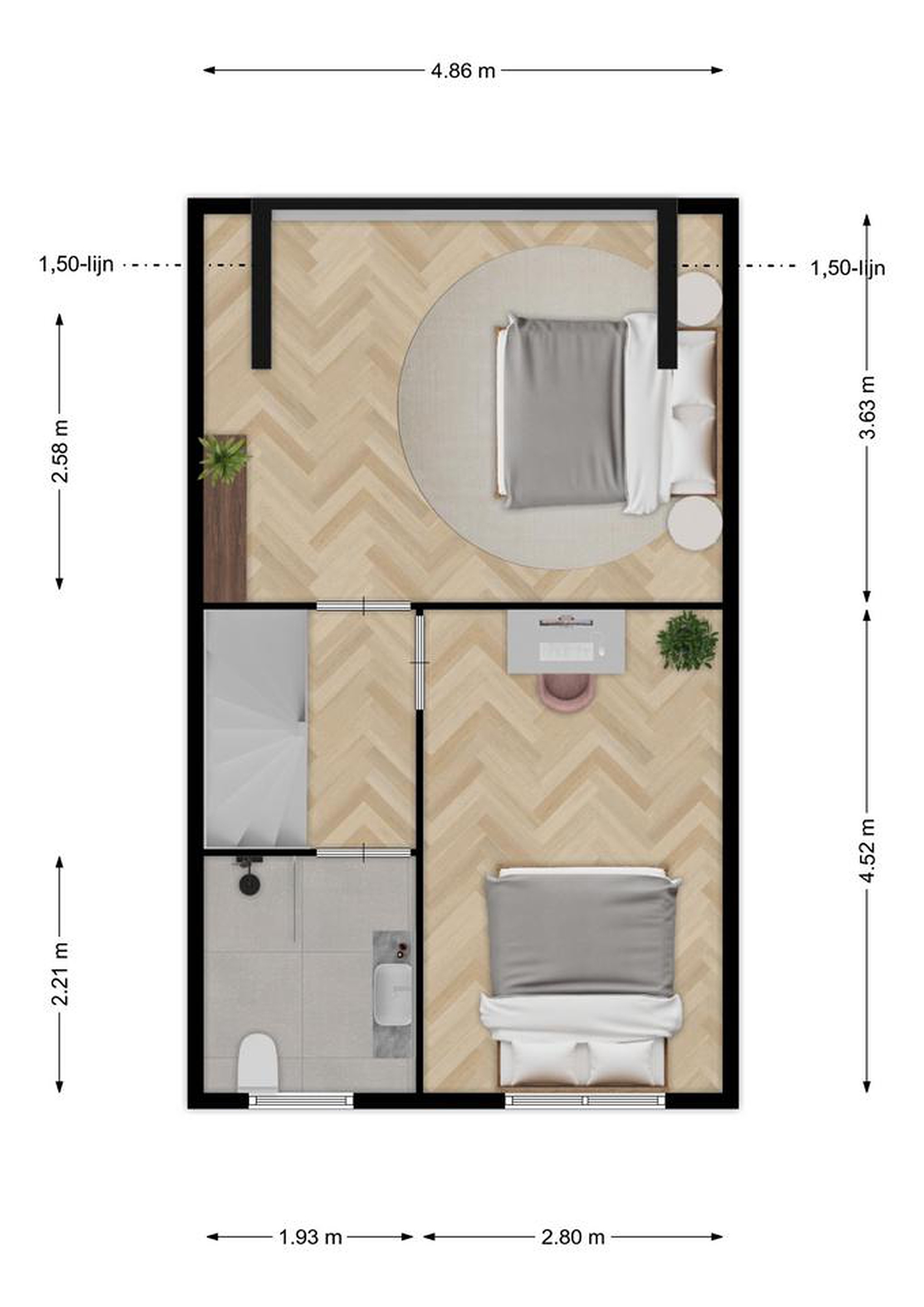 Op de eerste verdieping bevinden zich twee ruime slaapkamers.