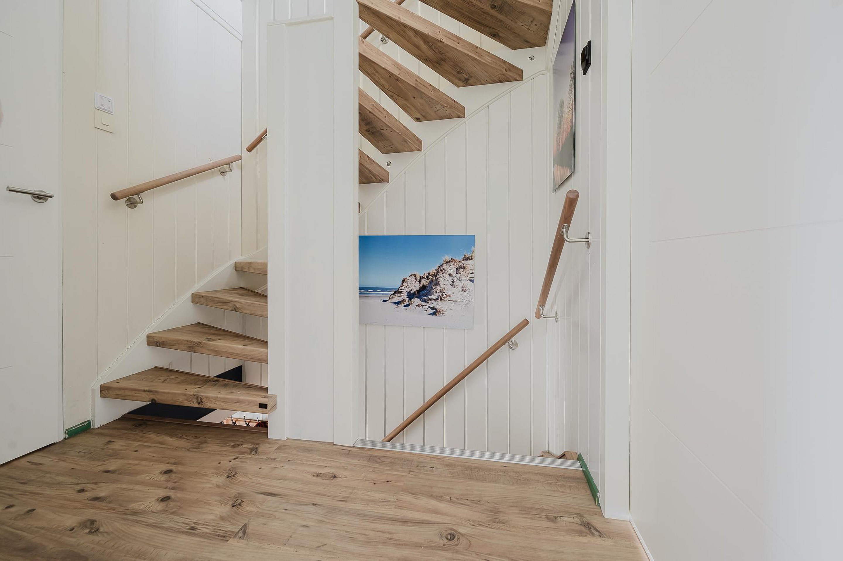 Via de keuken bereik je de tweede hal met de trapopgang, het moderne toilet (2024) en de toegang tot de achtertuin.
