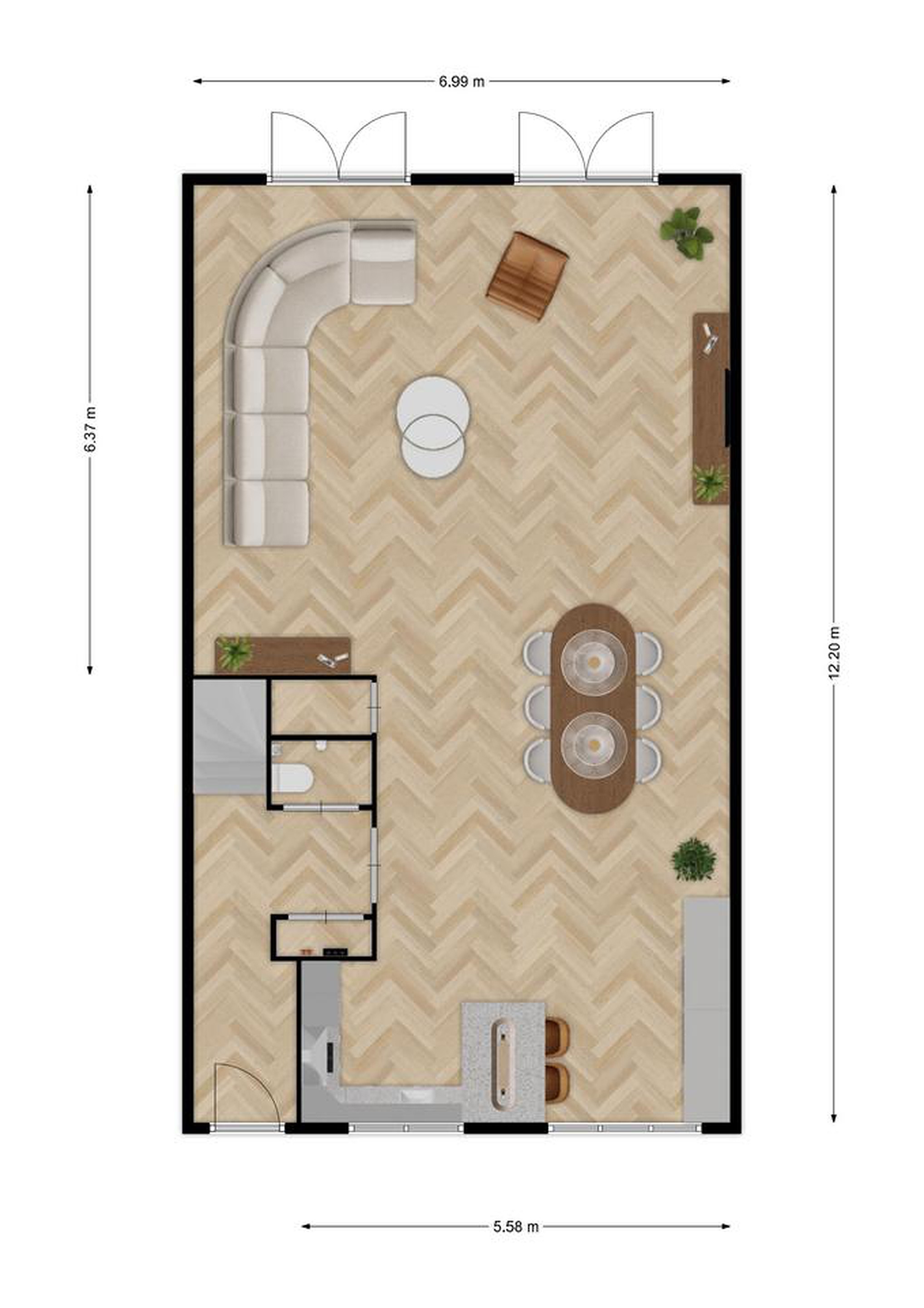 Aan de achterzijde bevindt zich de royale woonkamer met een strakke marmergrind gietvloer en volledige vloerverwarming. Dankzij de openslaande deuren aan twee zijden stap je direct de tuin in, wat zorgt voor een fijne verbinding tussen binnen en buiten.