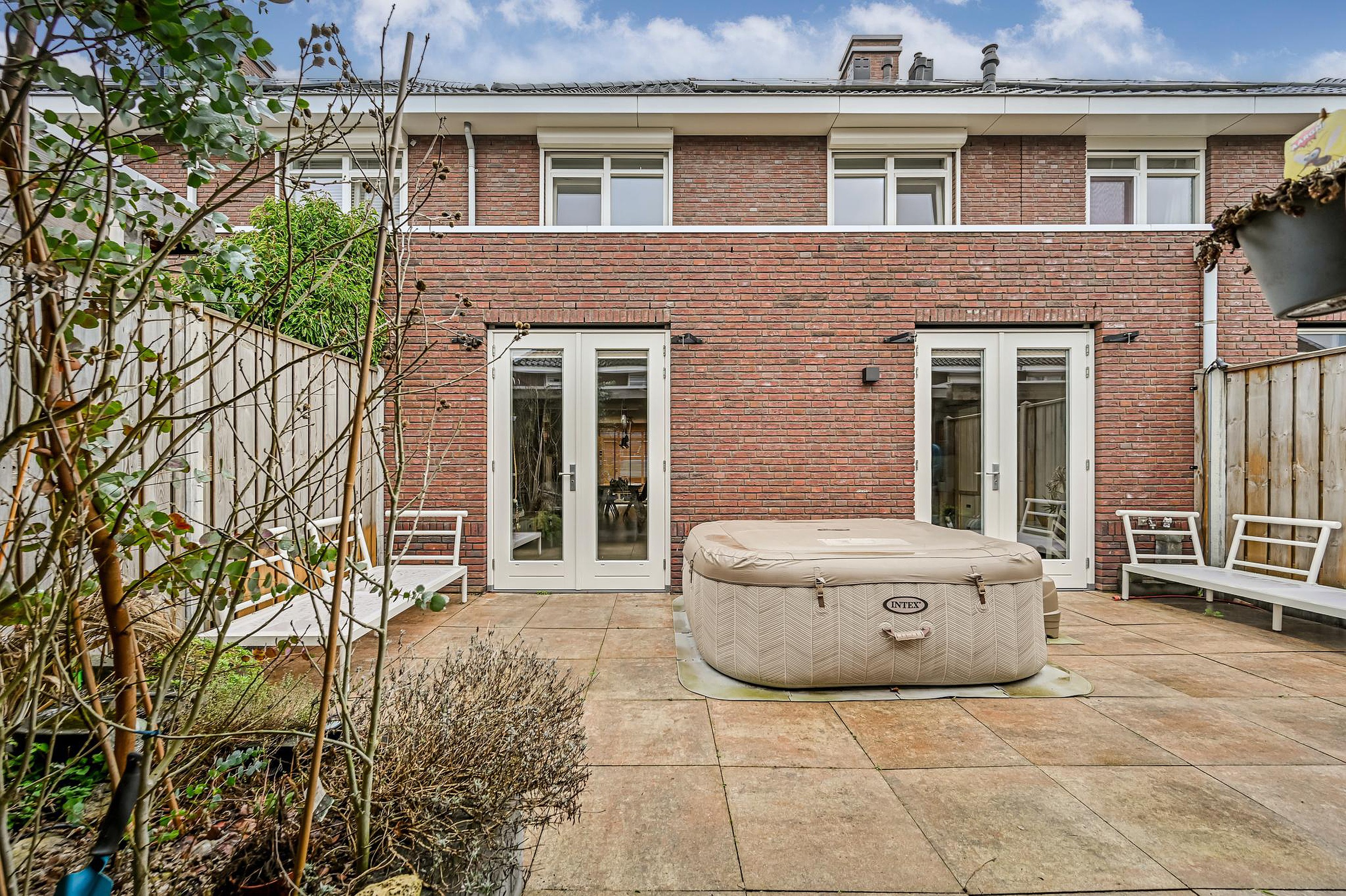 De tuin is gelegen op het zuidwesten, volledig betegeld en voorzien van een overkapping, een vergrote schuur en een achterom, een heerlijke plek om tot in de avond van de zon te genieten.