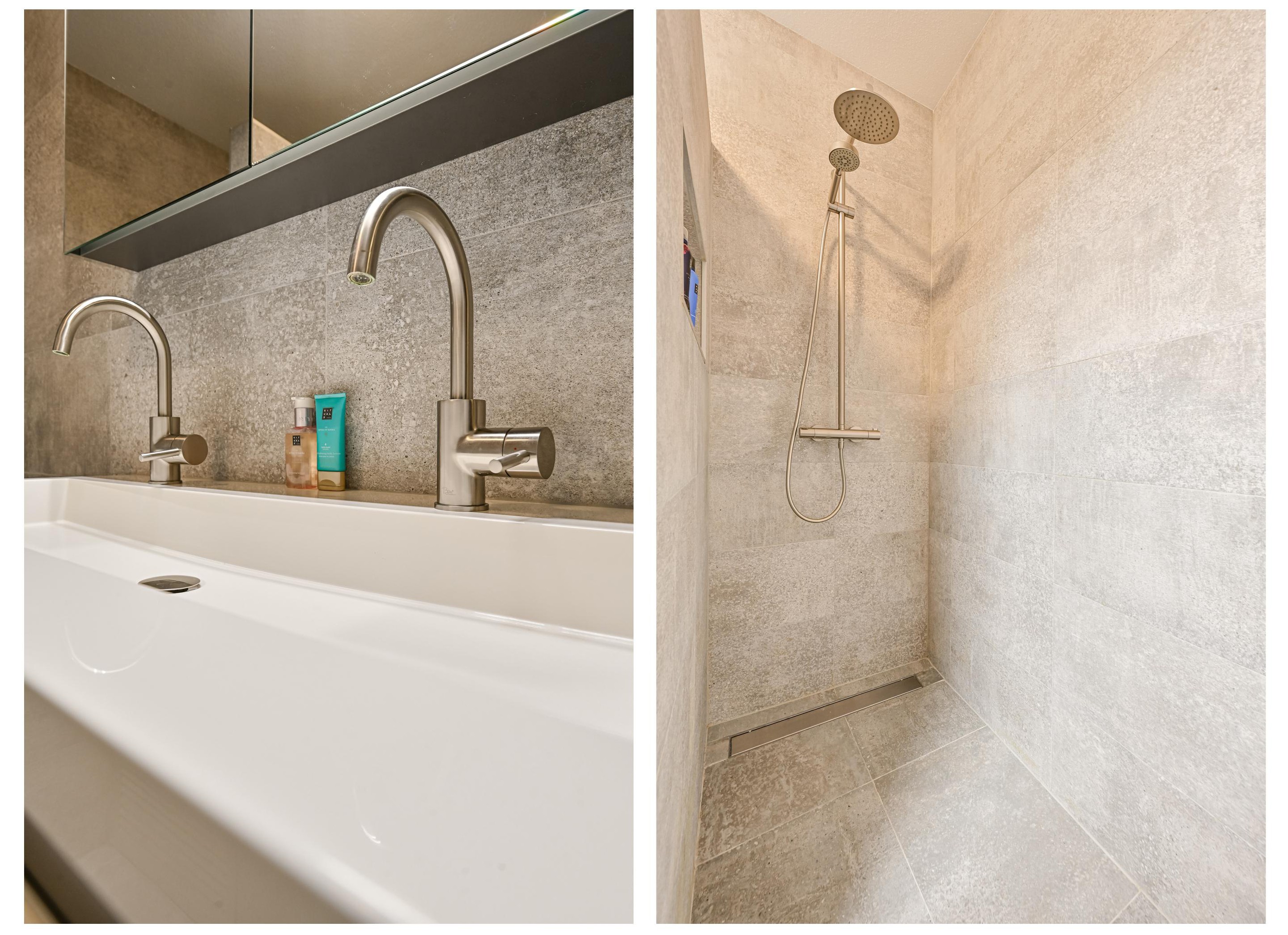 De badkamer is modern en compleet uitgevoerd met vloerverwarming, mechanische ventilatie, een ruime inloopdouche, een ligbad met bubbelfunctie en een dubbele wastafel met meubel.