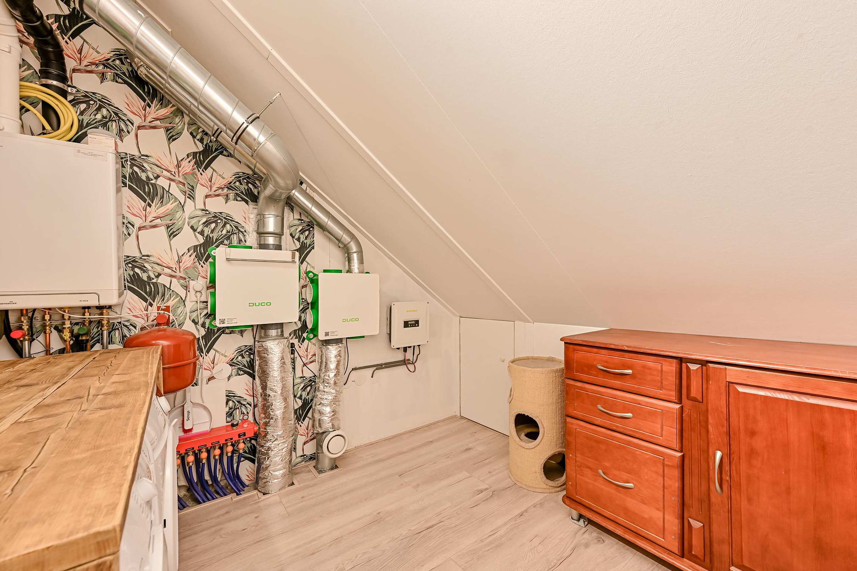Op deze verdieping bevindt zich tevens de wasruimte met wasmachineaansluiting, plek voor een droger, de cv-installatie (2018), de omvormer van de zonnepanelen en de unit voor mechanische ventilatie.