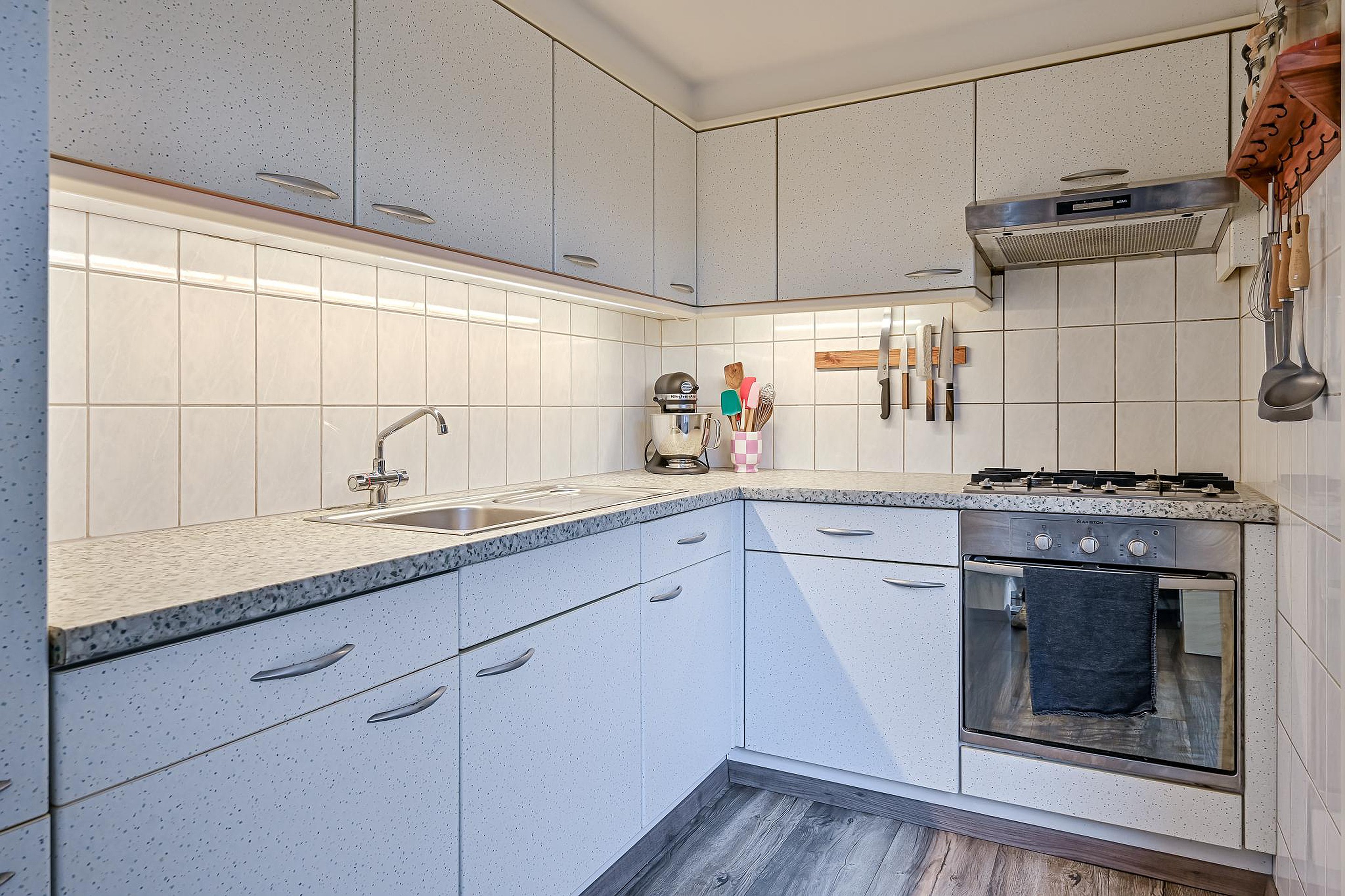 De keuken is gesitueerd aan de achterzijde van de woning en biedt direct zicht op de tuin. De opstelling is praktisch ingedeeld en voorzien van een koelkast, een vaatwasser en een 4-pits gaskookplaat.