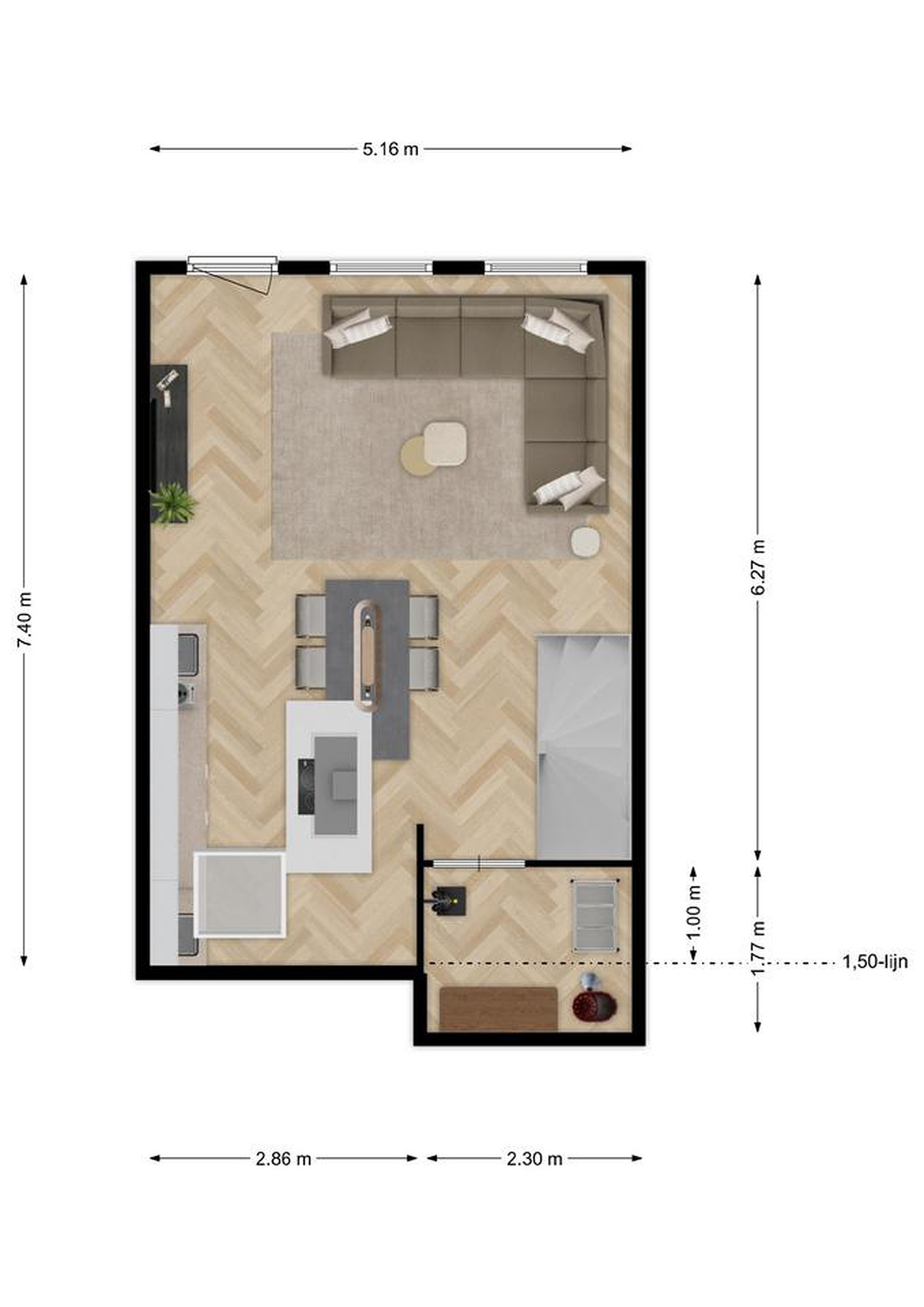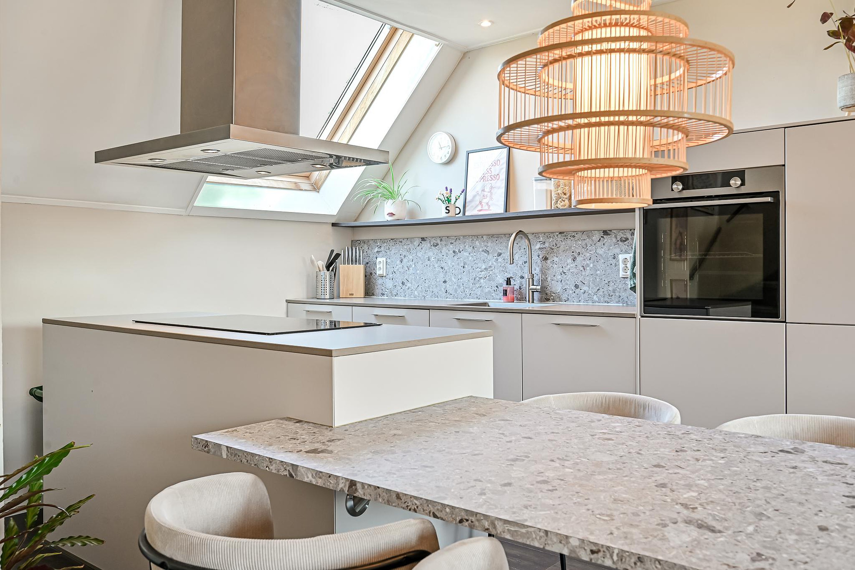 Op deze verdieping vind je ook de luxe keuken (2022). De keuken is een echte eyecatcher en uitgevoerd met een kookeiland, een 5-pits inductiekookplaat, composiet werkblad, Quooker 5-in-1 kraan en diverse inbouwapparatuur.