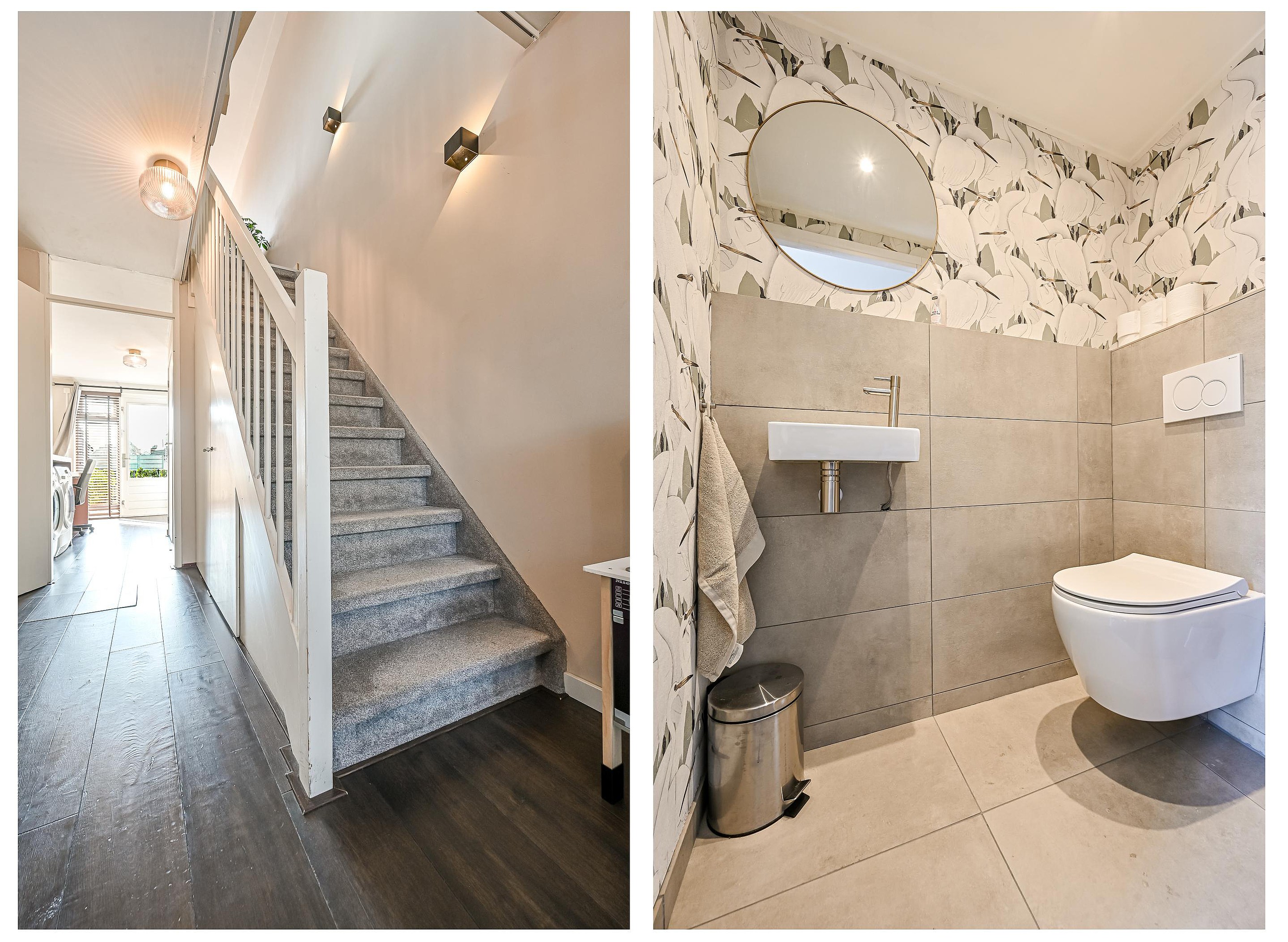 Via de ruime voortuin bereik je de entree van de woning. In de hal bevinden zich het toilet en de trapopgang. Daarnaast vind je hier slaapkamer 1, die momenteel ingericht als kantoor. In deze kamer bevindt zich tevens de wasmachineaansluiting en via hier heb je toegang tot de achtertuin.