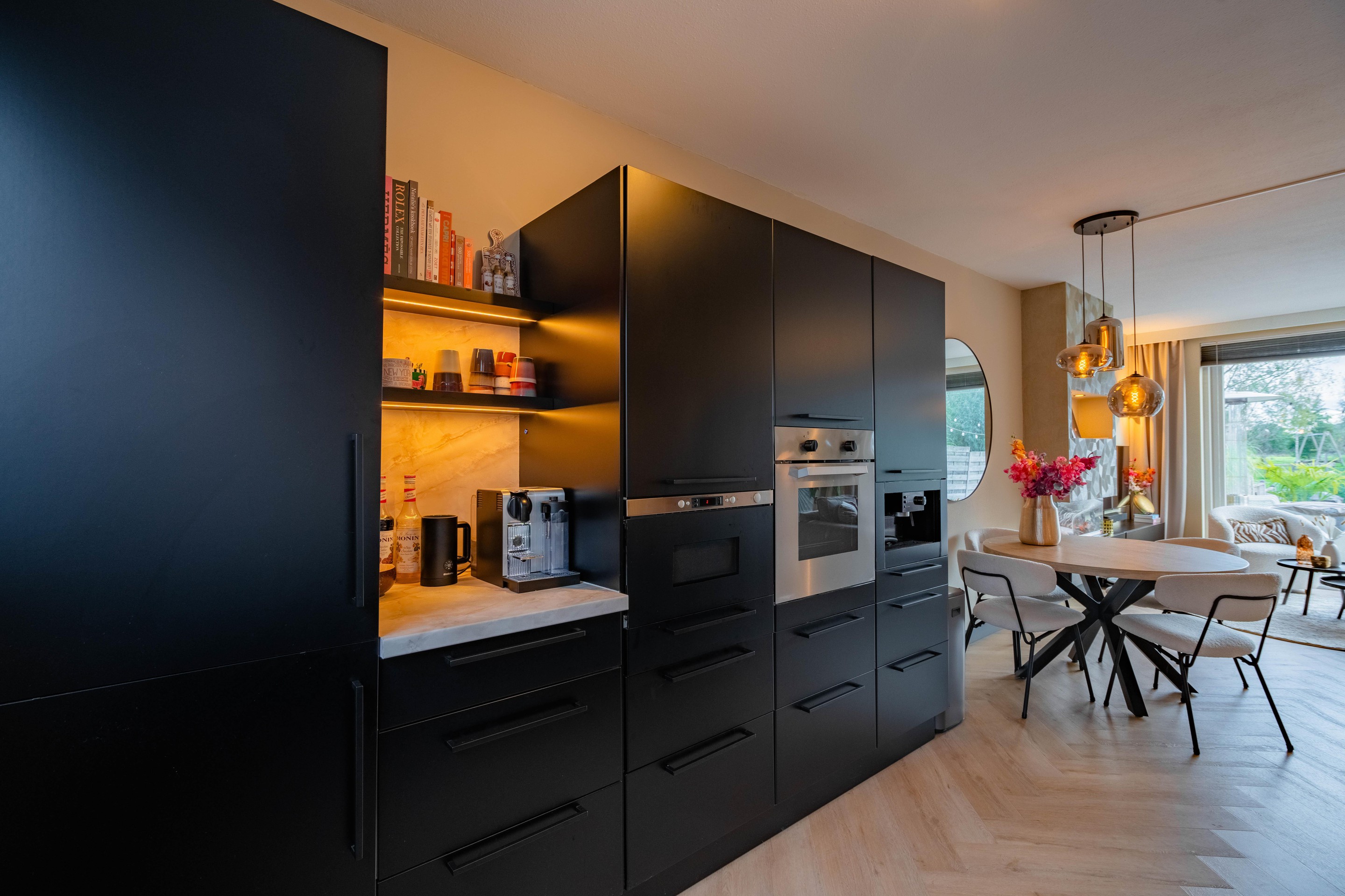 De open keuken bevindt zich aan de voorzijde en is uitgerust met inbouwapparatuur, een Quooker-kraan, koffiemachine en veel kastruimte.