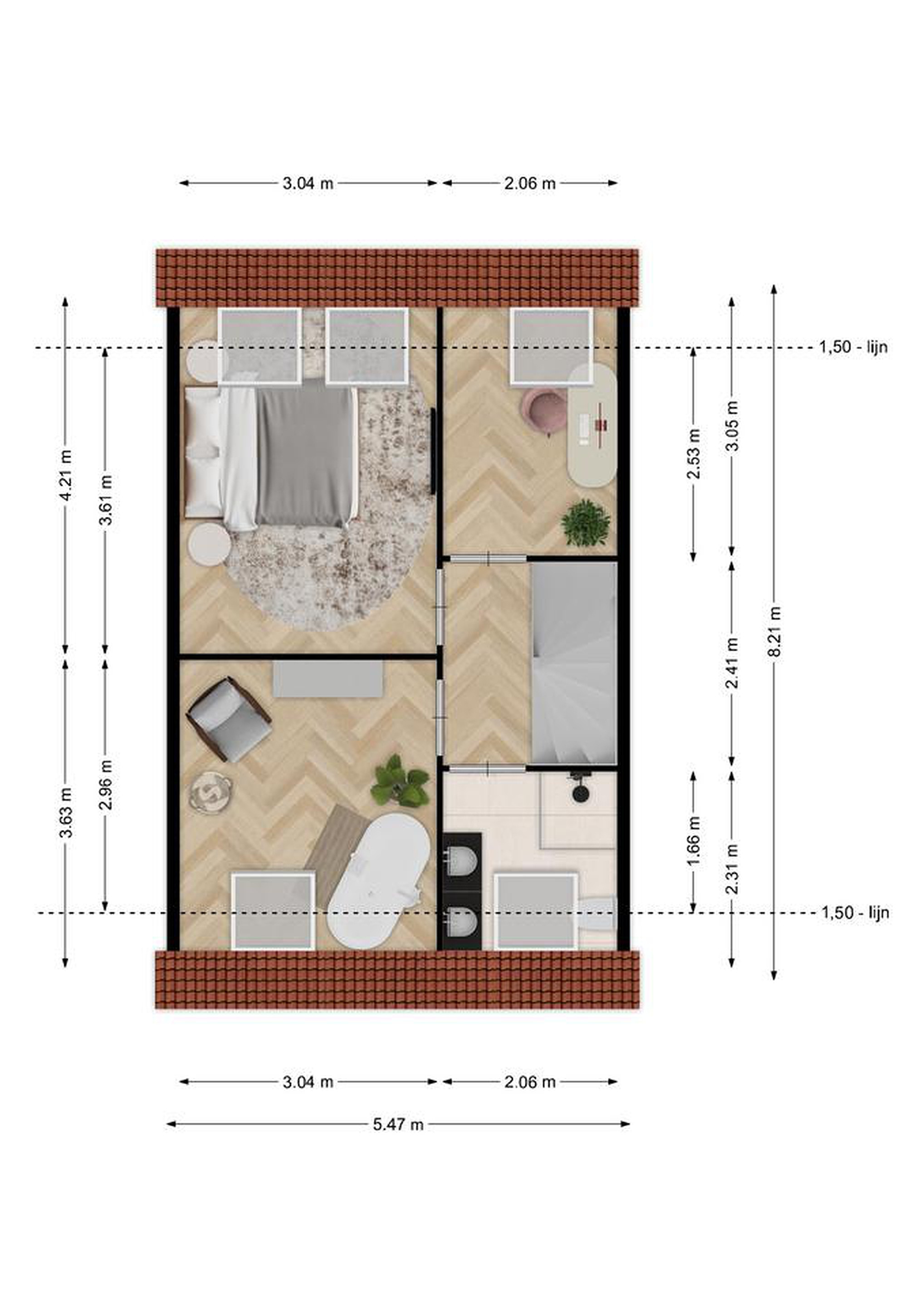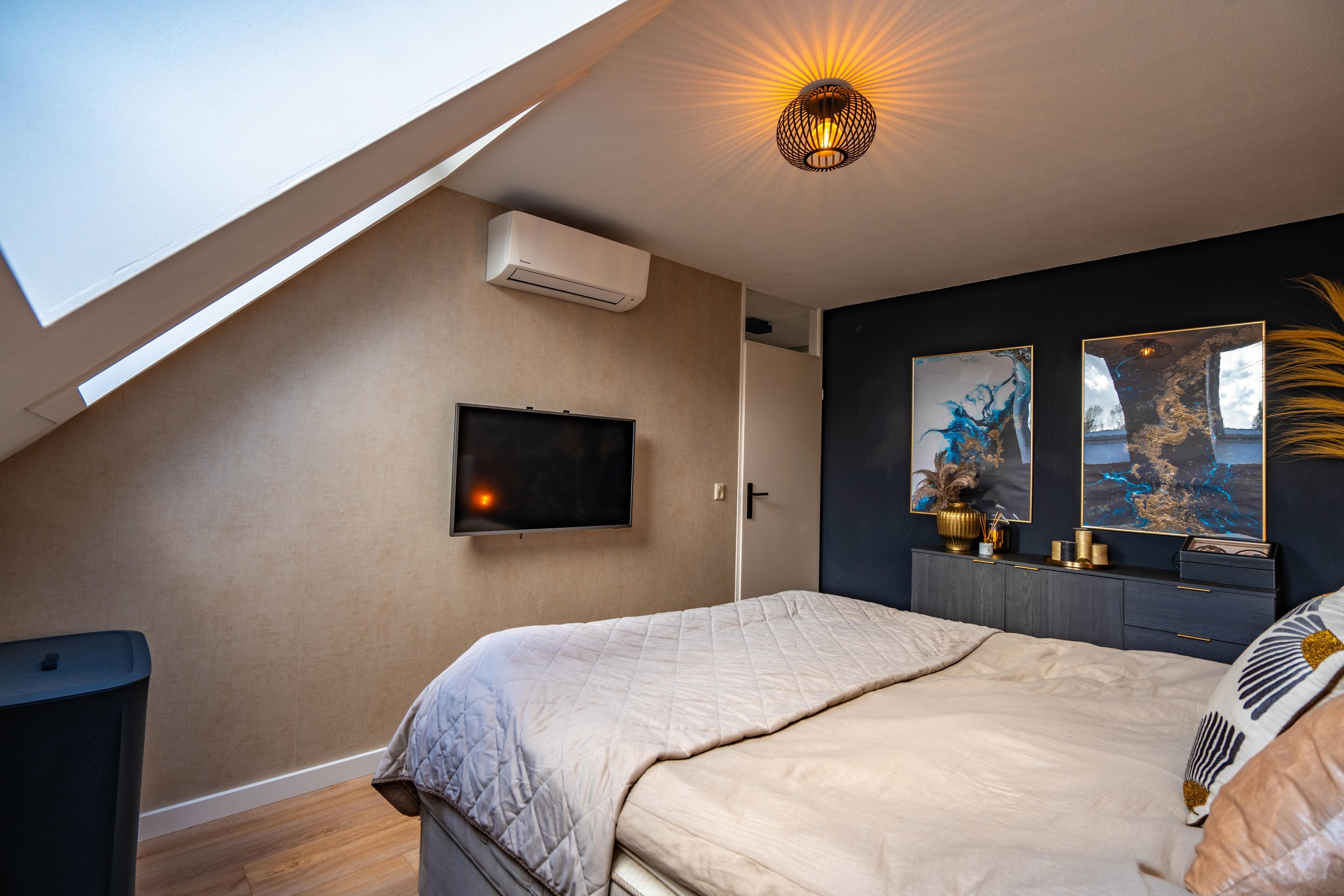 Via de trap bereik je de overloop met toegang tot drie slaapkamers. Eén van de slaapkamers is omgetoverd tot een luxe ruimte met een vrijstaand bubbelbad (2023), mechanische ventilatie en een dakraam.