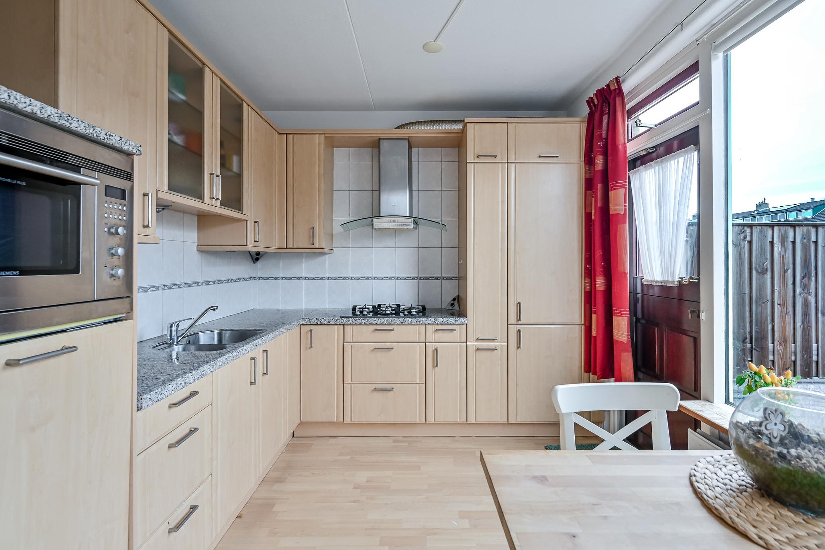 De ruime keuken in L-opstelling is voorzien van een 4-pits gaskookplaat, een hard stenen keukenblad, heeft een combi-oven, een koel-vriescombi en een vaatwasser.
