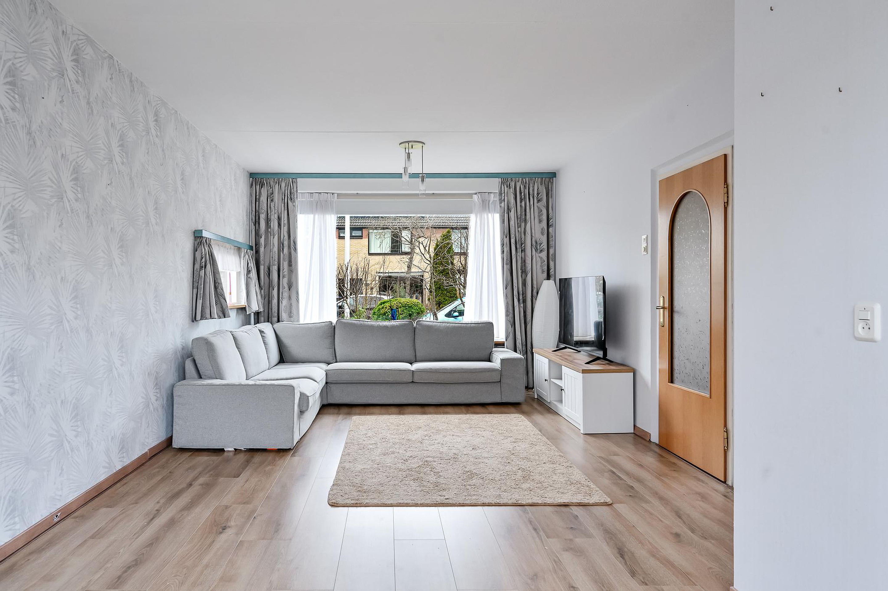 De lichte, ruime woonkamer met nieuwe vloer (2025) geeft toegang tot de keuken en de achtertuin.