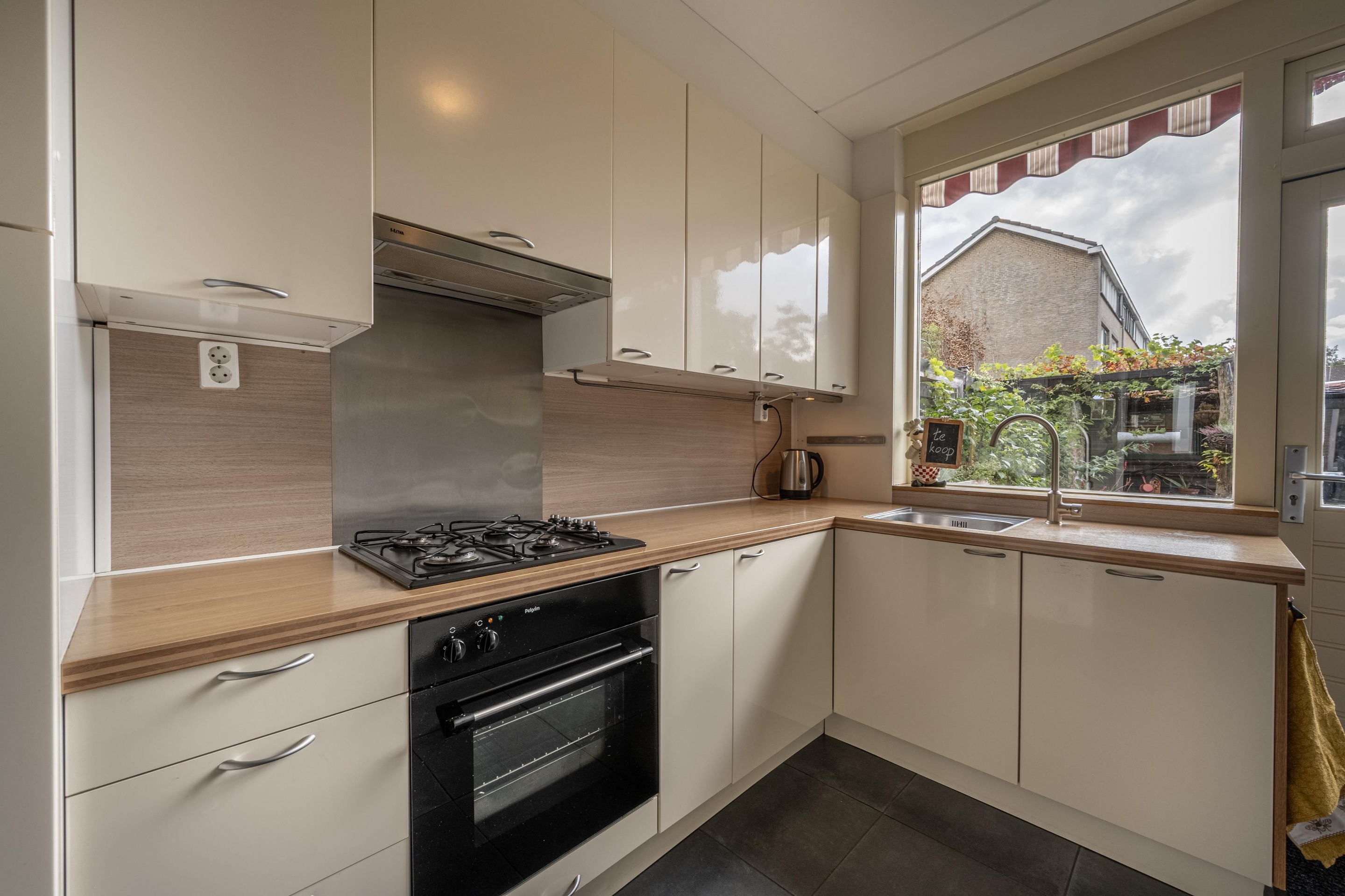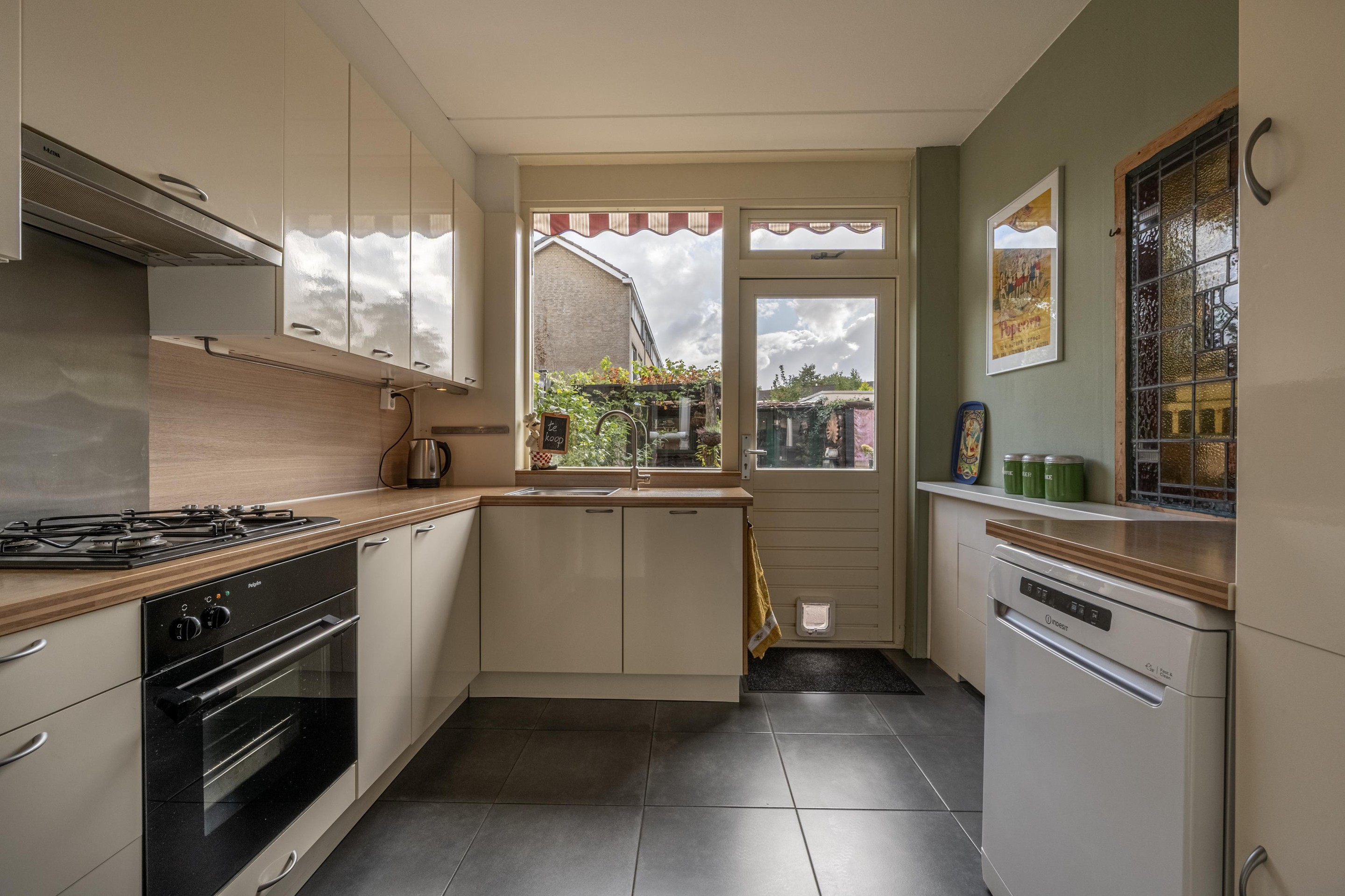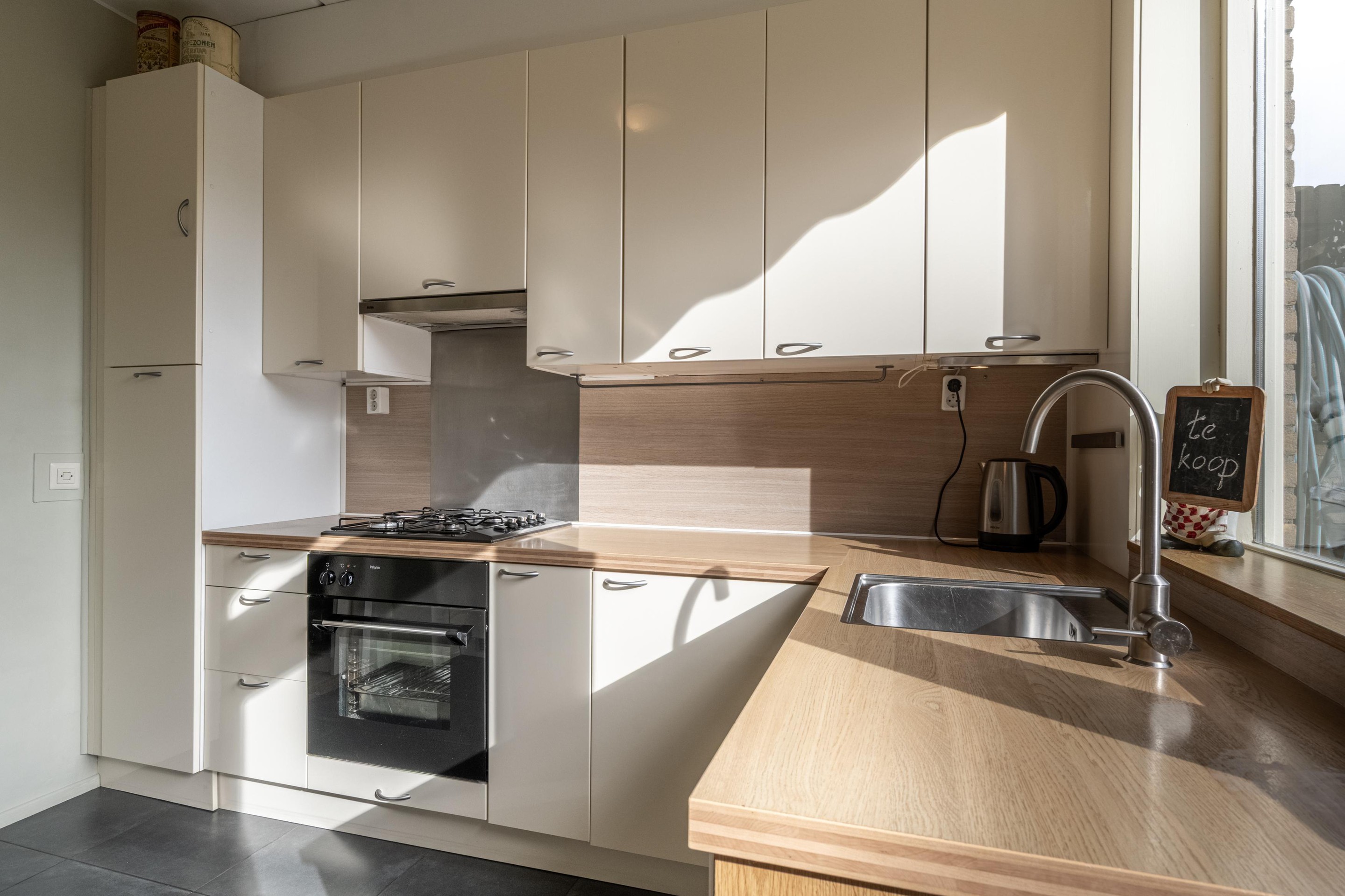 Aan de achterzijde vind je de keuken in hoekopstelling, compleet met alle gemakken zoals een oven, gasfornuis, afzuigkap, koelkast en vriezer. Extra leuk: er zit nog een kozijn richting de woonkamer dat nu dicht is, maar weer geopend kan worden – zo creëer je nóg meer licht en een open verbinding met de leefruimte. Vanuit de keuken stap je direct de achtertuin in, ideaal voor een zomerse barbecue of een kop koffie in de ochtendzon.