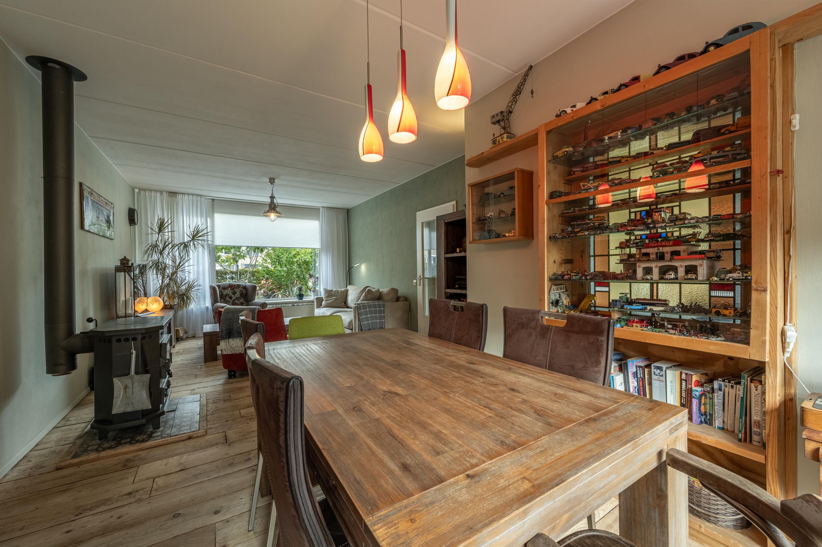 De doorzonwoonkamer is lekker licht en kijkt uit op de tuin. De aanwezigheid van een sfeervolle houtkachel zorgt voor extra warmte en gezelligheid in de wintermaanden.