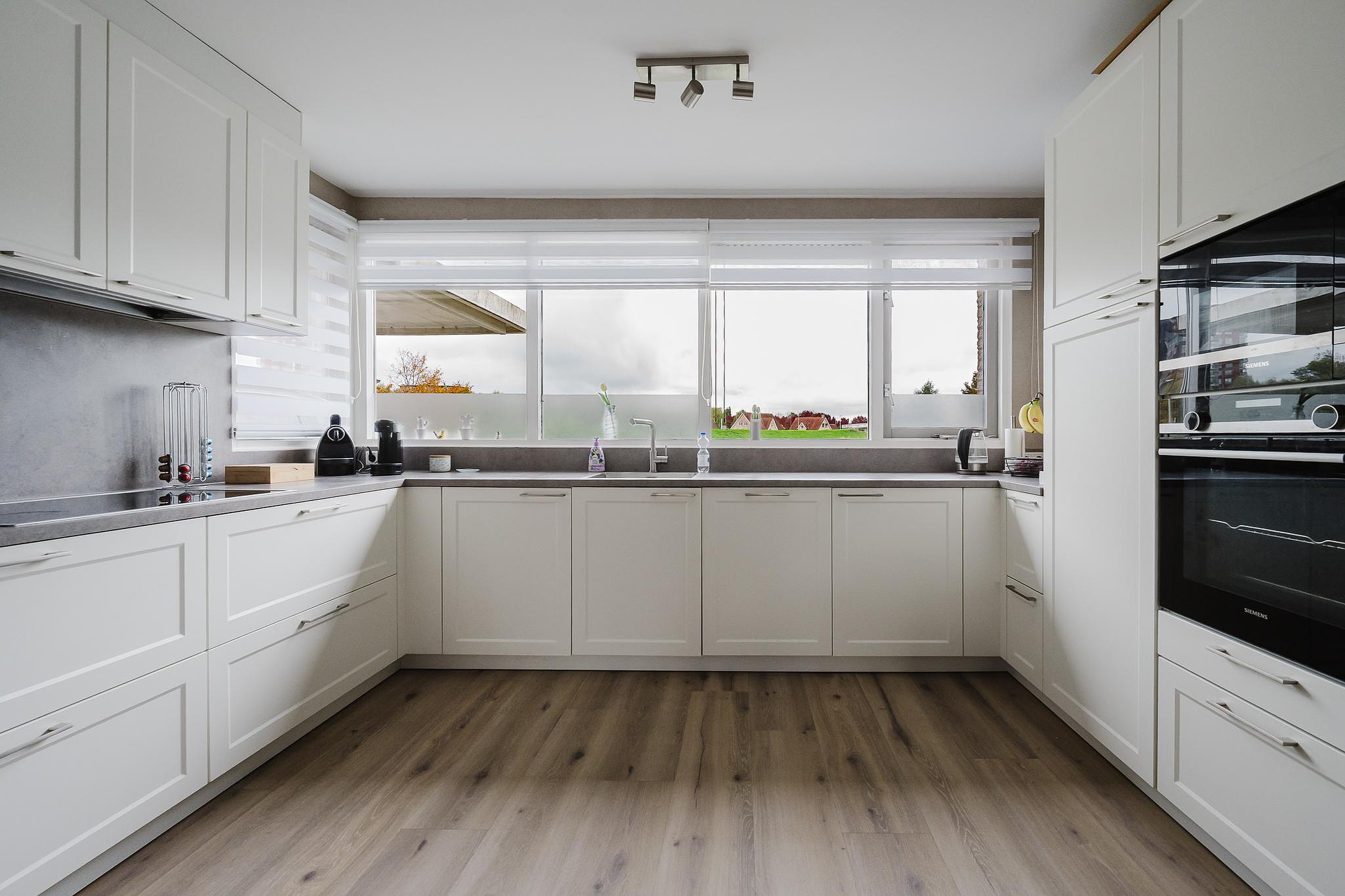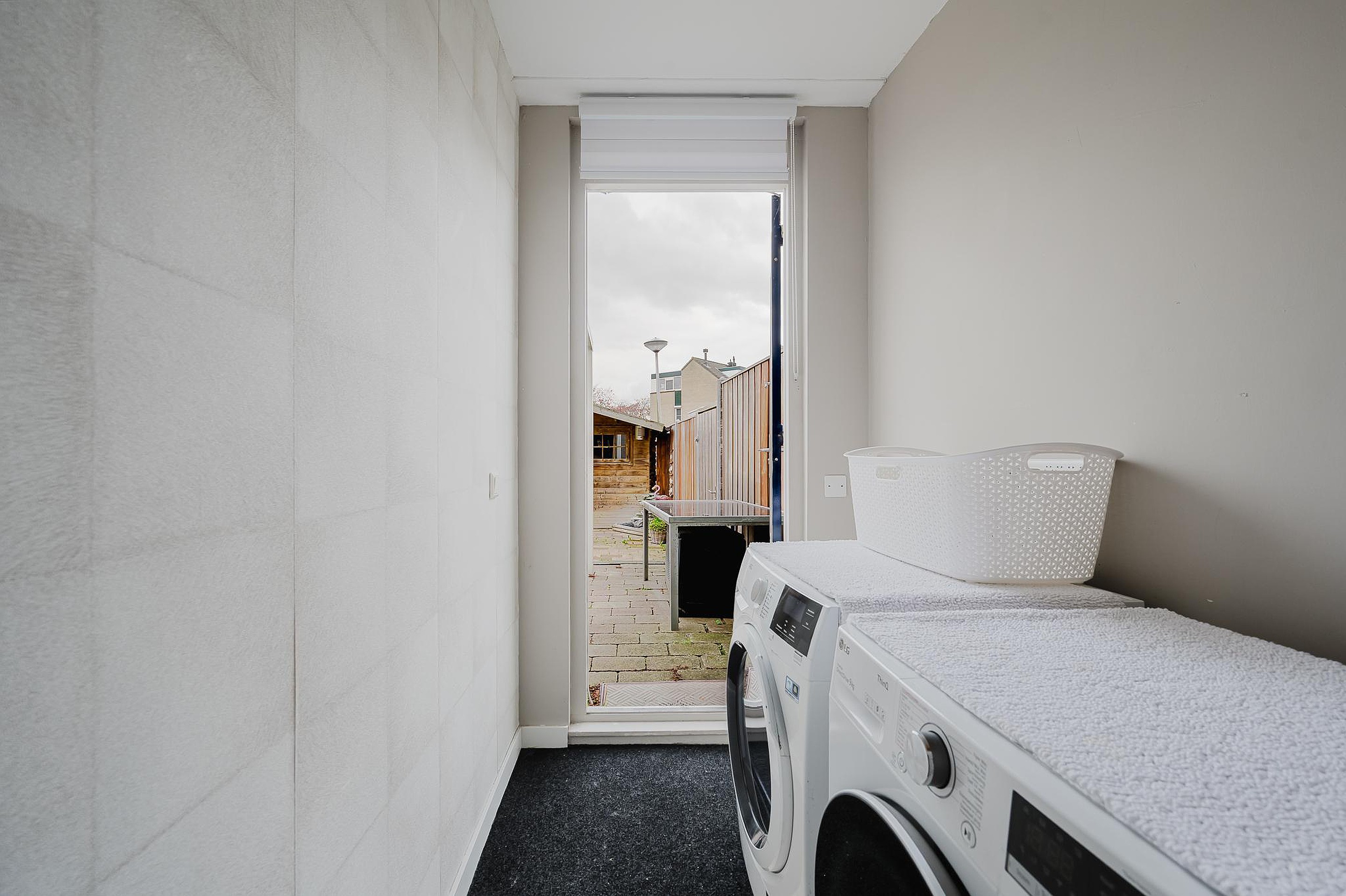 Vanuit de woonkamer is ook de extra wasruimte bereikbaar, met aansluitingen voor wasmachine en droger en directe toegang tot de tuin.