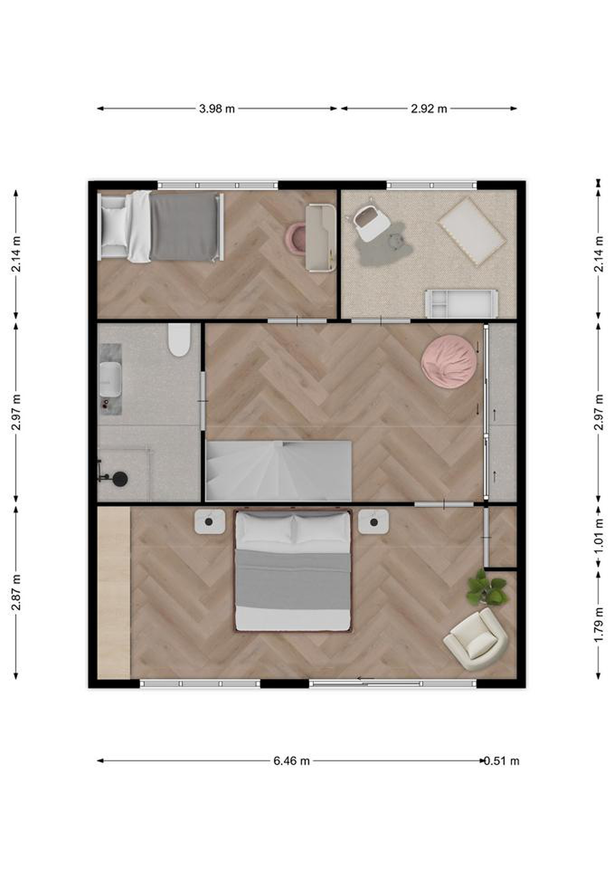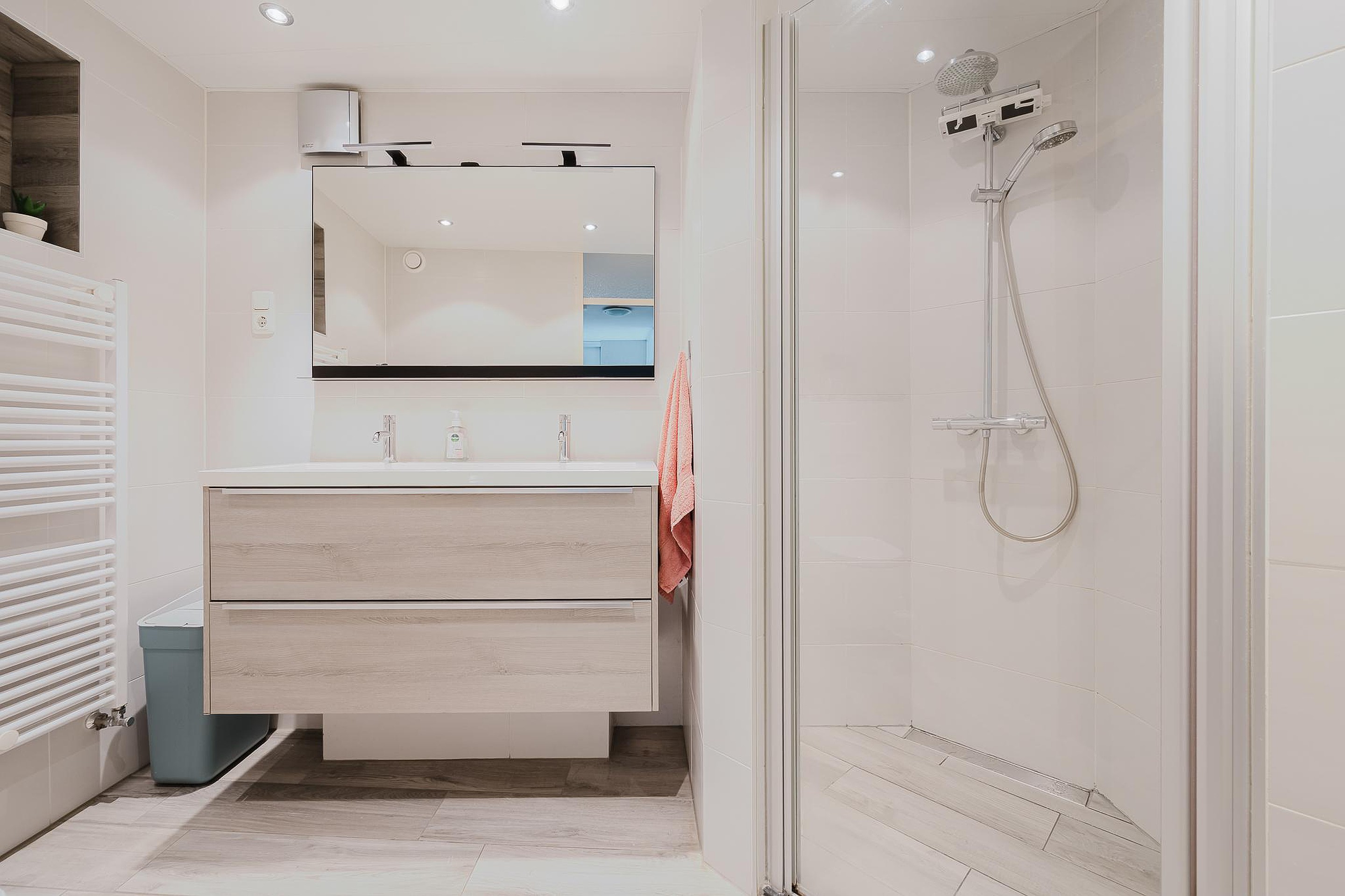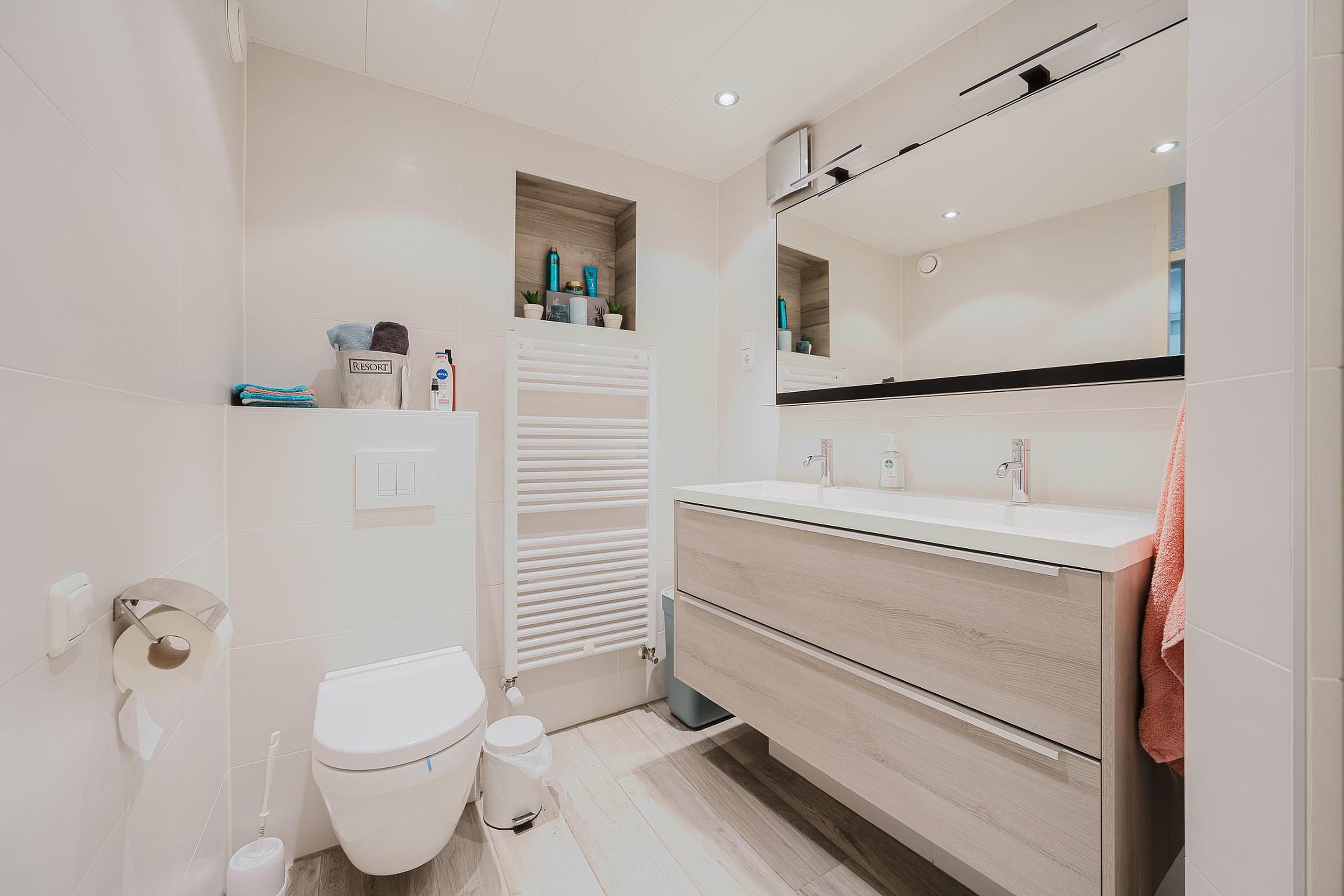 Op de eerste verdieping vind je drie slaapkamers: twee aan de voorzijde en de ruime master bedroom aan de achterzijde met een grote schuifpui naar het balkon. De moderne badkamer is voorzien van een inloopdouche, wastafelmeubel, toilet en mechanische ventilatie.